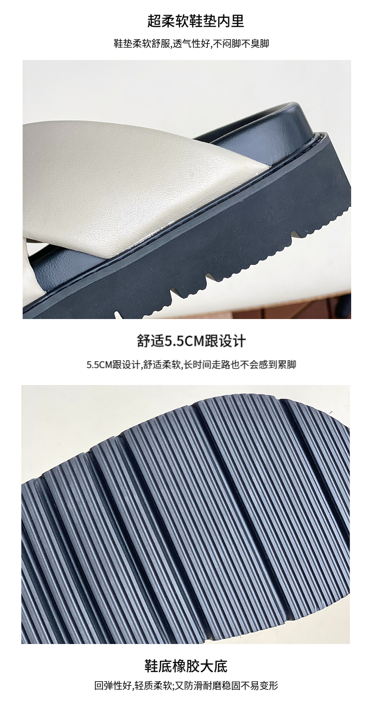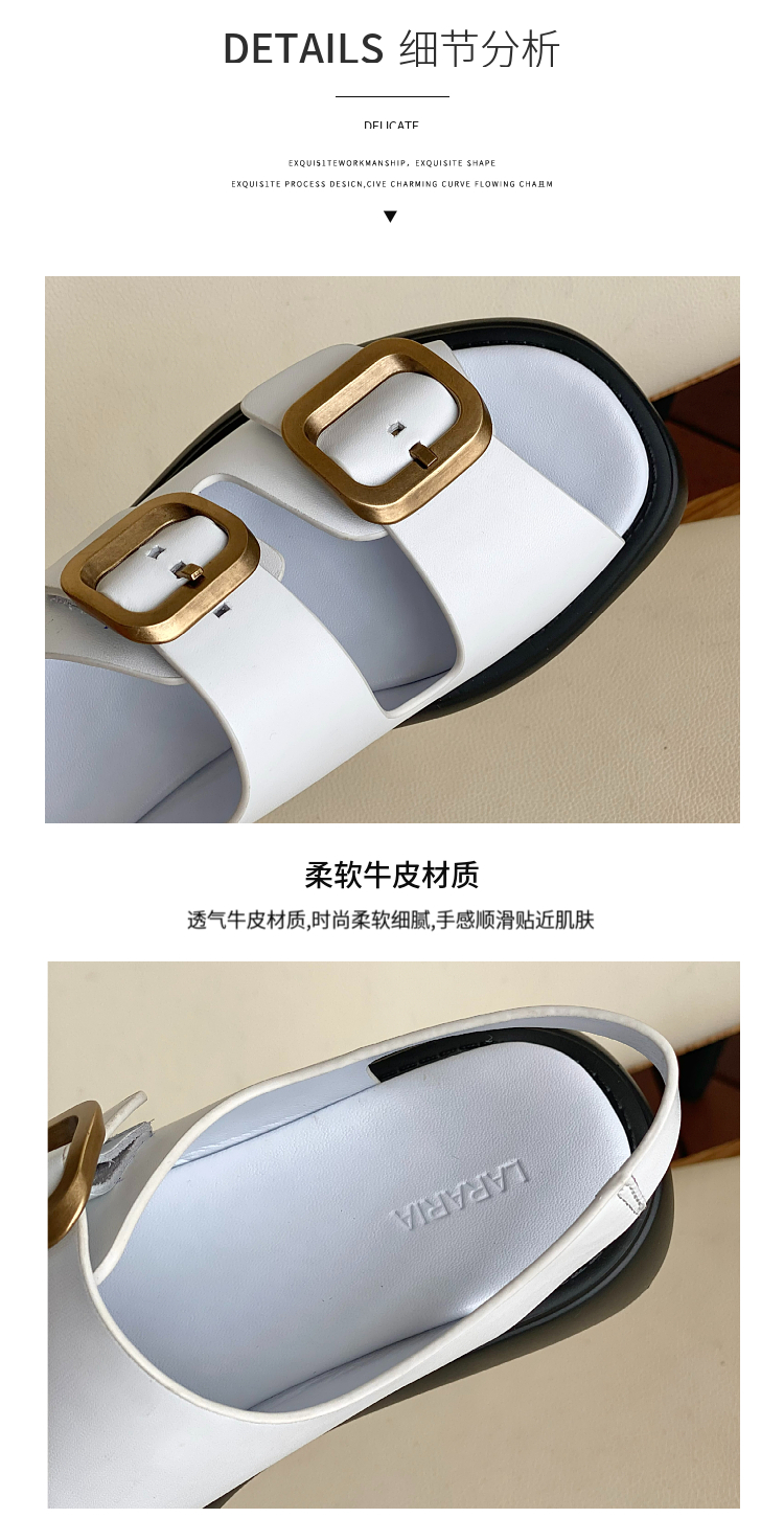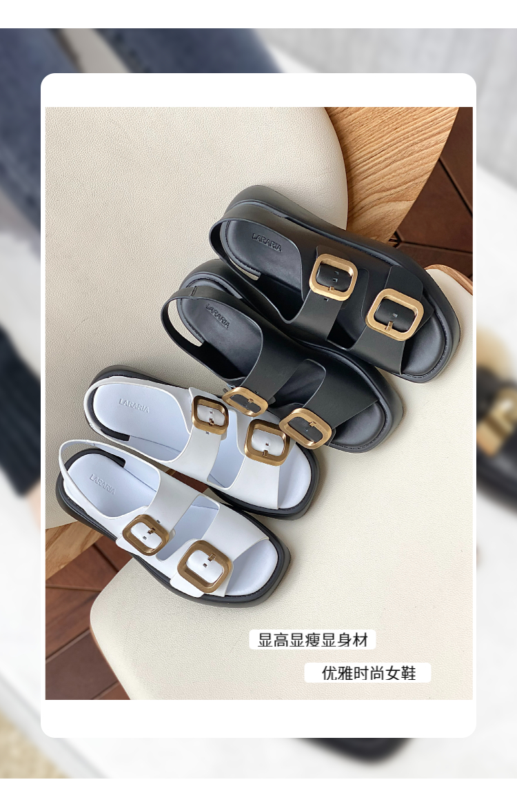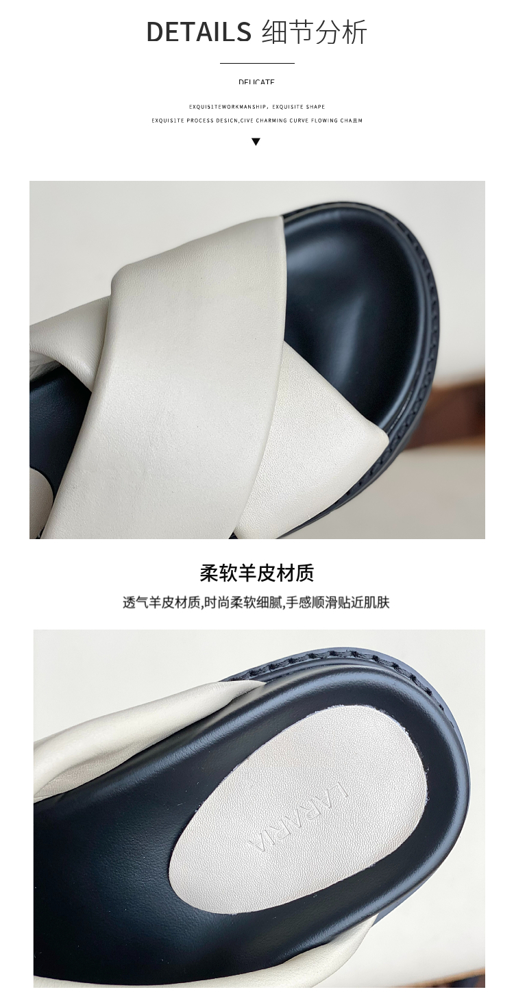 LARARIA羊皮交叉鞋面面包拖、金属扣凉鞋,松弛舒适精致慵懒,皮面材质搭配橡胶大底,拥有云朵包裹般的脚感,时尚吸睛自带复古气息,5.5cm鞋底隐形增高,鞋头3D防撞设计分散脚踝压力,轻便好穿又好搭