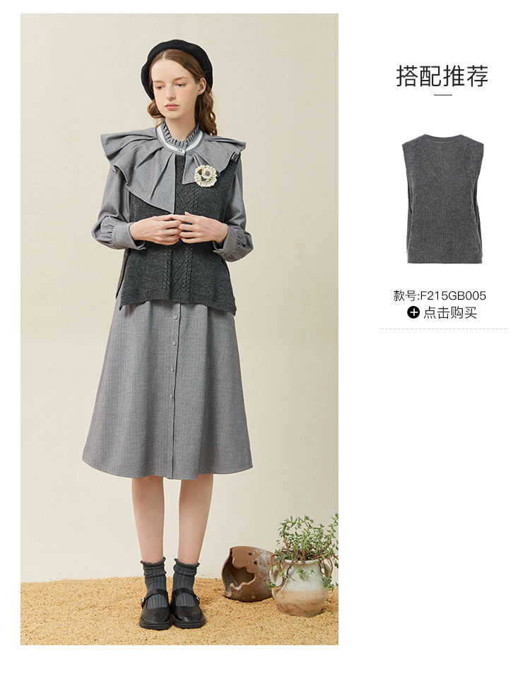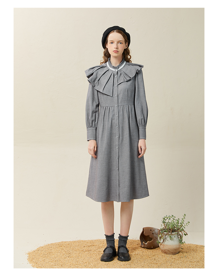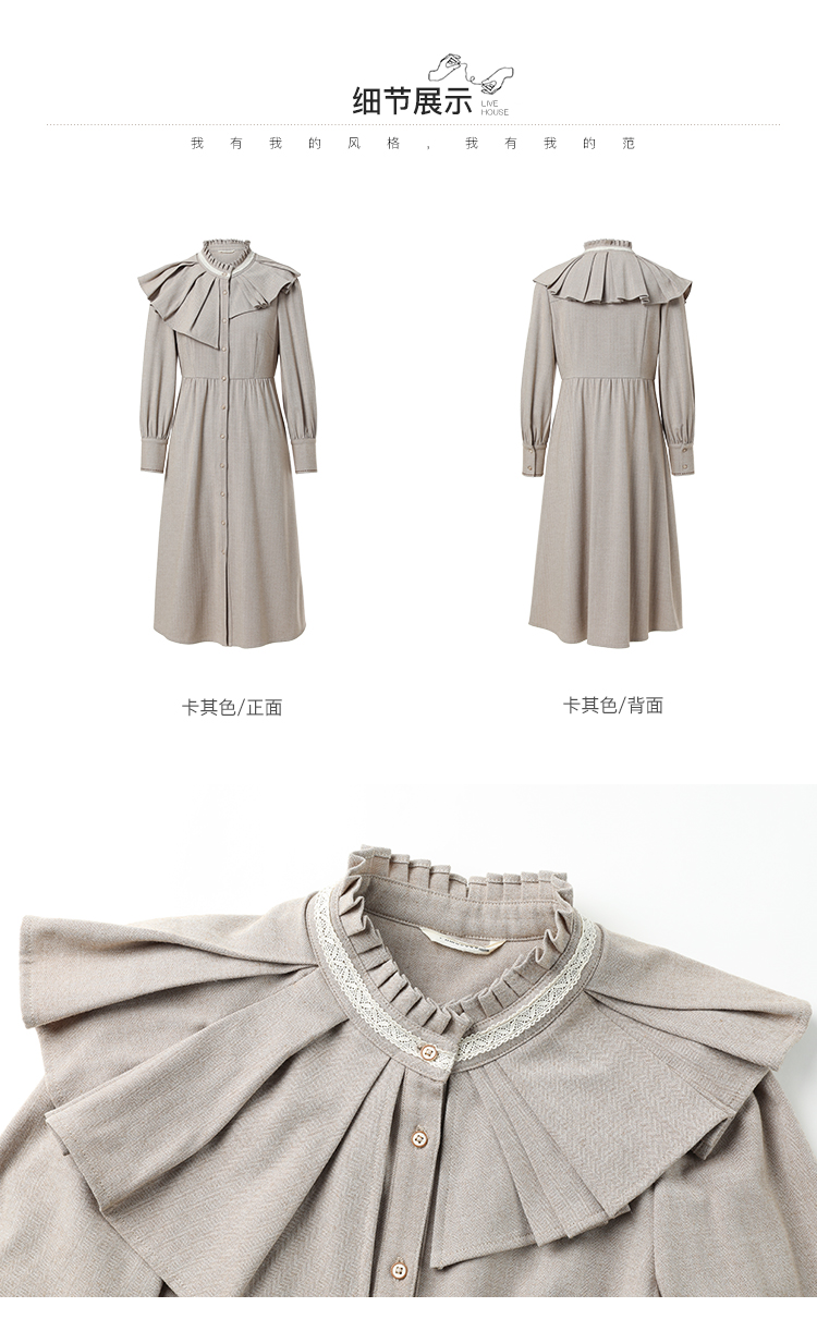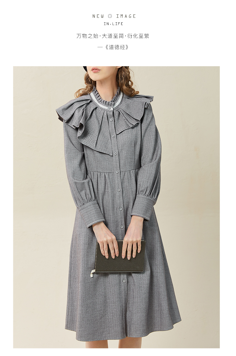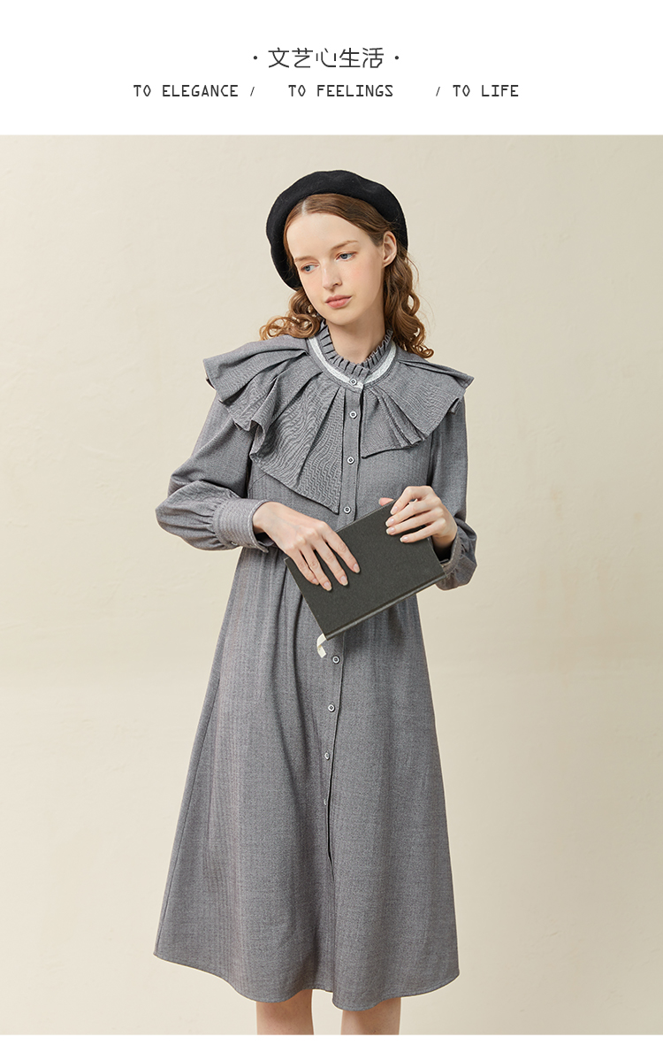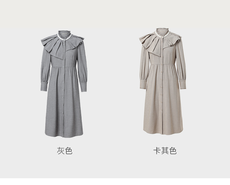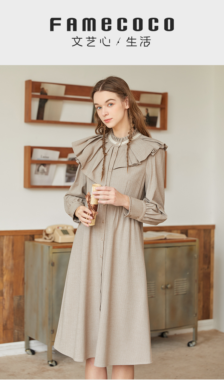 Famecoco范可儿长袖衬衫裙女设计感小众不对称娃娃领高腰连衣裙秋F228FA015