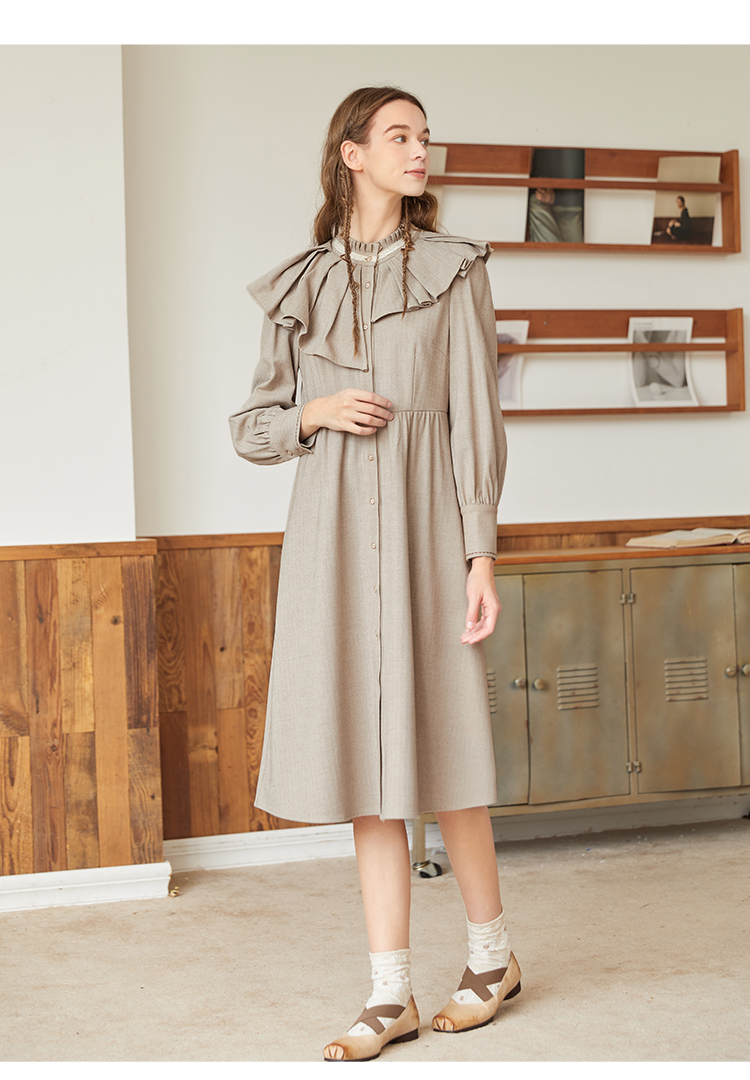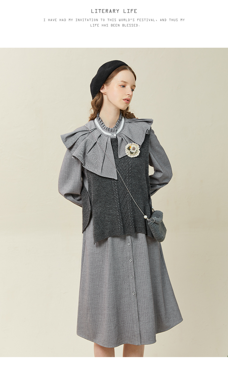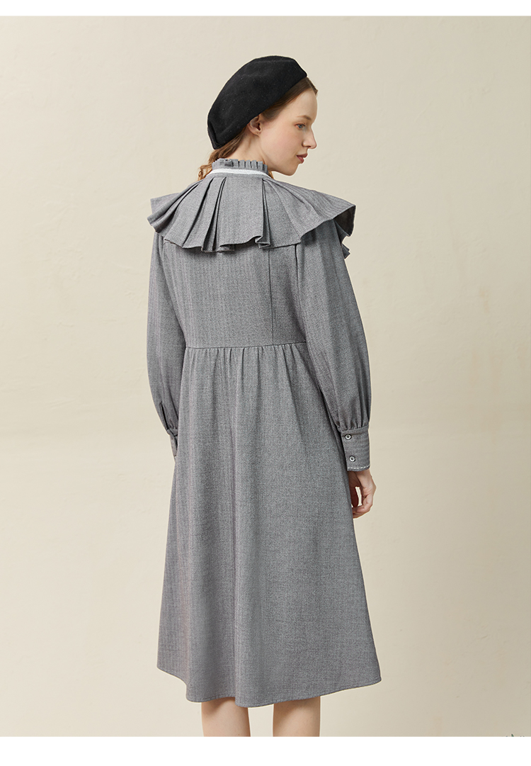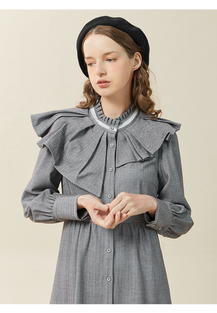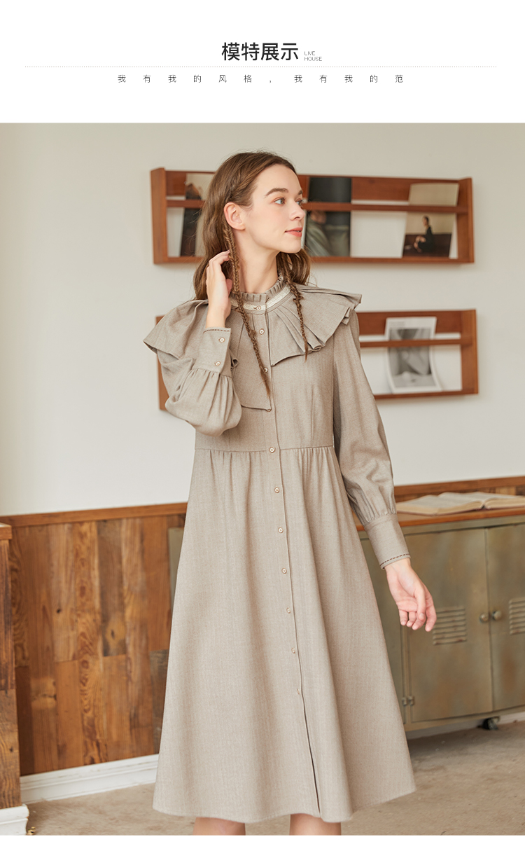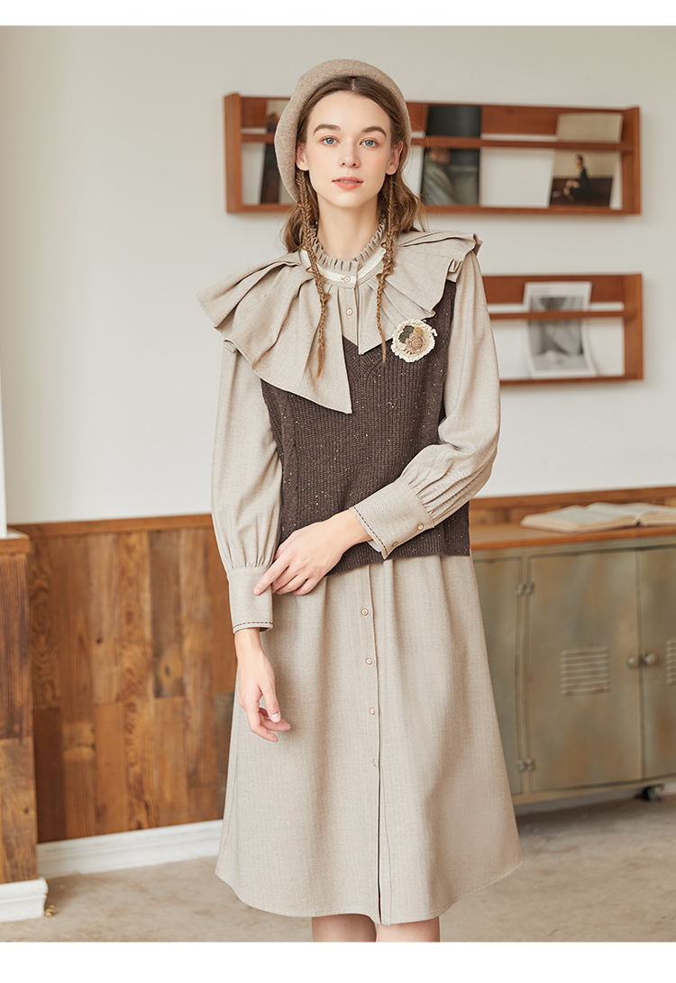 Famecoco范可儿长袖衬衫裙女设计感小众不对称娃娃领高腰连衣裙秋F228FA015