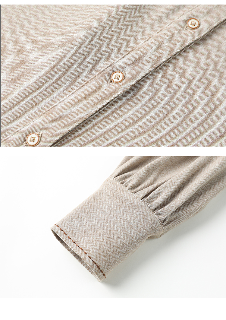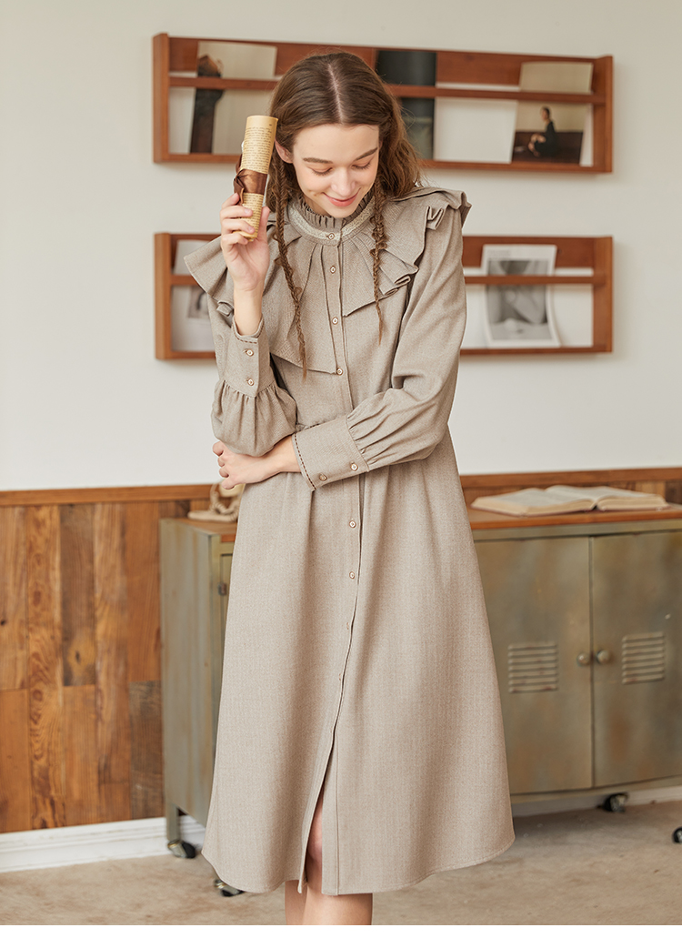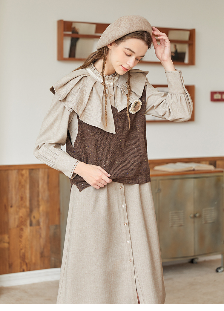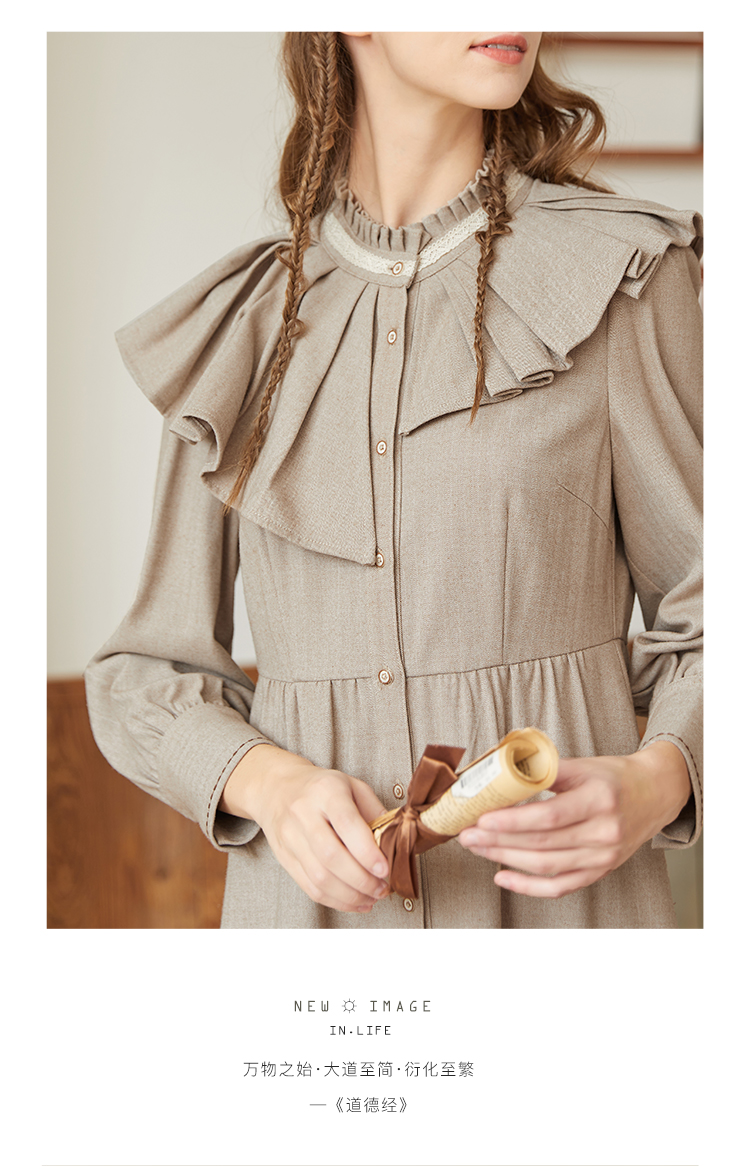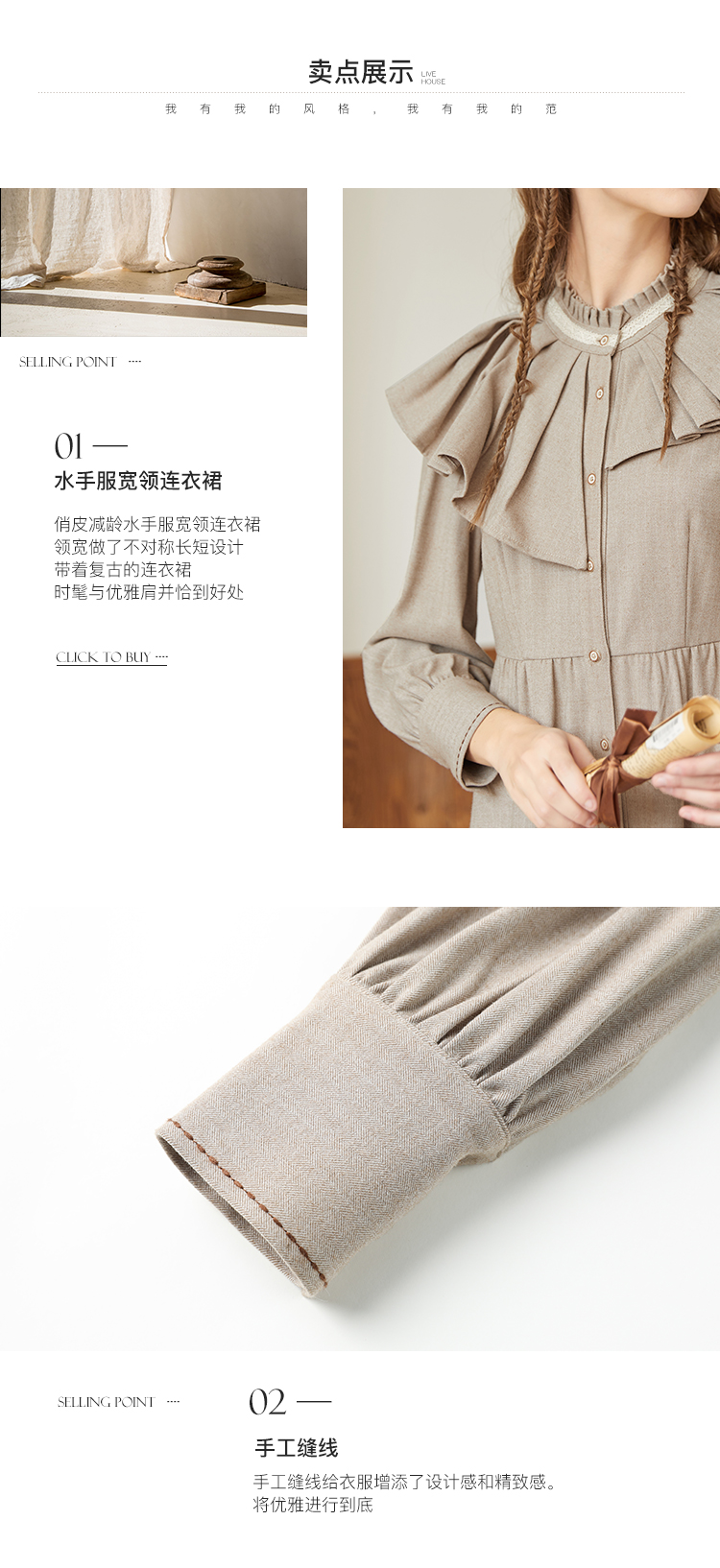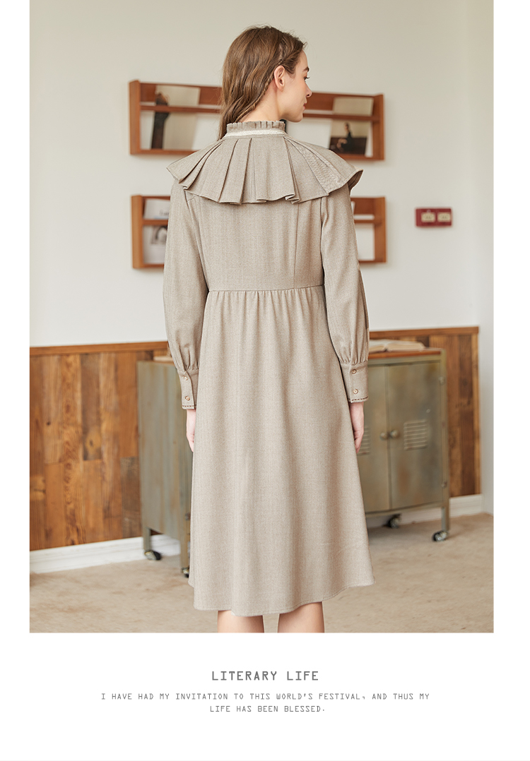 Famecoco范可儿长袖衬衫裙女设计感小众不对称娃娃领高腰连衣裙秋F228FA015