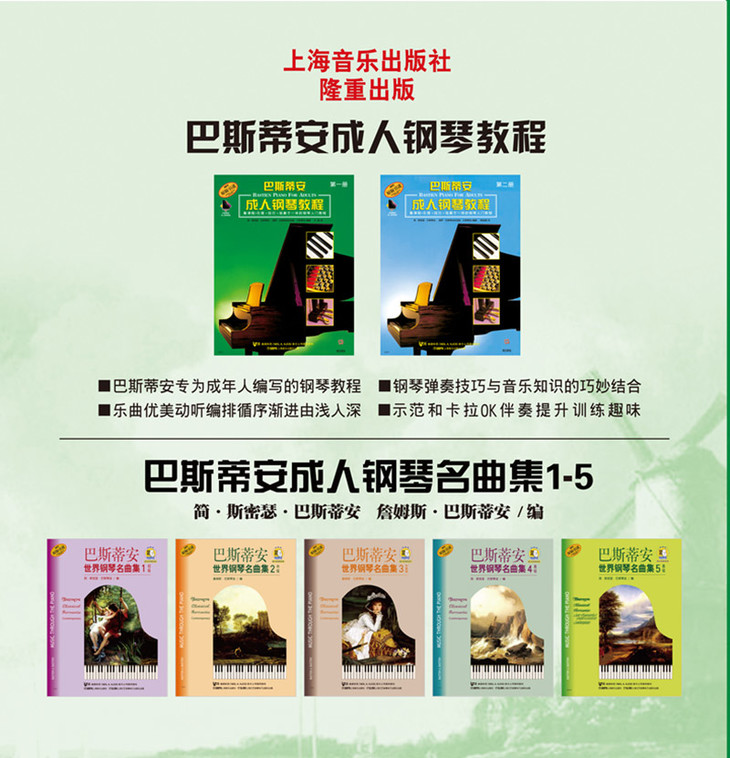 《巴斯蒂安成人钢琴教程(第一册)》是根据儿童生理、心理特征编写的一套易学习、具趣味性,并附有引导性详解的钢琴基础教程。它倡导快乐学习的理念,能够让学生快速、轻松地掌握弹奏、伴奏、弹唱的技巧,增加学习自信心,引发学习动机,满足成就感。因此,已被译成多国文字版本,成为世界各国儿童普遍欢迎的钢琴教材。