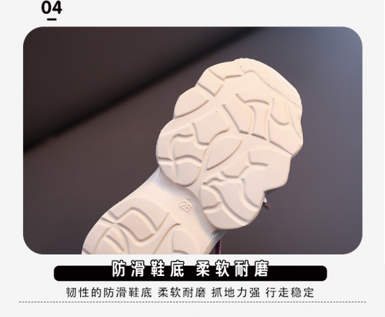 橡胶鞋底提供了卓越的抓地力,让孩子在沙滩、草地、 人行道等各种路面行走时都能稳稳当当,不易滑倒。并且, 橡胶鞋底具有良好的弹性,缓冲行走时的压力,呵护孩子的小脚。