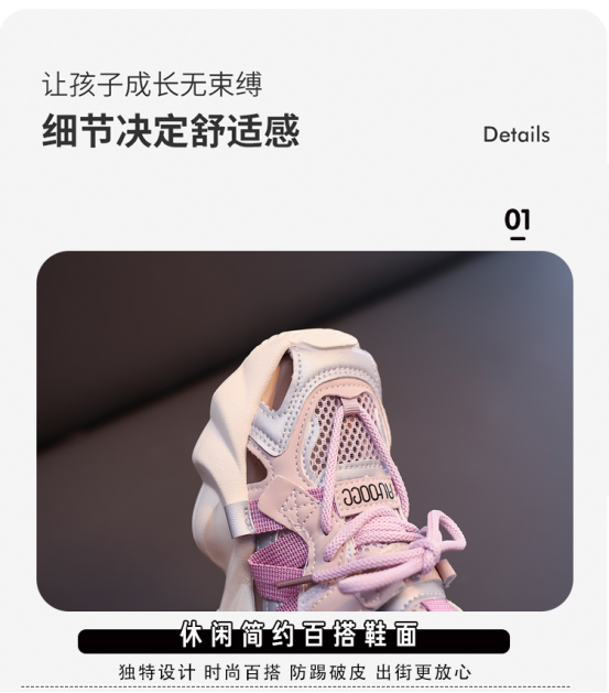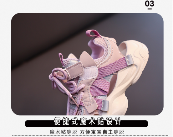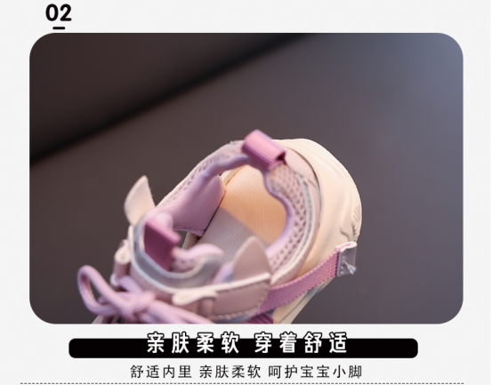 这款鞋子特别注重透气功能,在炎热的夏天, 让孩子的双脚时刻保持干爽,远离闷热和异味。即使长时间穿着,也不会感到不适。