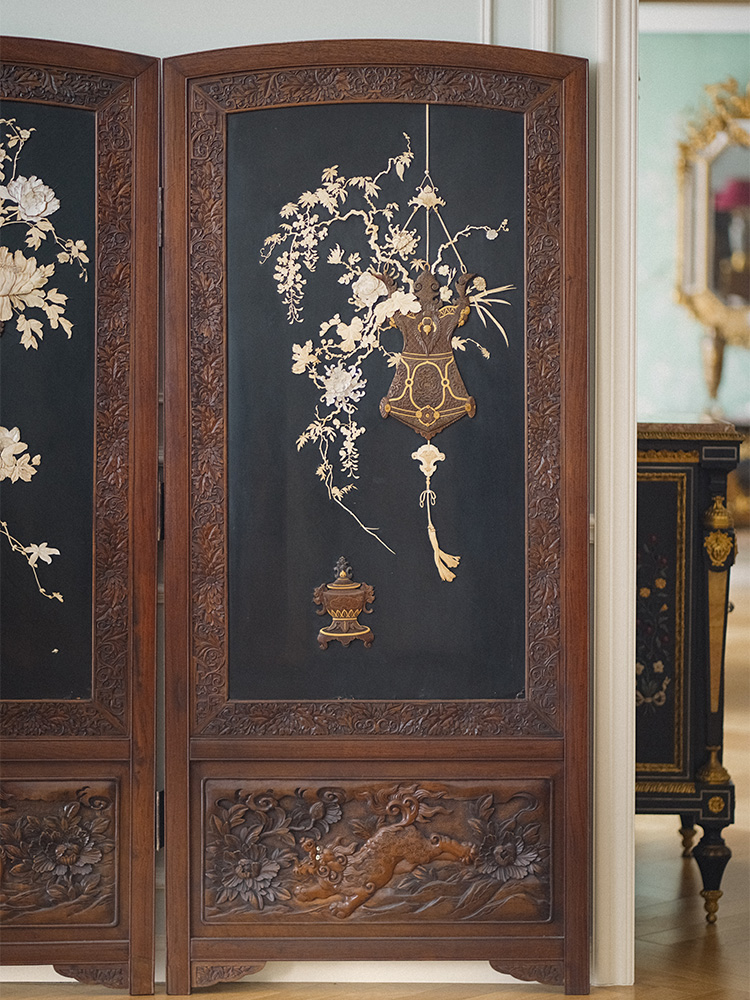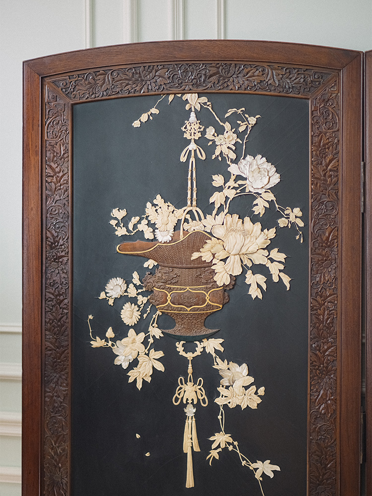 【已售】独角鹿西洋古董 1890年代日本明治时期出品「福寿双全」主题花卉清供芝山镶嵌两曲屏风