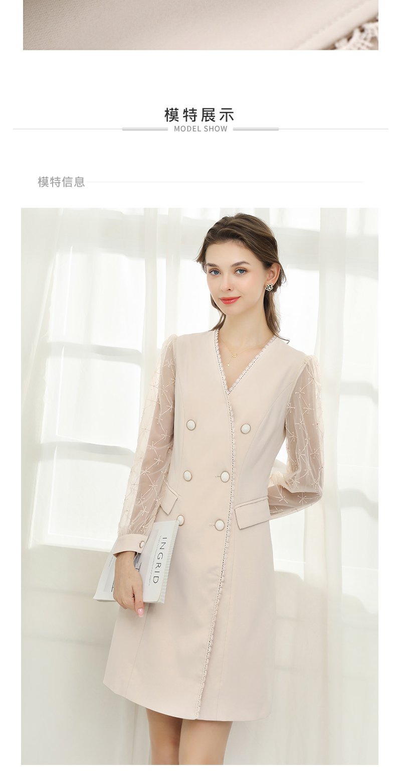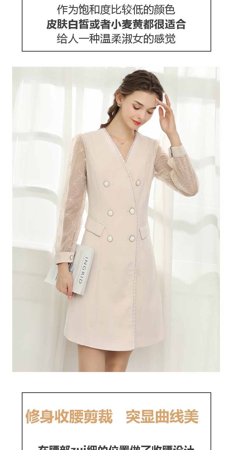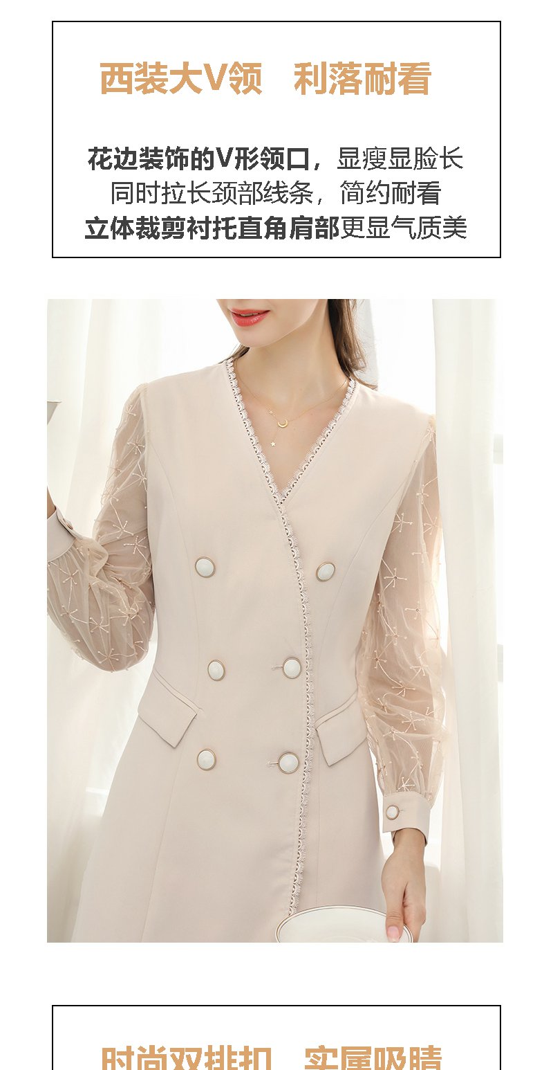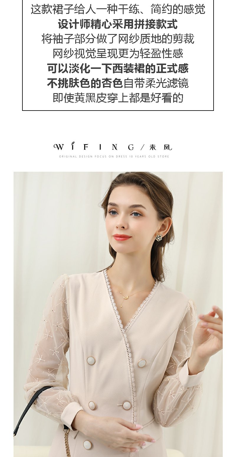 未风杏色网纱拼接连衣裙女春2024年春季新款女装时尚显瘦长袖裙子