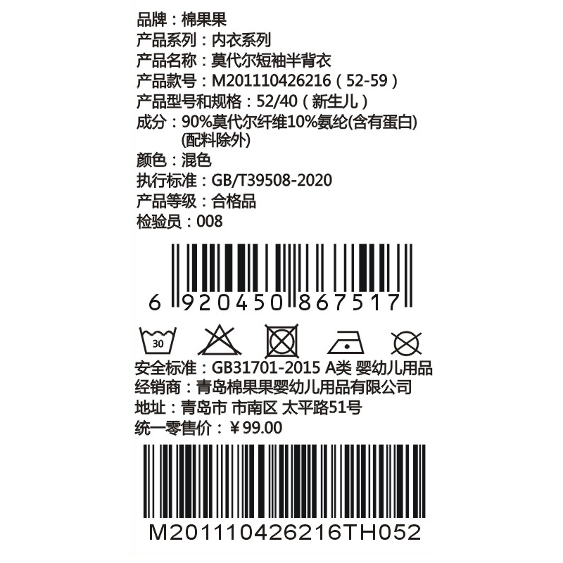 棉果果夏季新品男童女童新生儿防蚊5A抗菌莫代尔短袖半背衣M201110426216