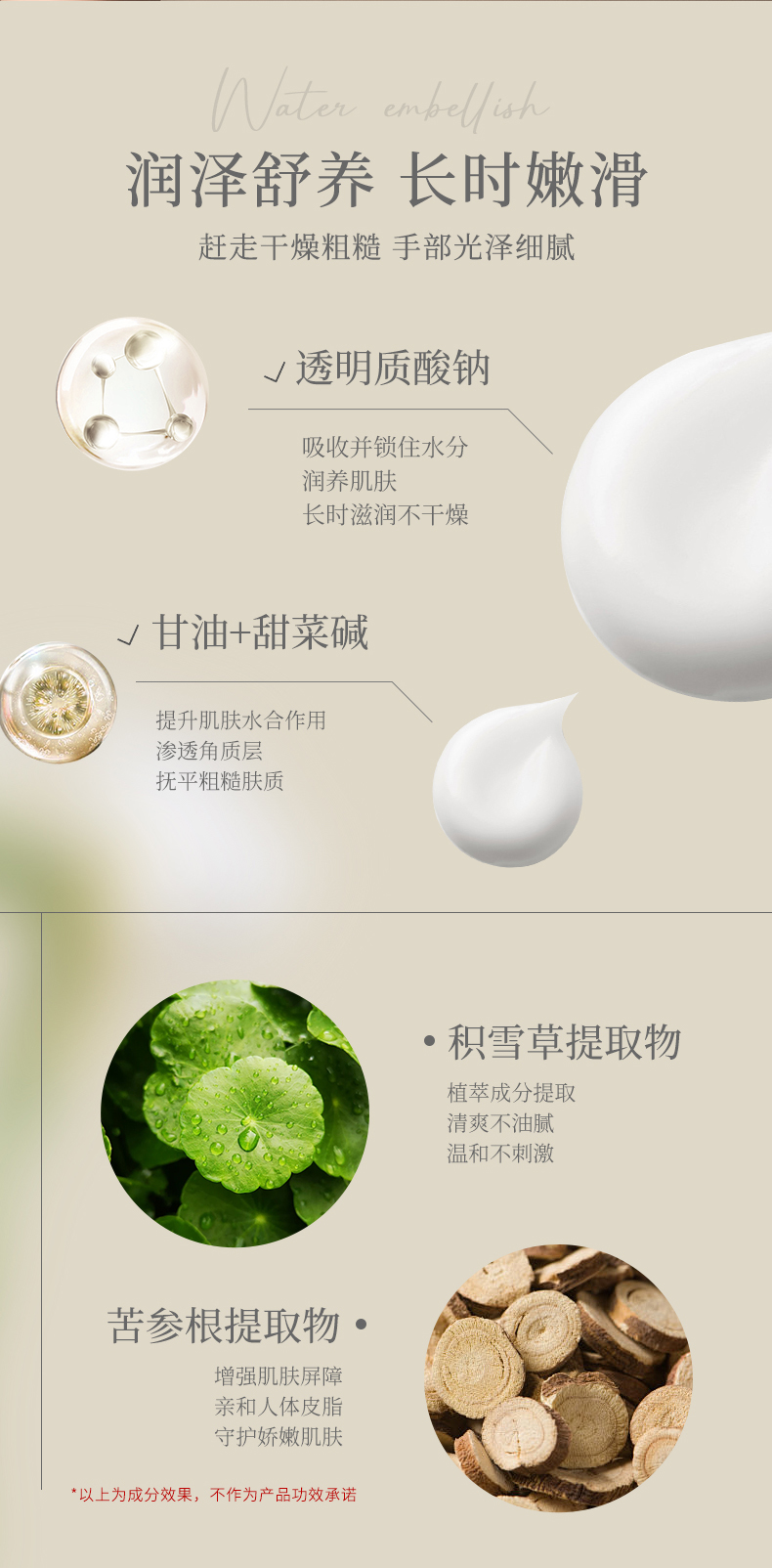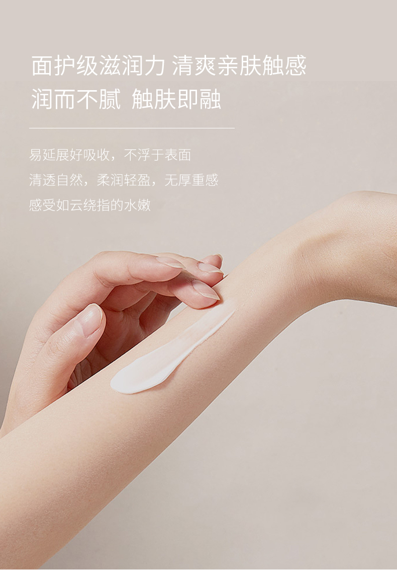 身体乳:我们的乳液采用植物源成分配制而成,其中的积雪草提取物,可最大程度地深层舒养皮肤,构筑肌肤守护屏障。还添加了透明质酸成分、甘油成分、甜菜碱等,能避免皮肤受到外界刺激和影响,可有效缓解肌肤干燥和粗糙情况,减少日常日晒风吹等不良刺激,进一步水润柔和肌肤。