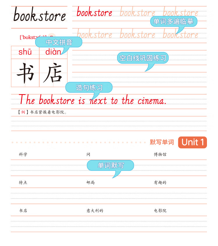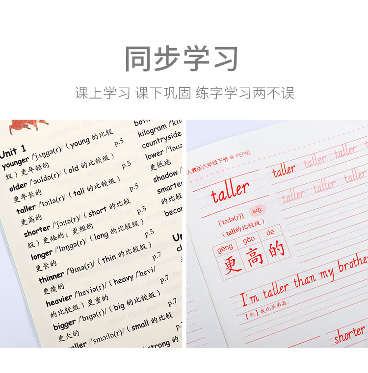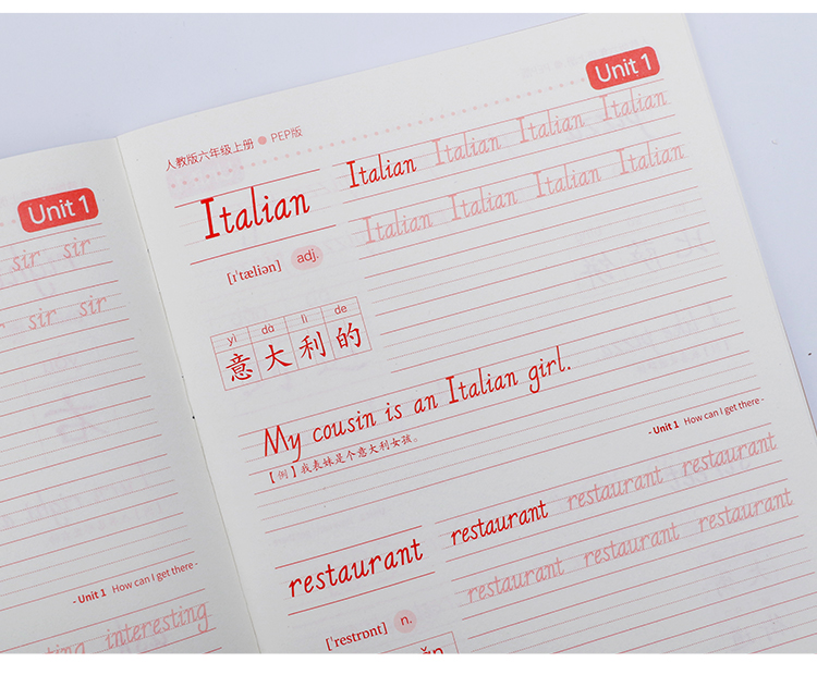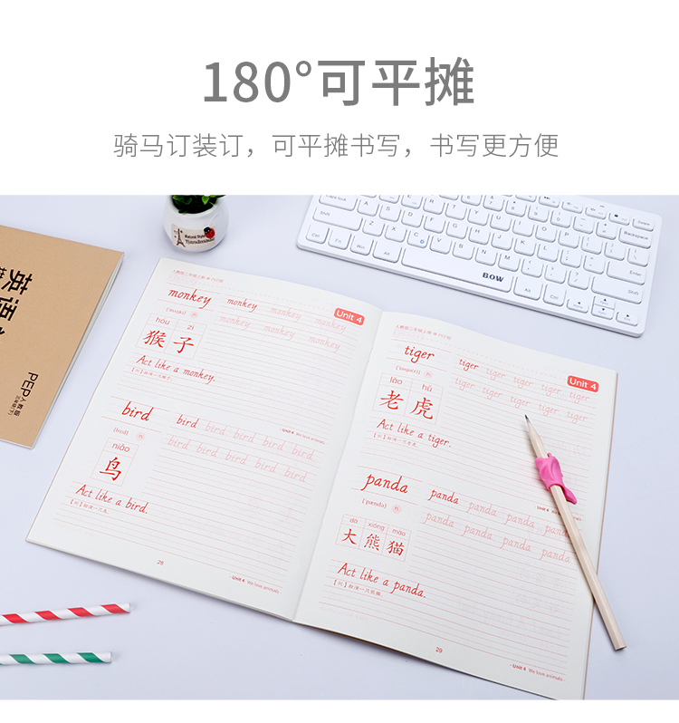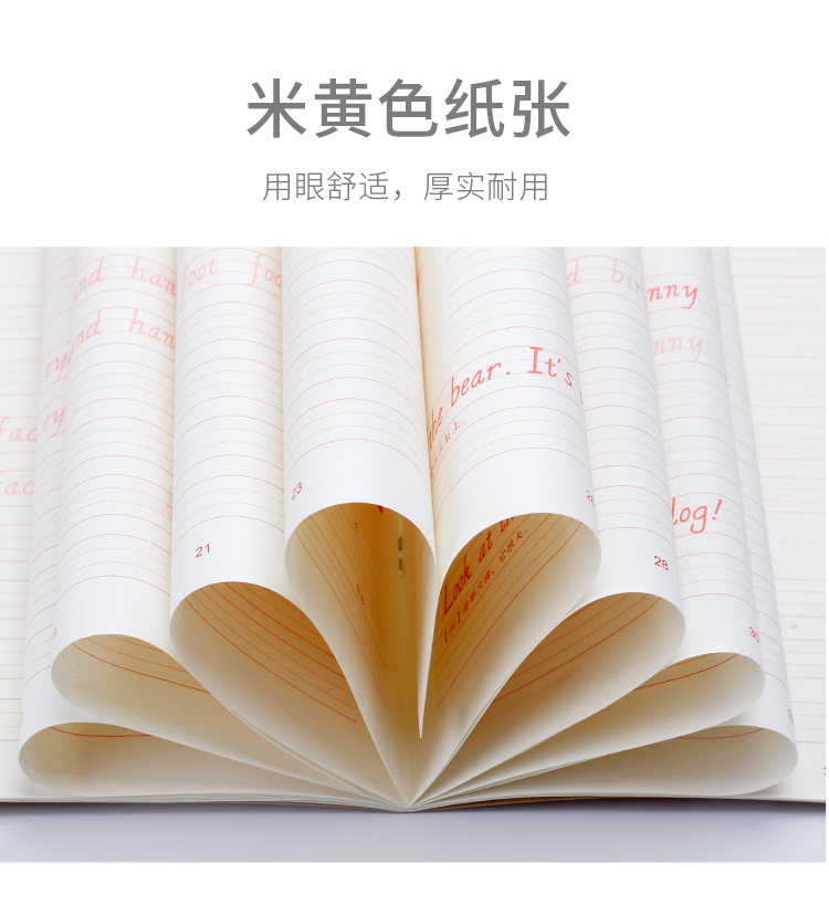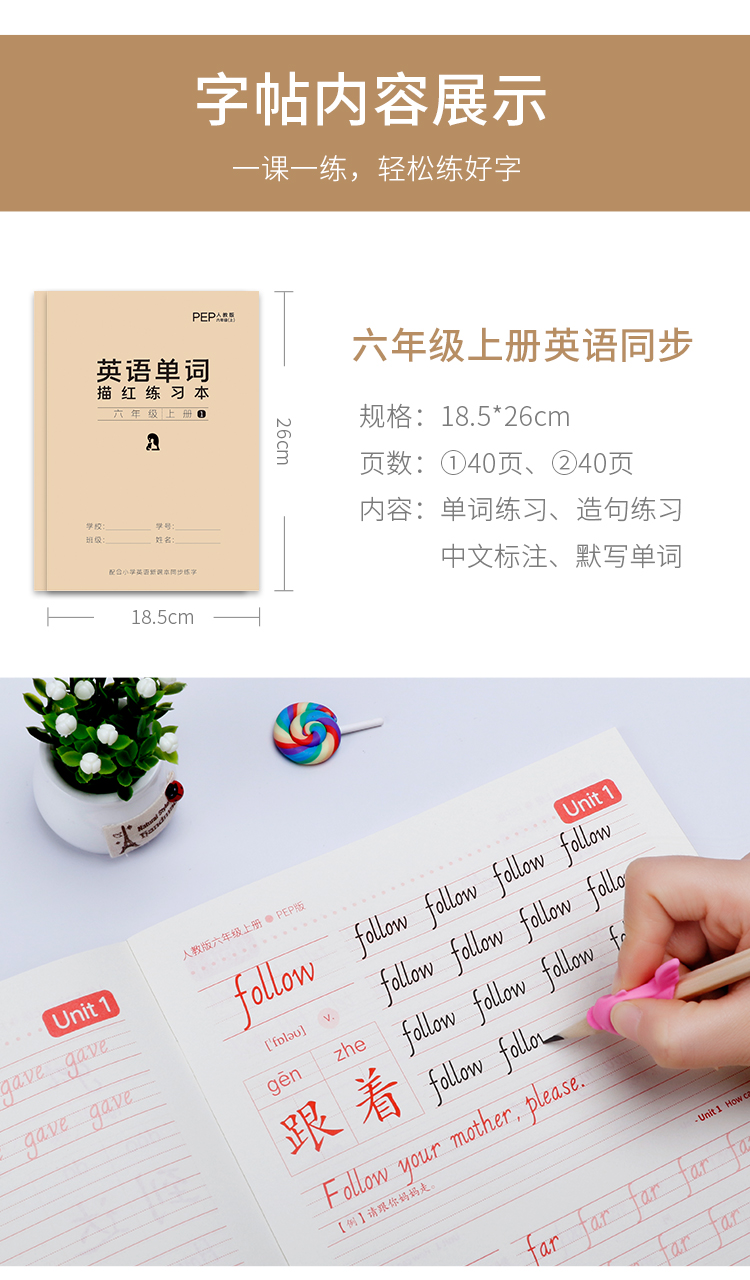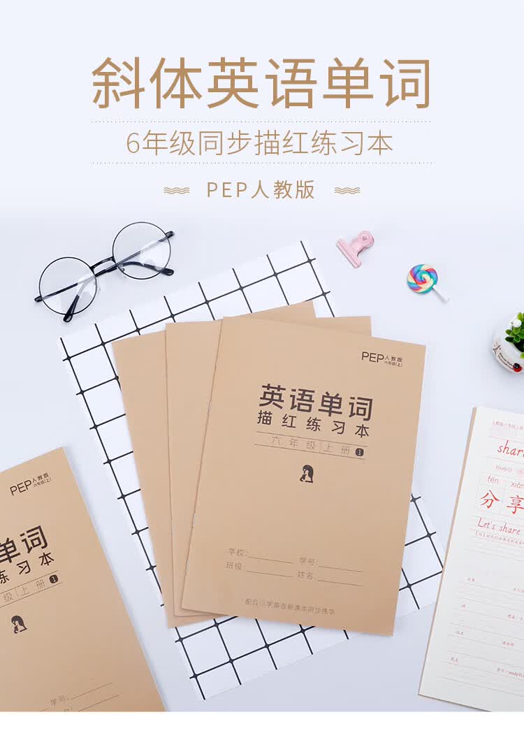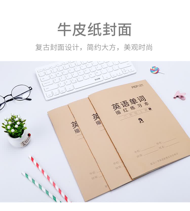 PEP人教版课本同步,紧跟课本单词,教材同步编写;课上学习,课下巩固,练字学习两不误;牛皮纸复古封面设计简约大方,美观时尚;骑马订装订,可180°平摊书写,书写更方便;米黄色纸张,用眼舒适,厚实耐用;