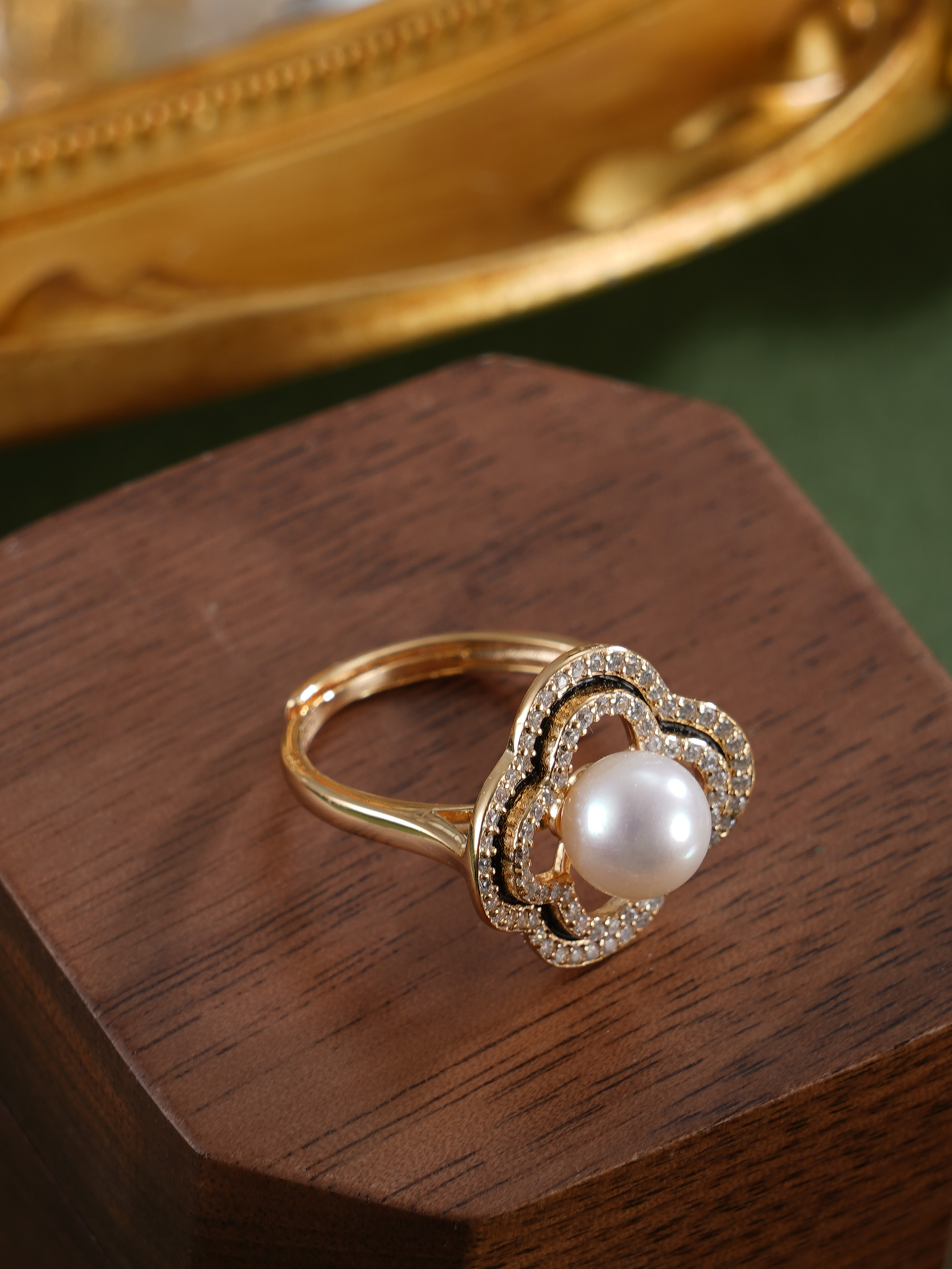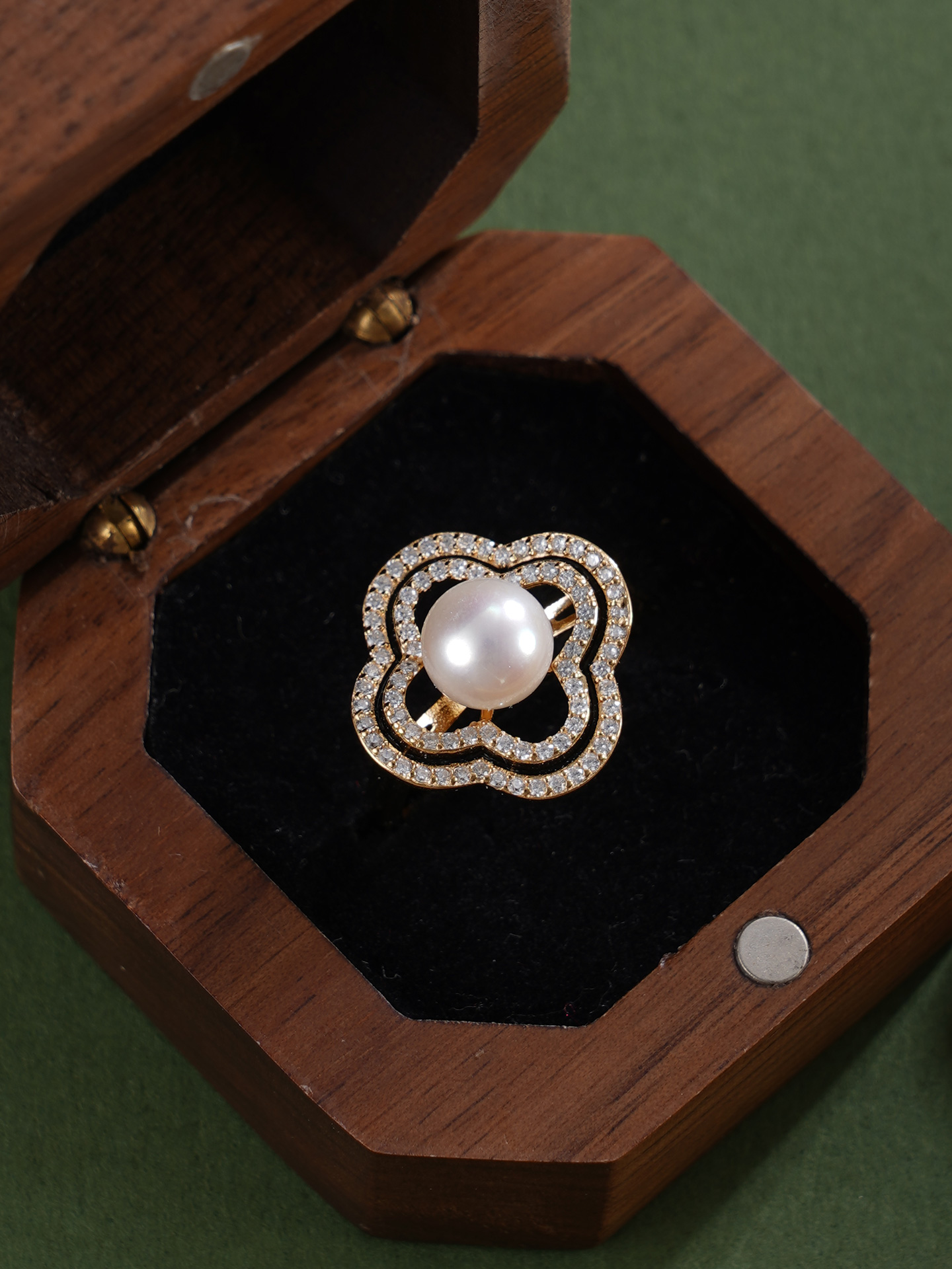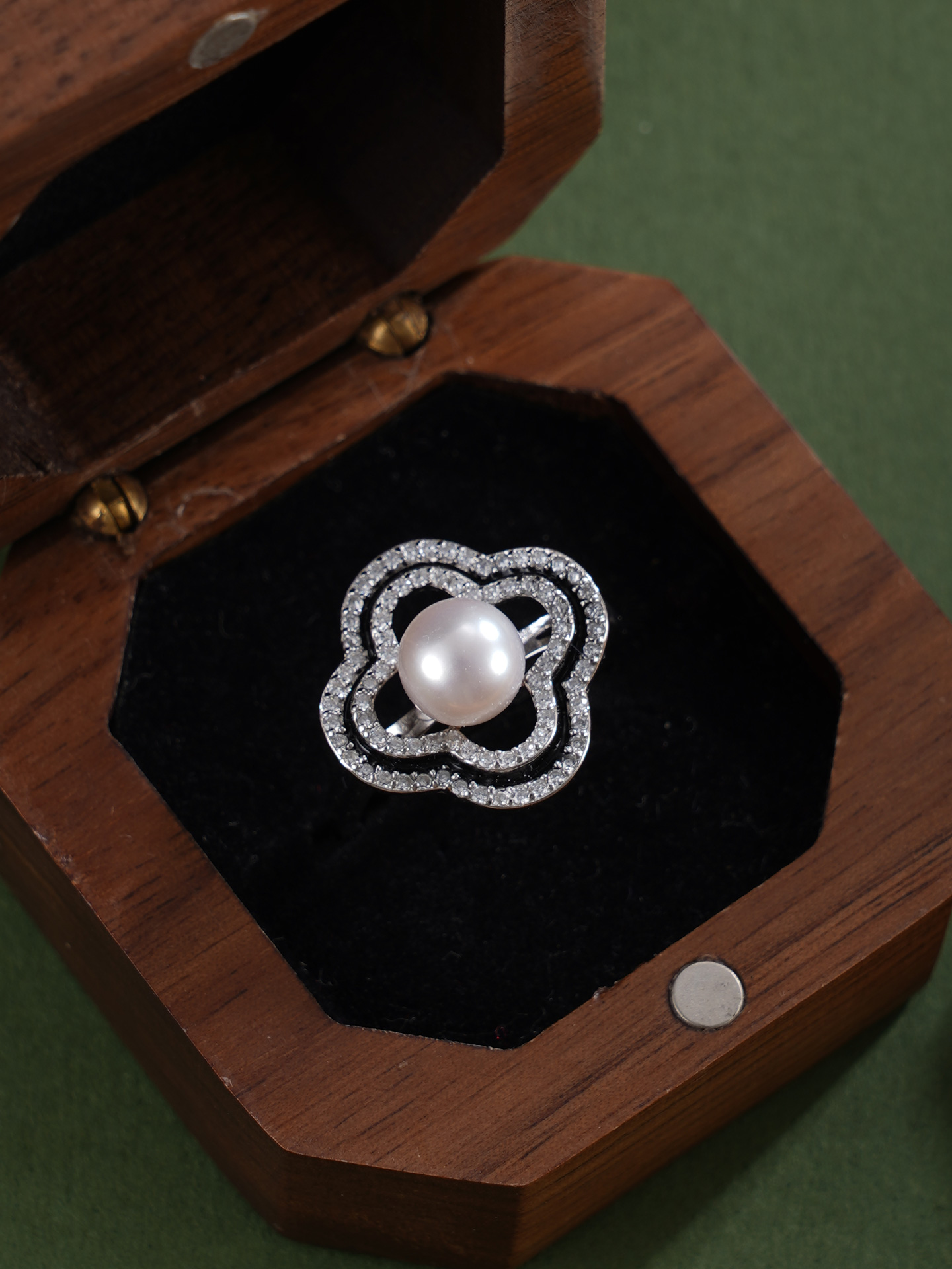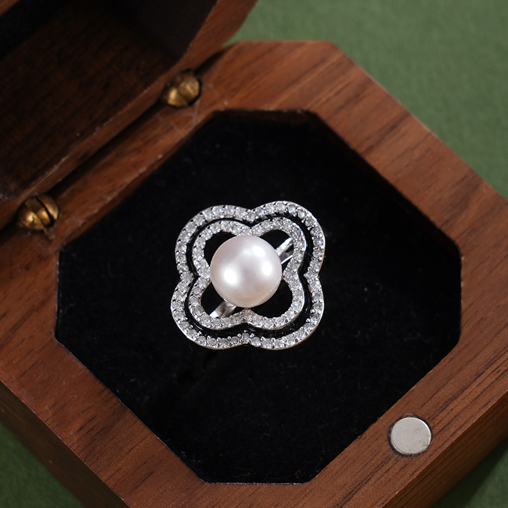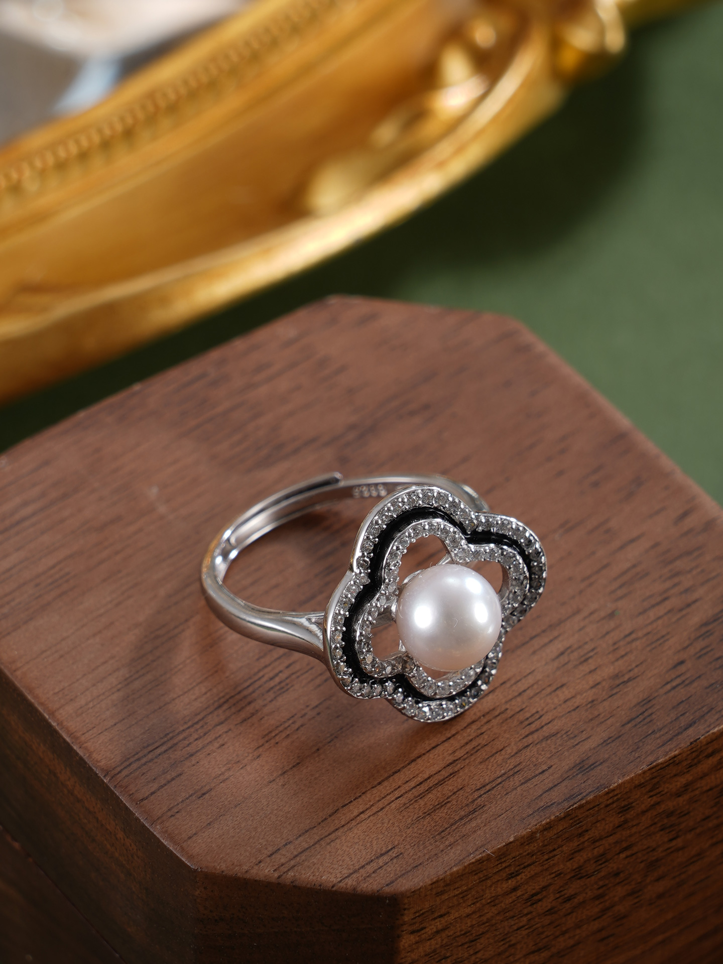 子佩集【相思四叶】银S925珍珠惜王妃戒指【YR0090】7mm珠双色四叶草四瓣花2601
