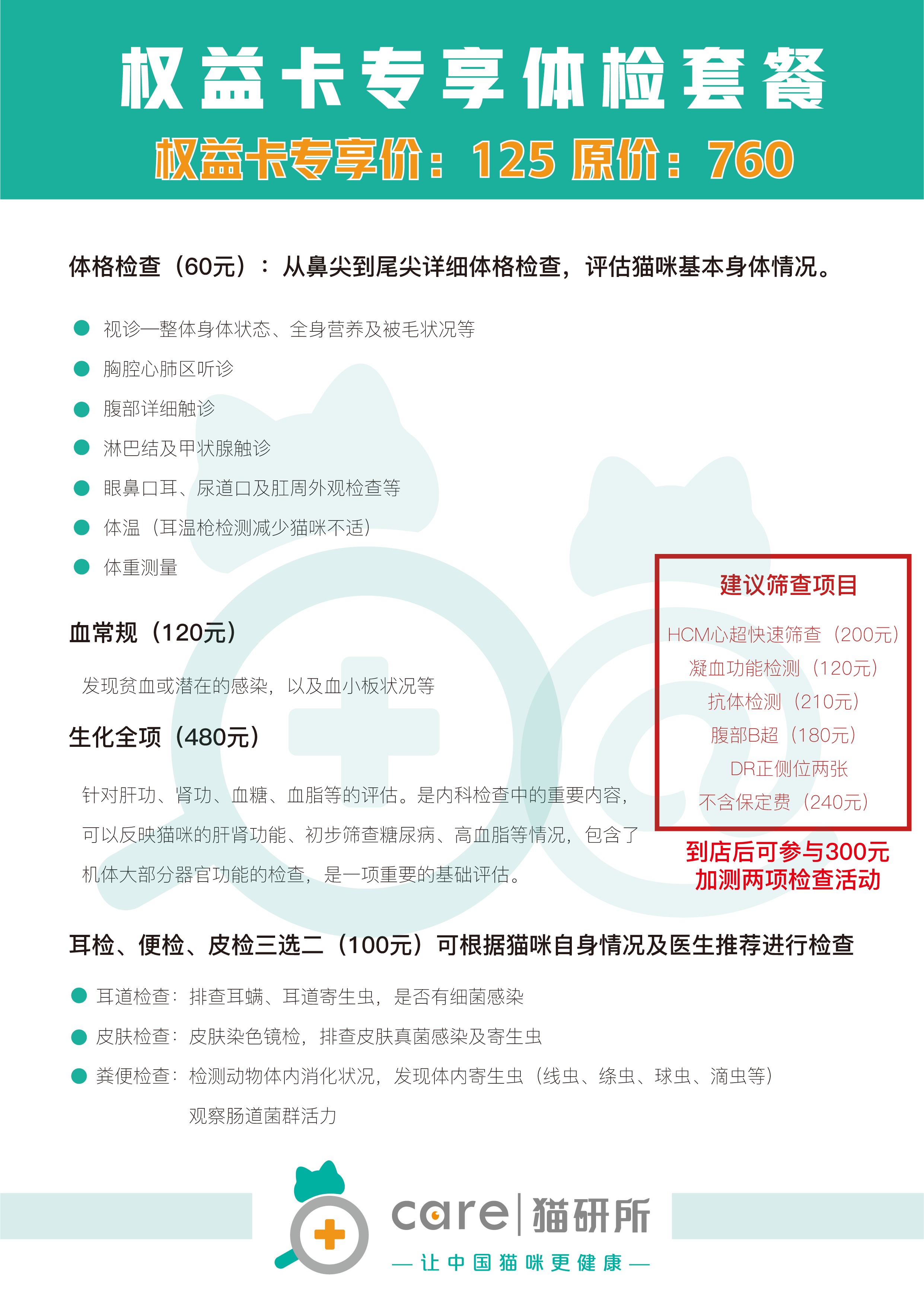 【299权益卡用户专属125元安心体检套餐】猫研所动物医院 含生化全项 血常规 皮检、耳检、便检三选二