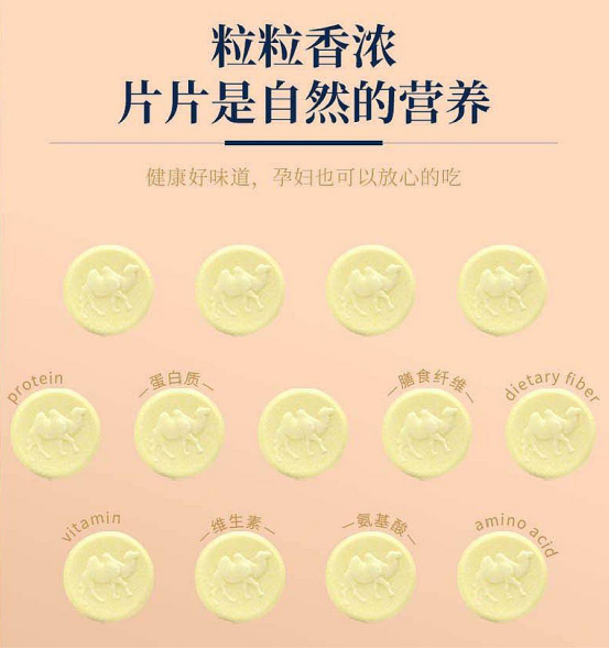 3.配料干净,享受香浓美味 全脂的骆驼奶粉经低温高压工艺精致而成,营养成分和奶粉差不多 零蔗糖 零香精 成分安全添加,完全可以放心食用 嘴馋时来一颗嚼一下 满足嘴巴的快感