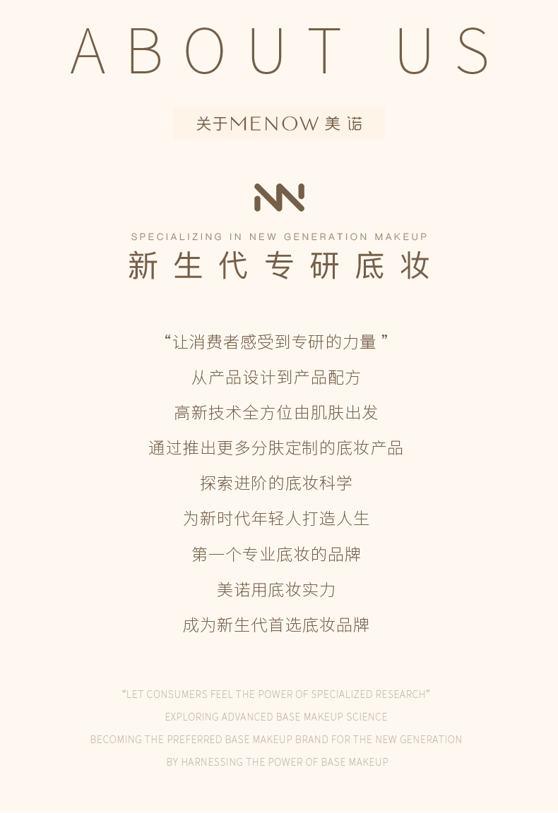 - 全球性彩妆品牌,专注开发高品质的适用性美妆产品。拥有20多年美妆经验,产品远销欧美等80多个国家。美诺彩妆致力于给用户带来“爱与美,年轻,不一样的品质彩妆体验”。