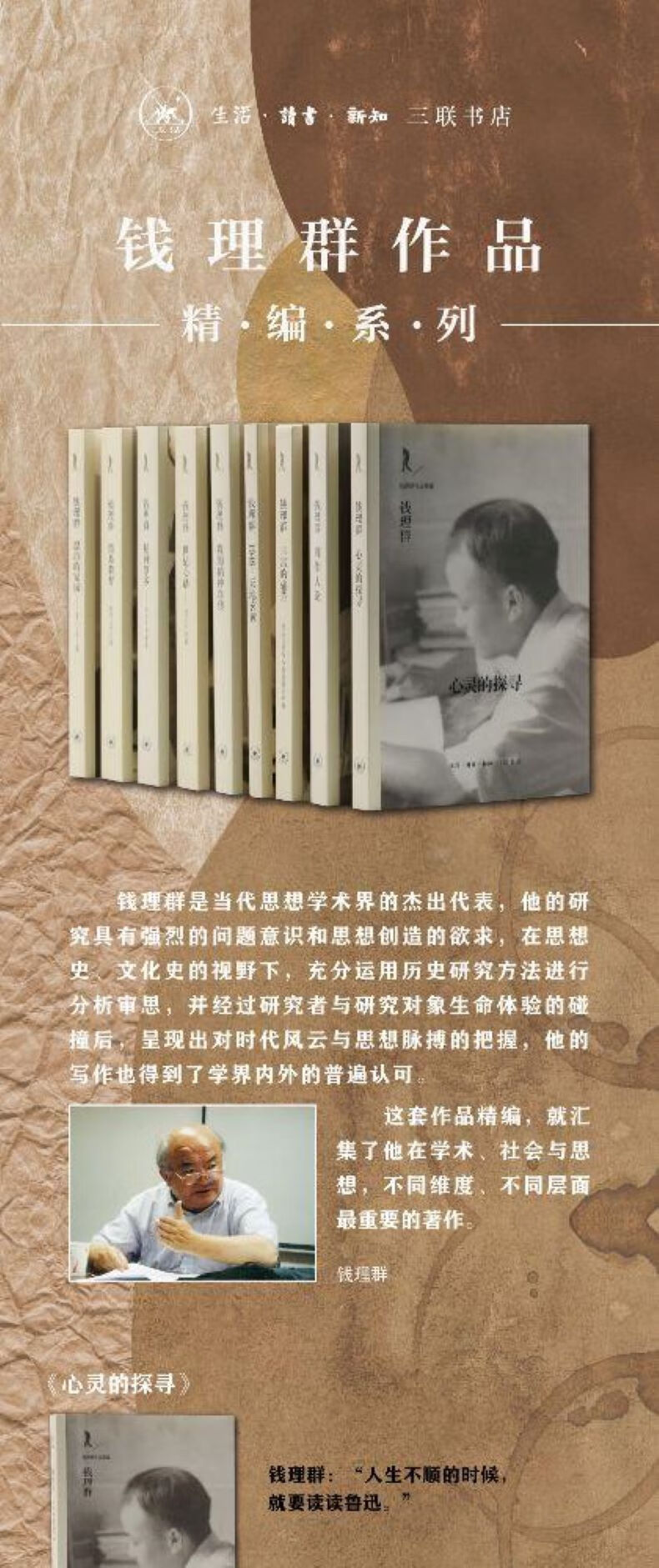 钱先生的代表作,是国内鲁迅研究界中的标志性作品。《心灵的探寻》可以说是自己的“鲁迅观”。在他的笔下,鲁迅许多原先不为人们熟知的魏晋风骨、无政府主义和个人主义思想都得到了展示,在80年代极大地丰富了鲁迅的面貌;更重要的是,他用自己的生命体验对“鲁迅”进行着投射。曾经说过:“我研究他,不是在学院中把他当作研究对象,而是把他当作引导者,首先学会怎样做人,然后有体会,写成书就是《心灵的探寻》。至于人们承认与否是无所谓的。”他《心灵的探寻》并不求在学院体制内得到承认,更在意与公众分享“我之鲁迅观”,进而让大家从“鲁迅”中受益。而三十年来,这本《心灵的探寻》在思想界、知识界,也包括学术界,都得到了应有的好评与重视。