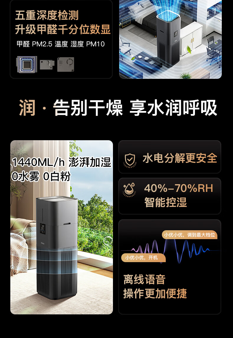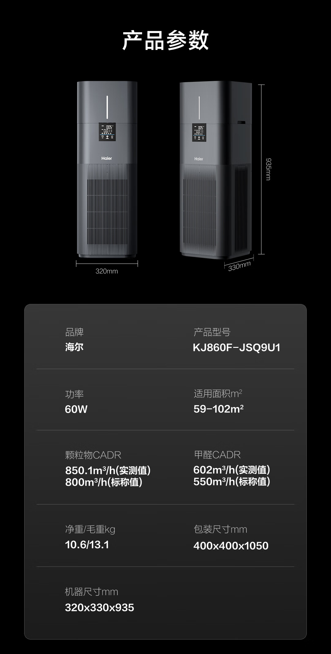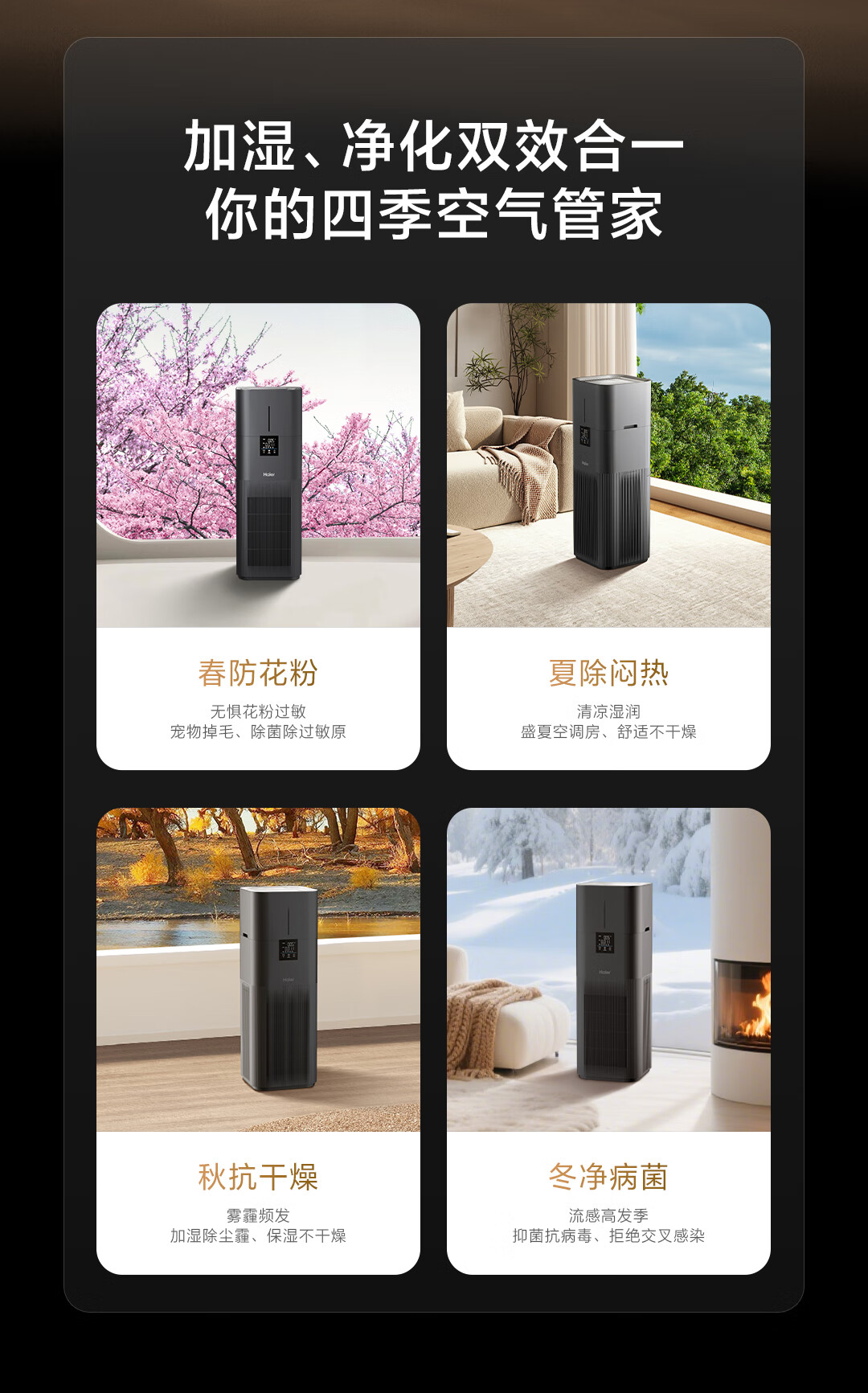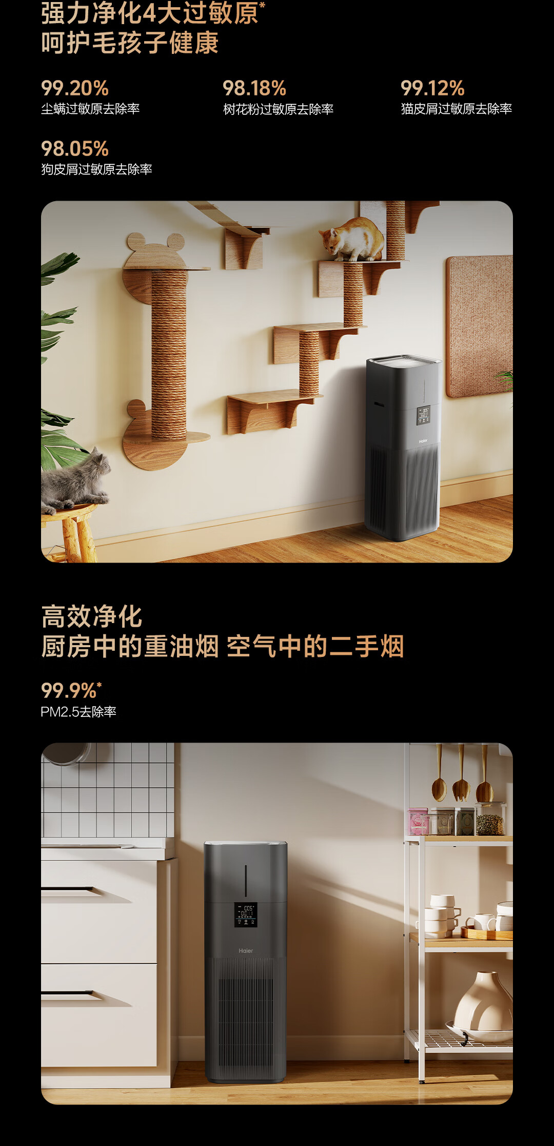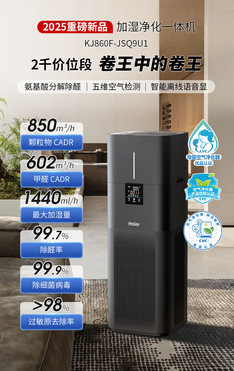 【新品机皇】海尔空气净化器加湿一体机除甲醛除烟味除异味除过敏原杀菌消毒家用KJ860F-JSQ9U1极夜灰加湿 宠物毛发除过敏原细菌病毒 空气消毒机 甲醛千分位显示