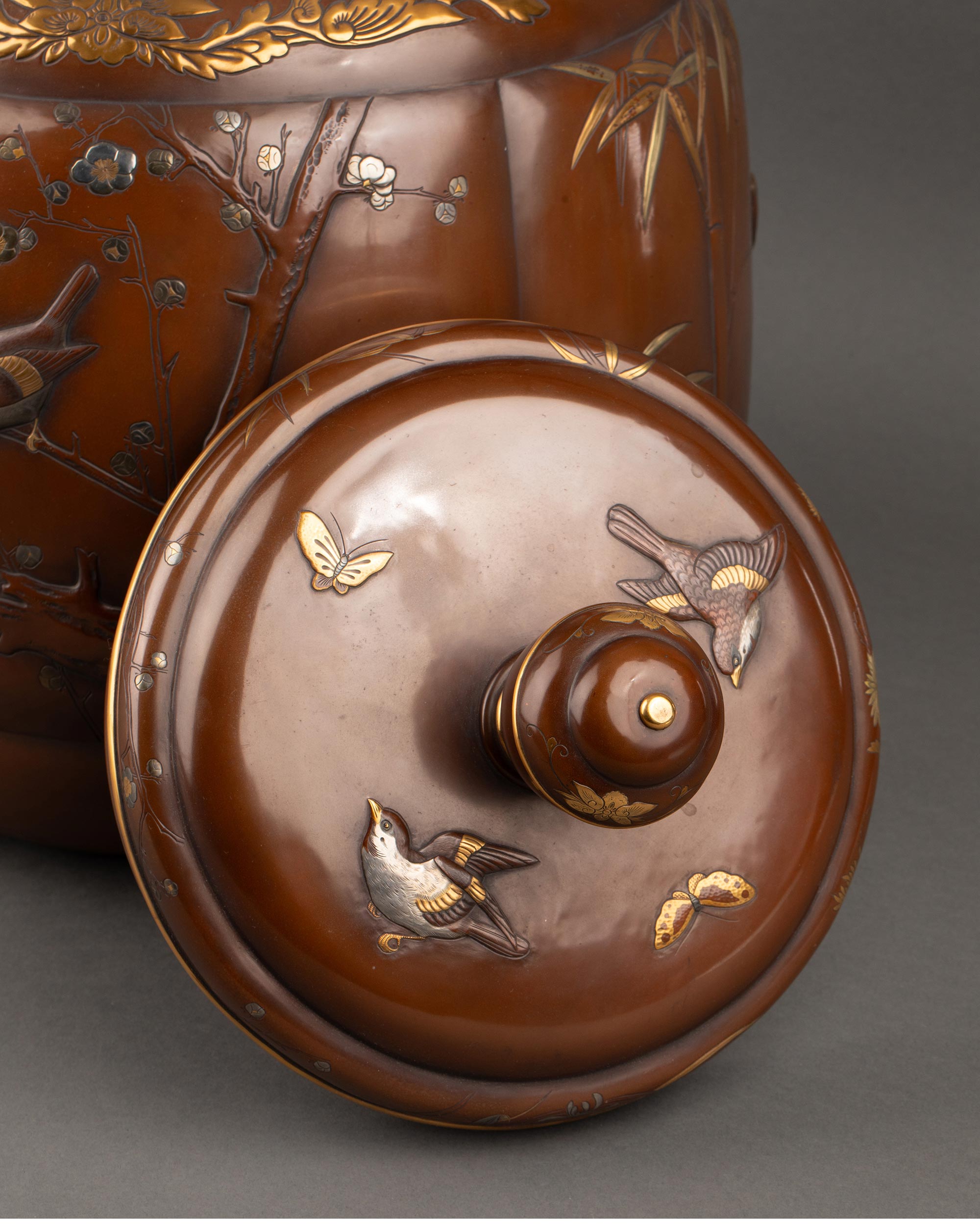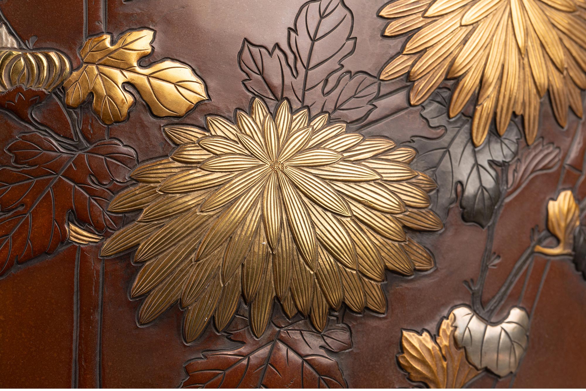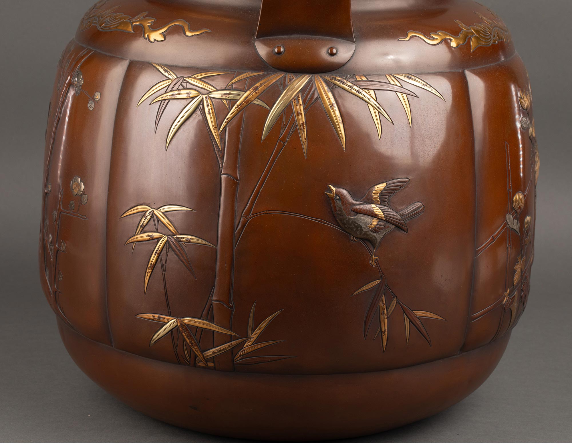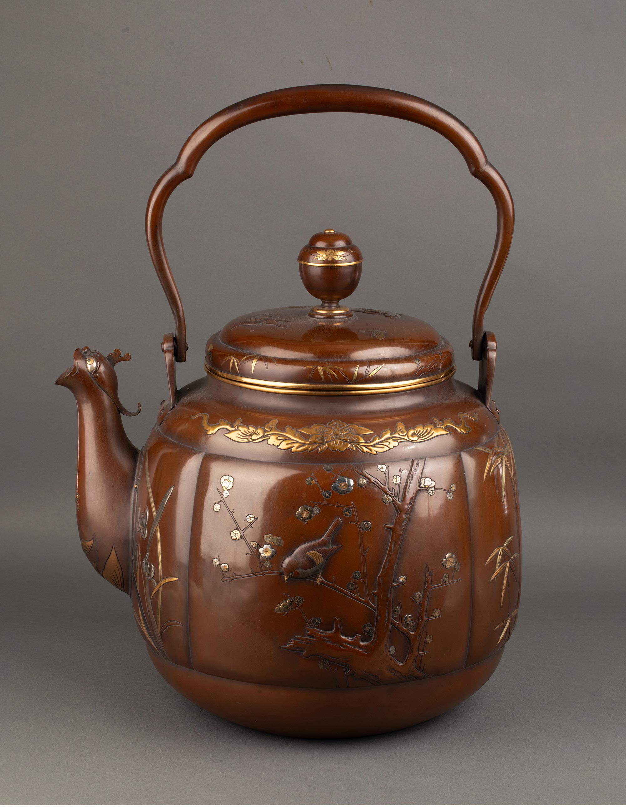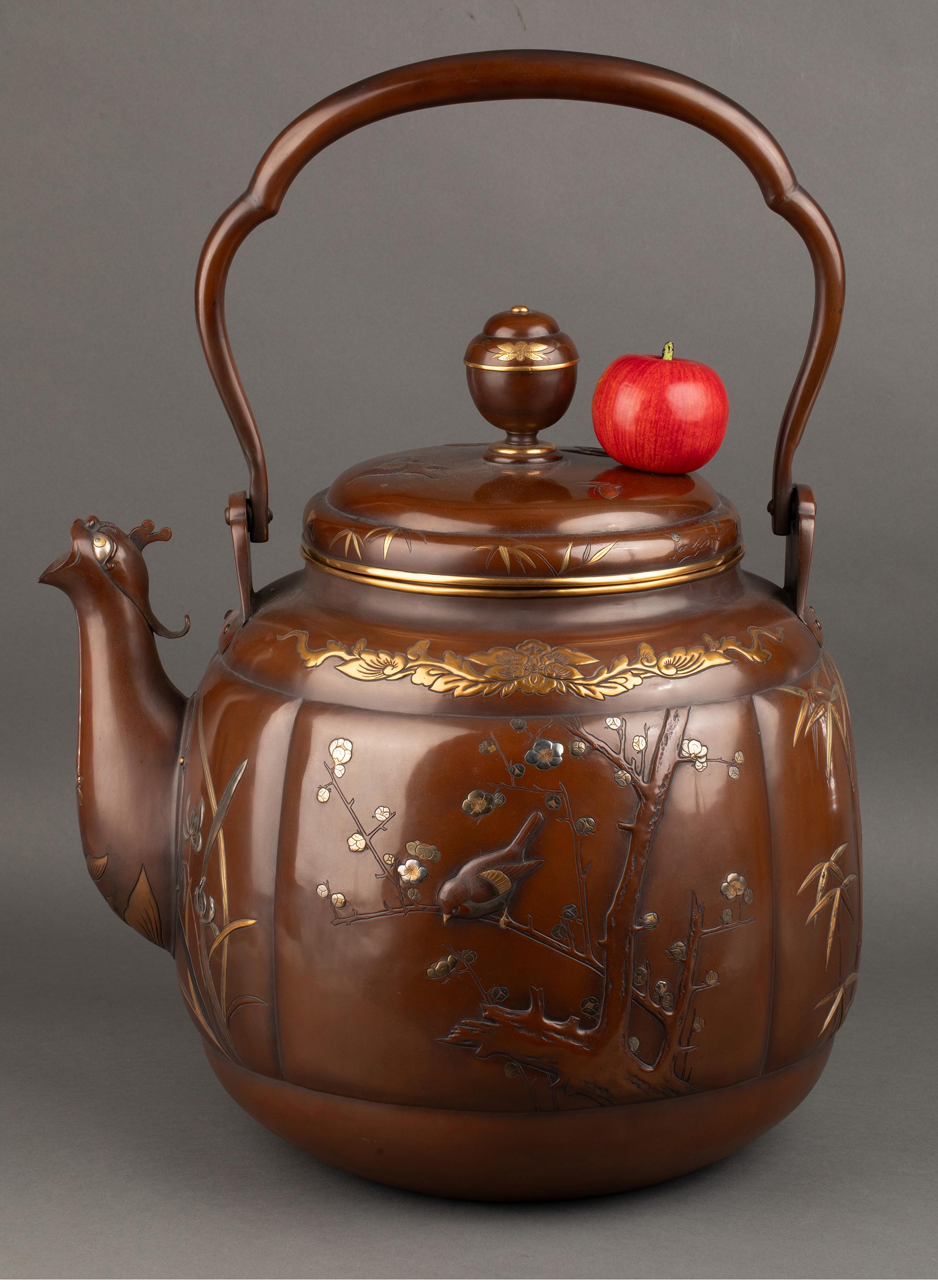1880年代日本明治时期出品东方花鸟主题镀金银精雕装饰麒麟壶嘴大型赤铜茶壶