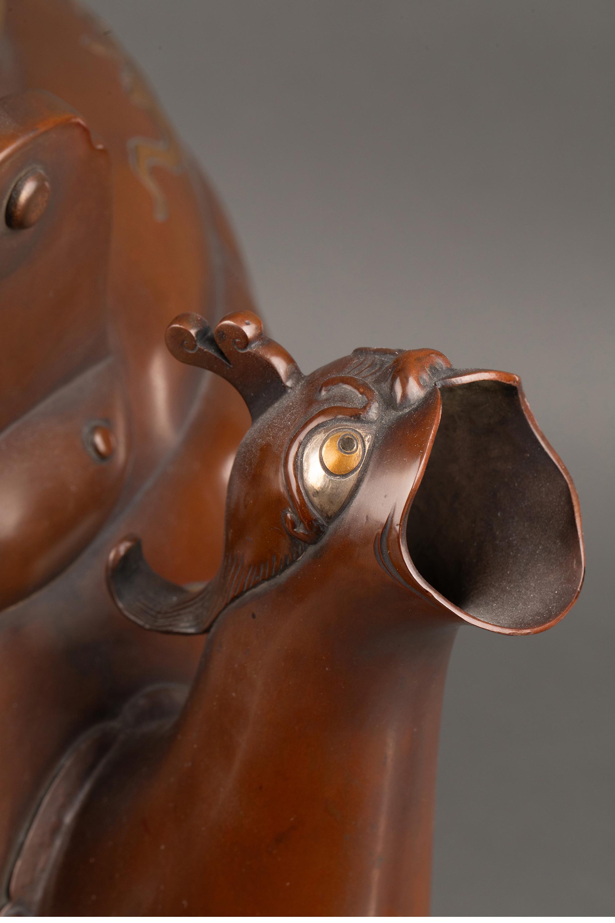 独角鹿西洋古董 1880年代日本明治时期出品东方花鸟主题镀金银精雕装饰麒麟壶嘴大型赤铜茶壶
