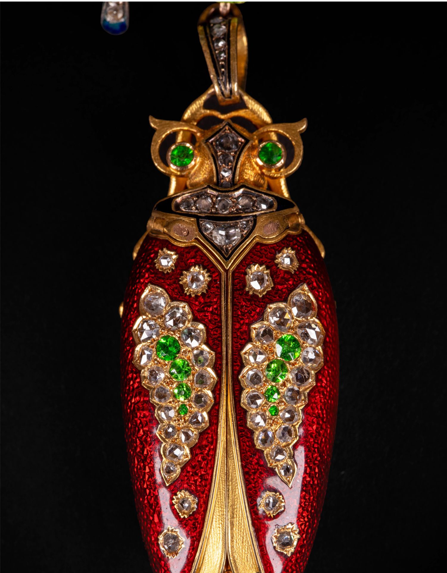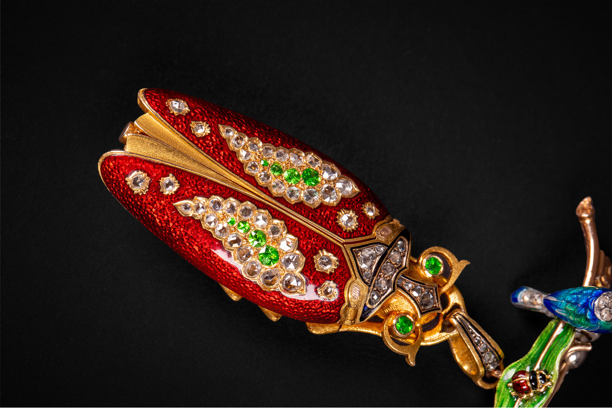 独角鹿西洋古董瑞士珐琅18K金镶钻石隐藏表盘甲虫雀鸟胸针怀表