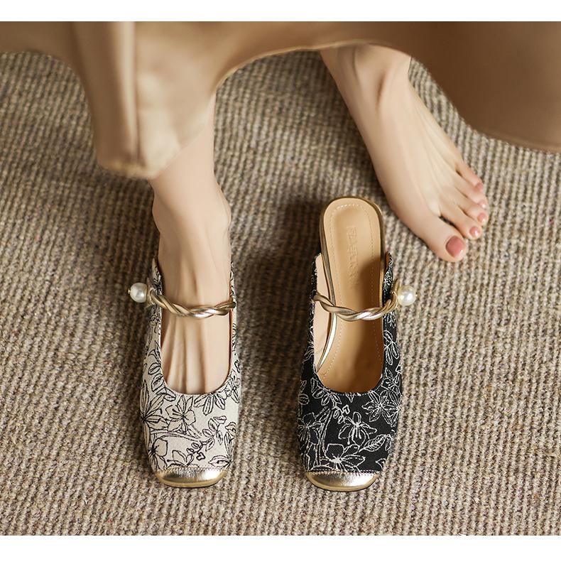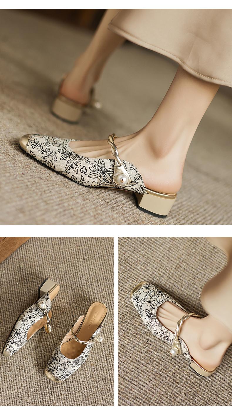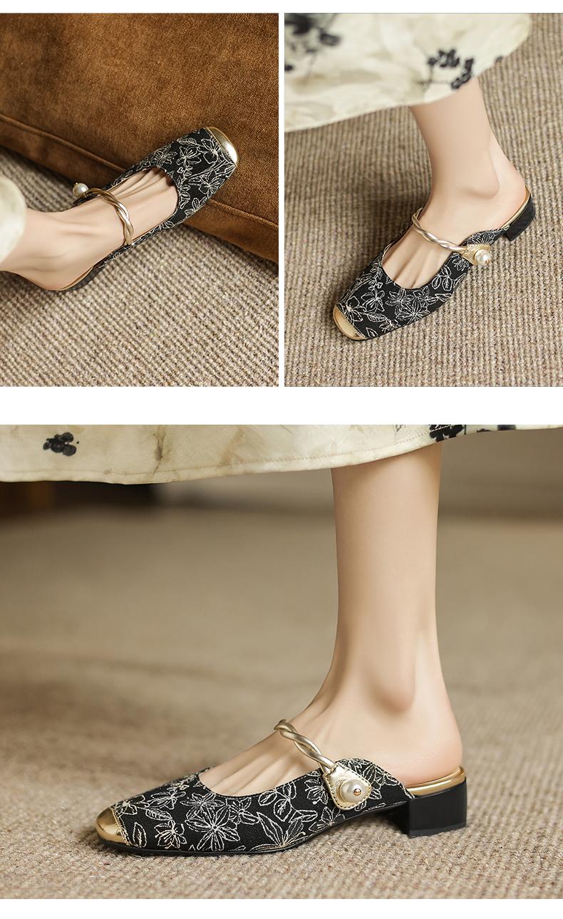 手工女鞋2025新中式粗跟穆勒拖3CM夏季雕花方头拖鞋百搭 商品图0