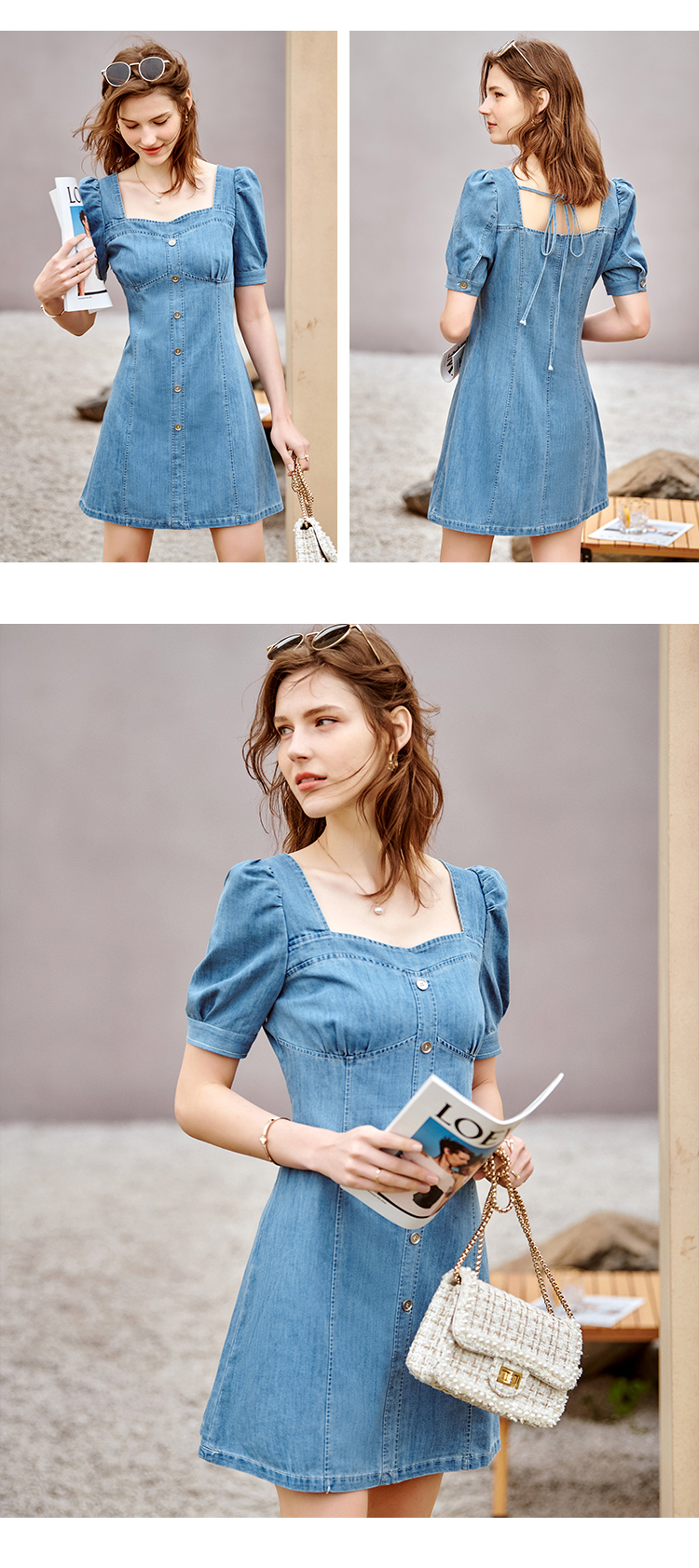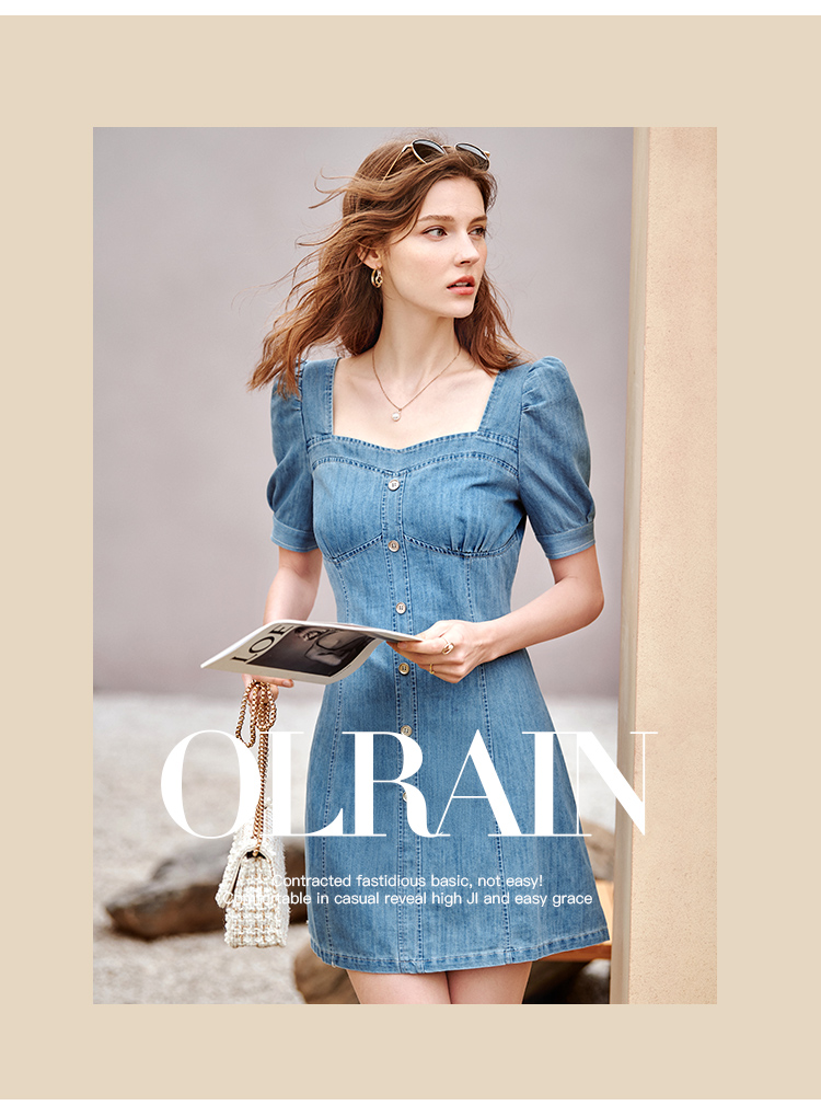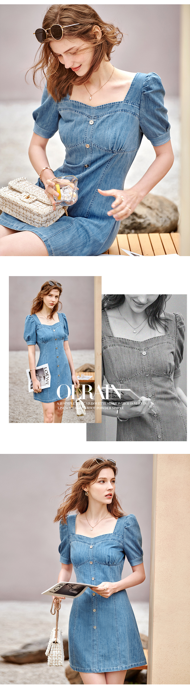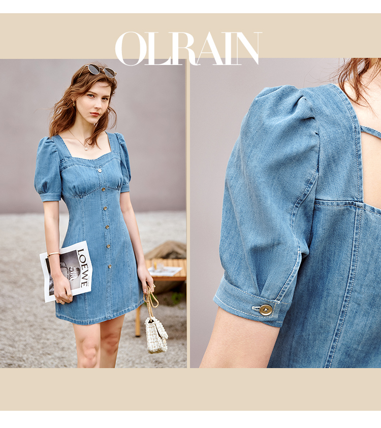欧芮儿牛仔连衣裙女2022夏季新款收腰显瘦方领泡泡袖气质时髦裙子