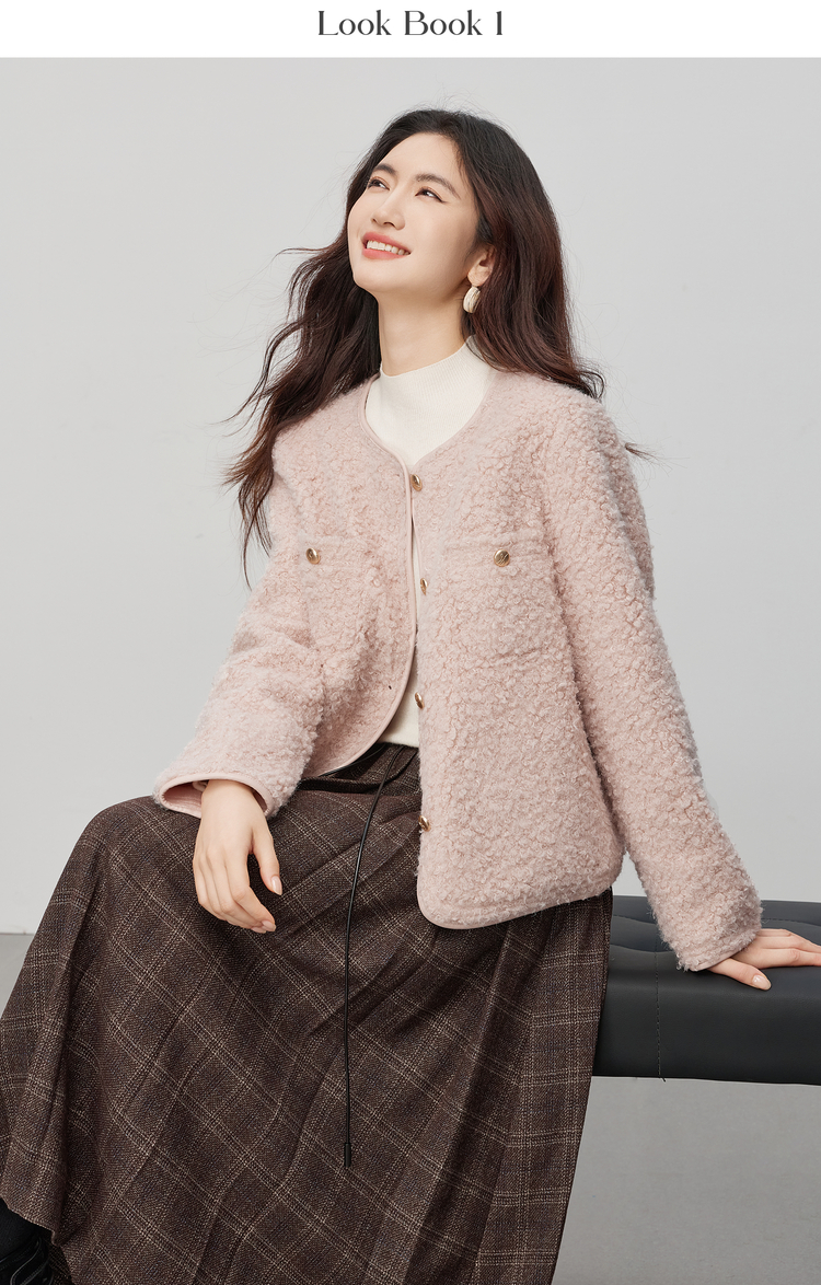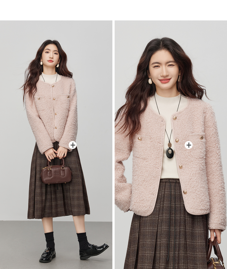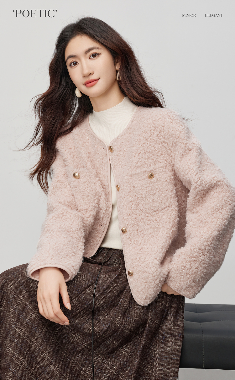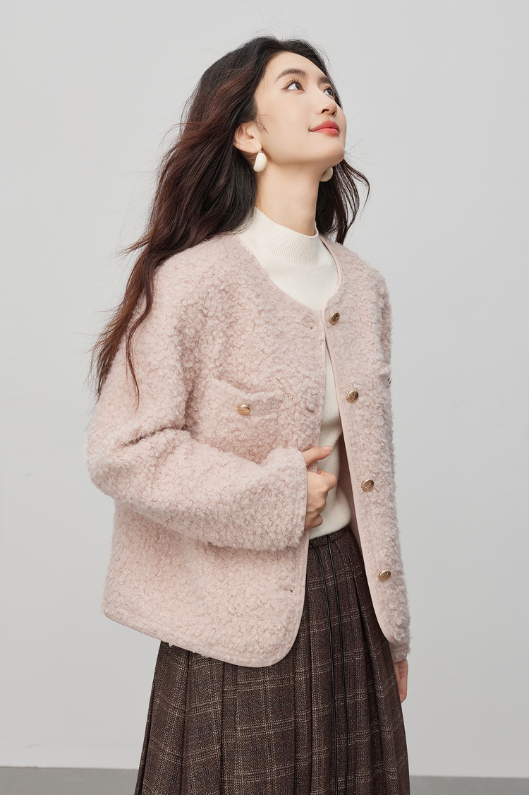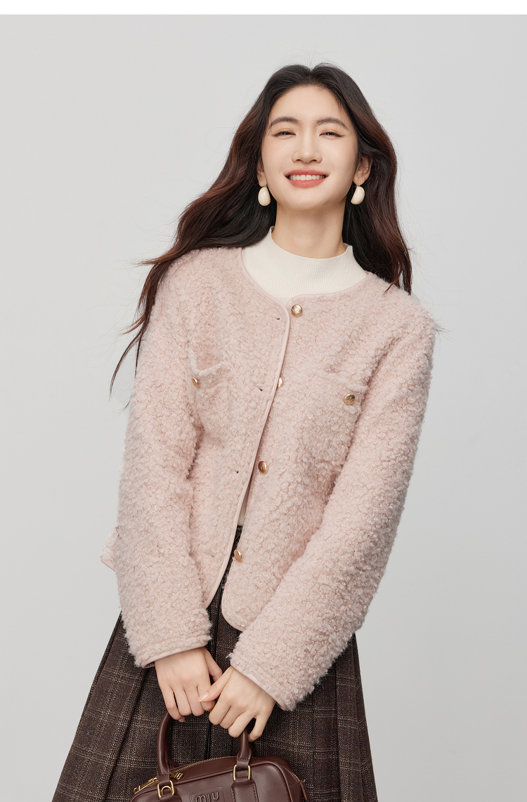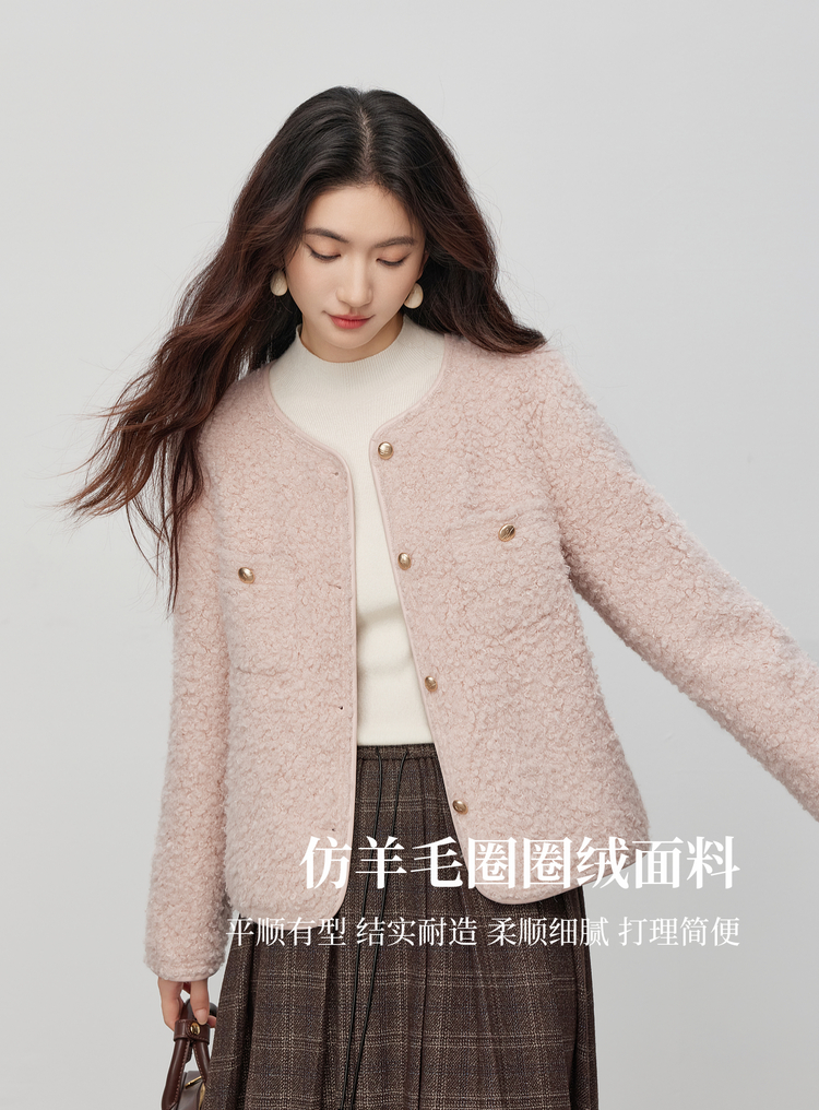 【11/19新品】熙世界仿皮草粉色小香风短外套女冬季气质名媛圆领圈圈呢毛绒上衣