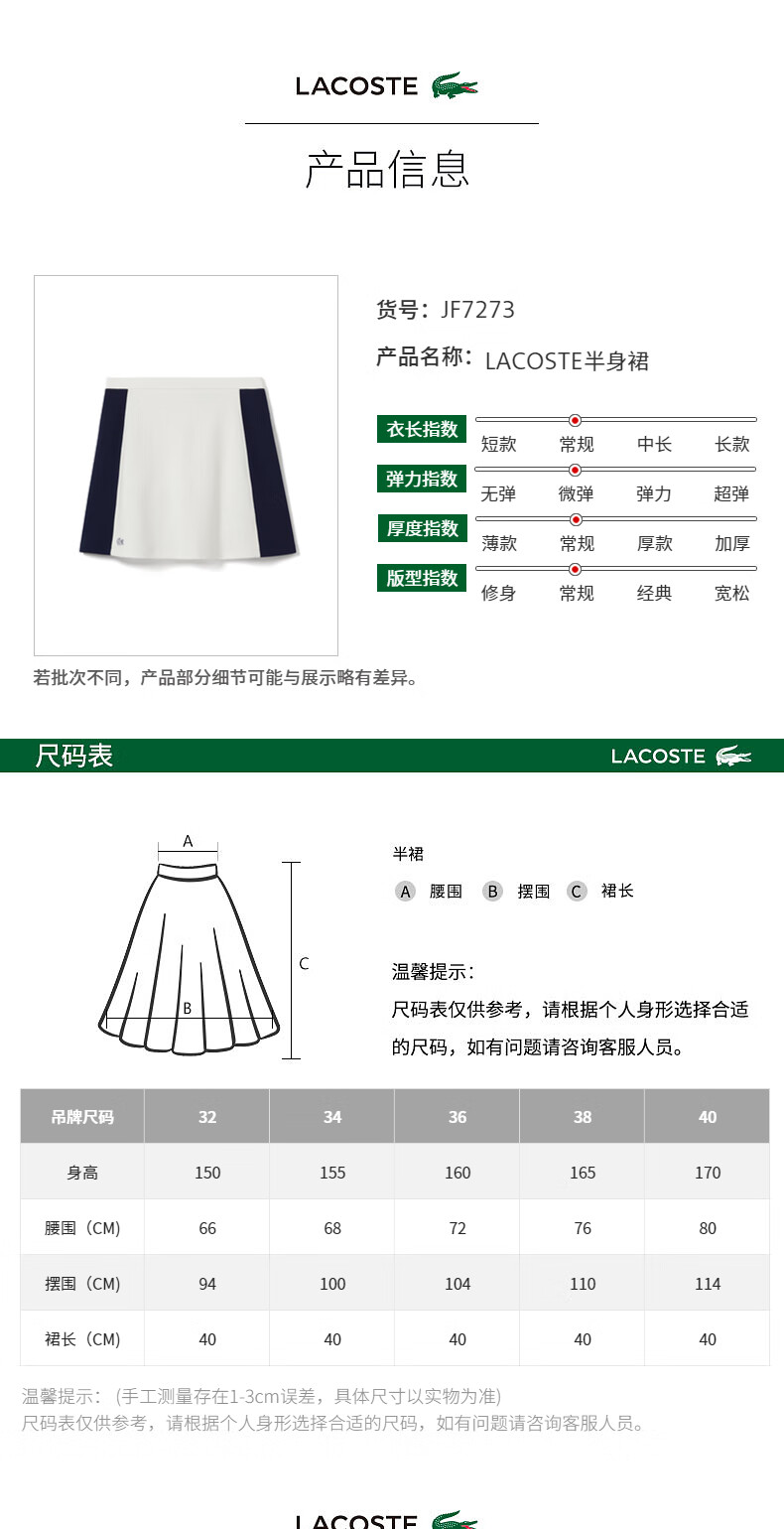 【海南专供价】Lacoste法国鳄鱼女装新款时尚百搭半身裙JF7273-10