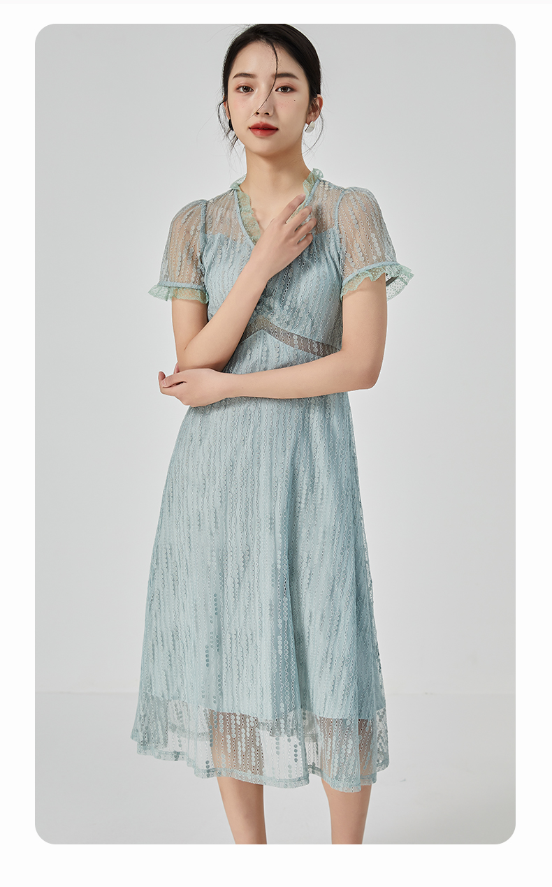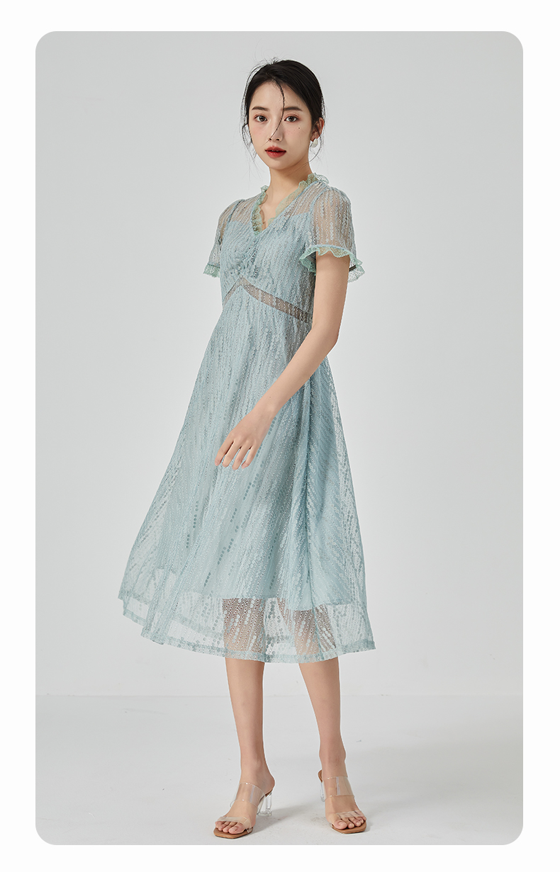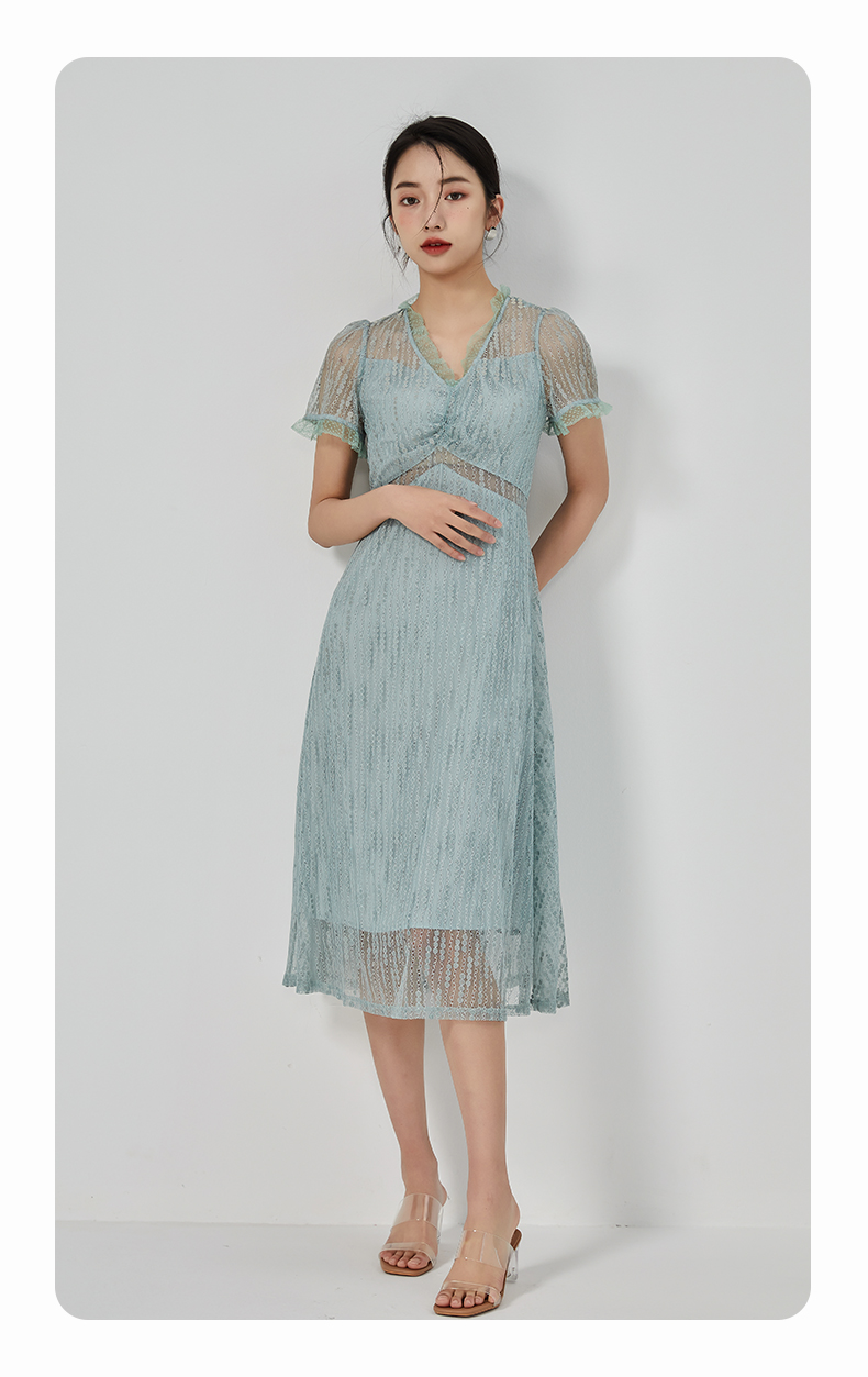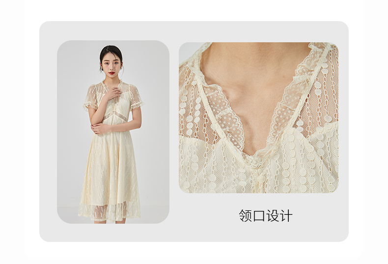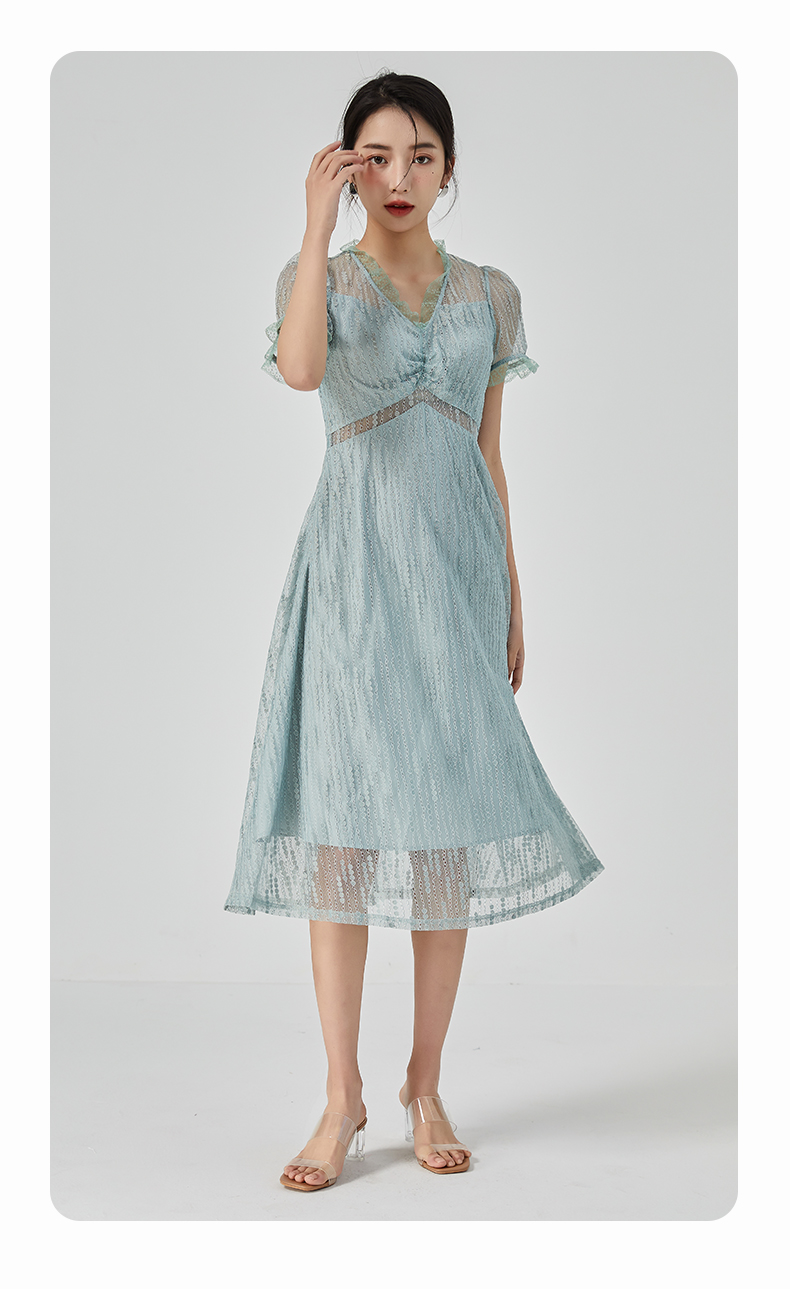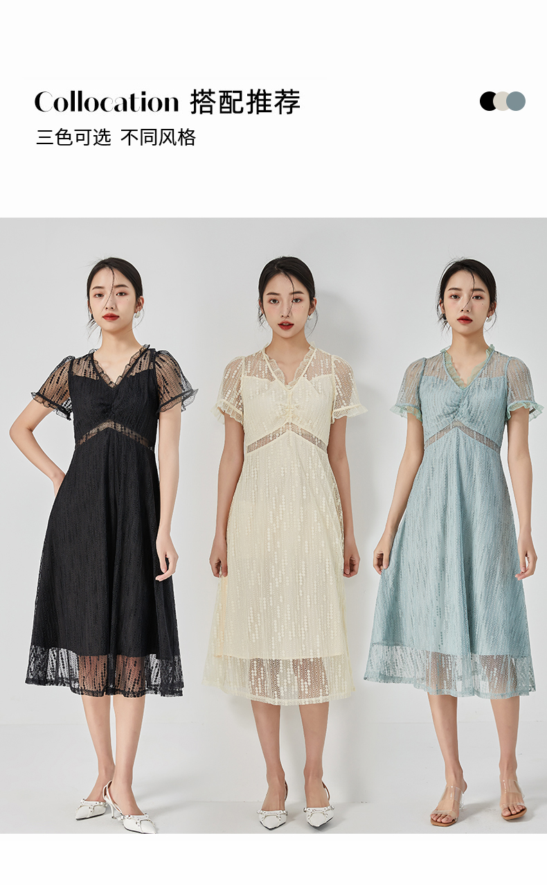 oldcolour2023夏季新款气质V领蕾丝拼接中长款连衣裙女GN21101732