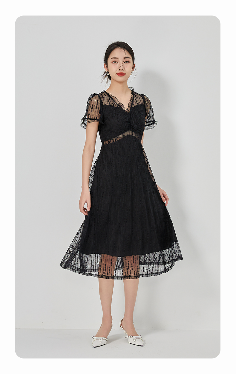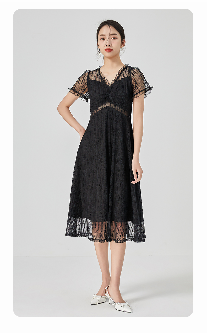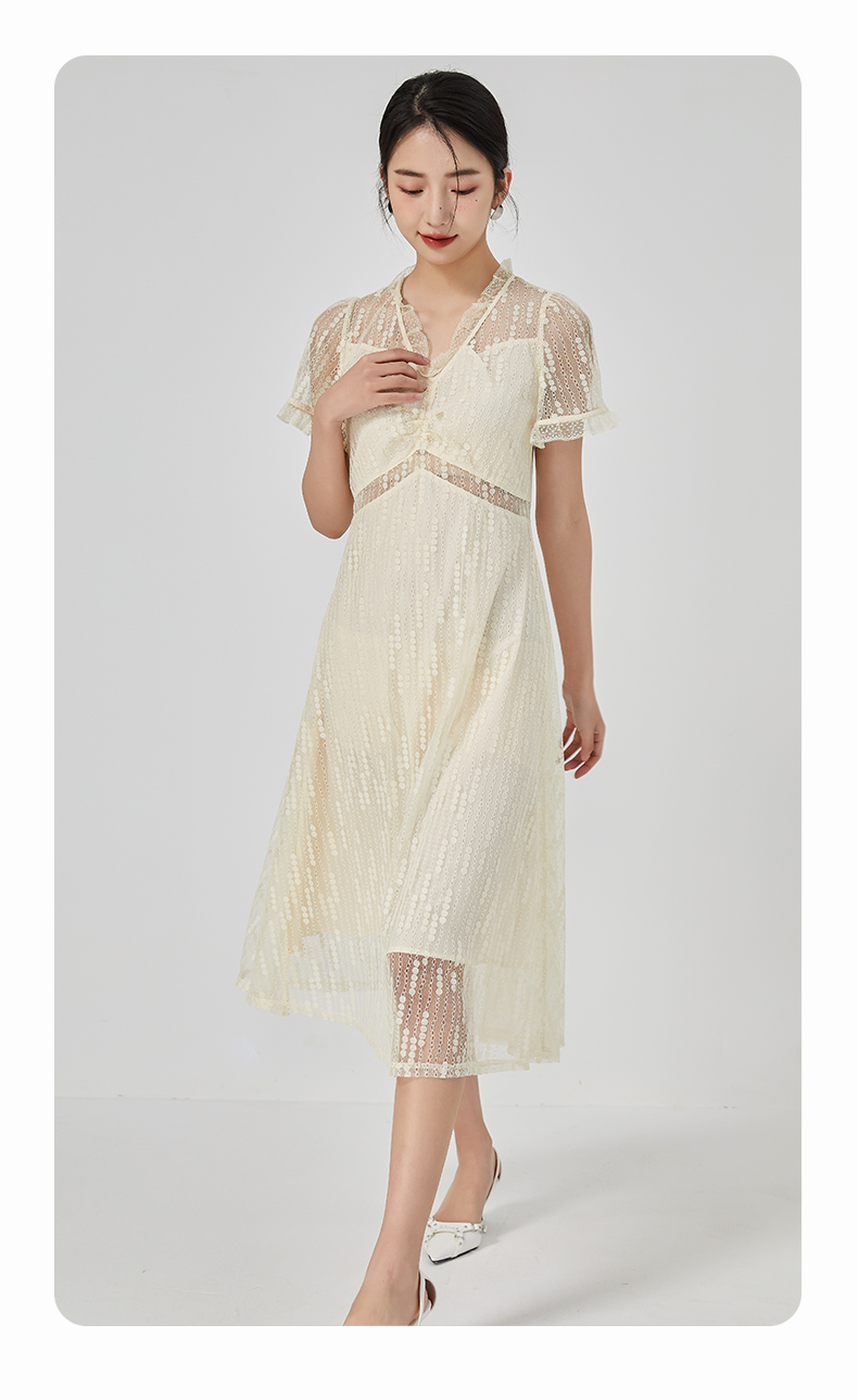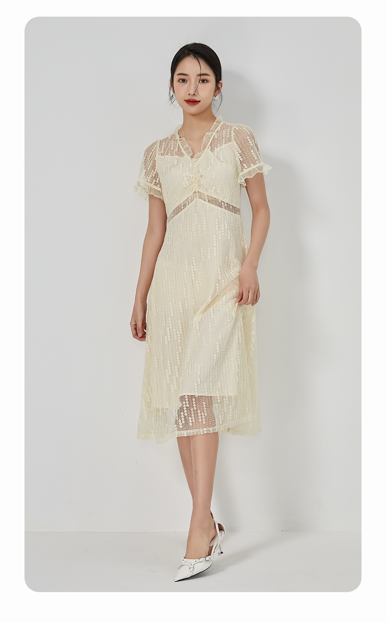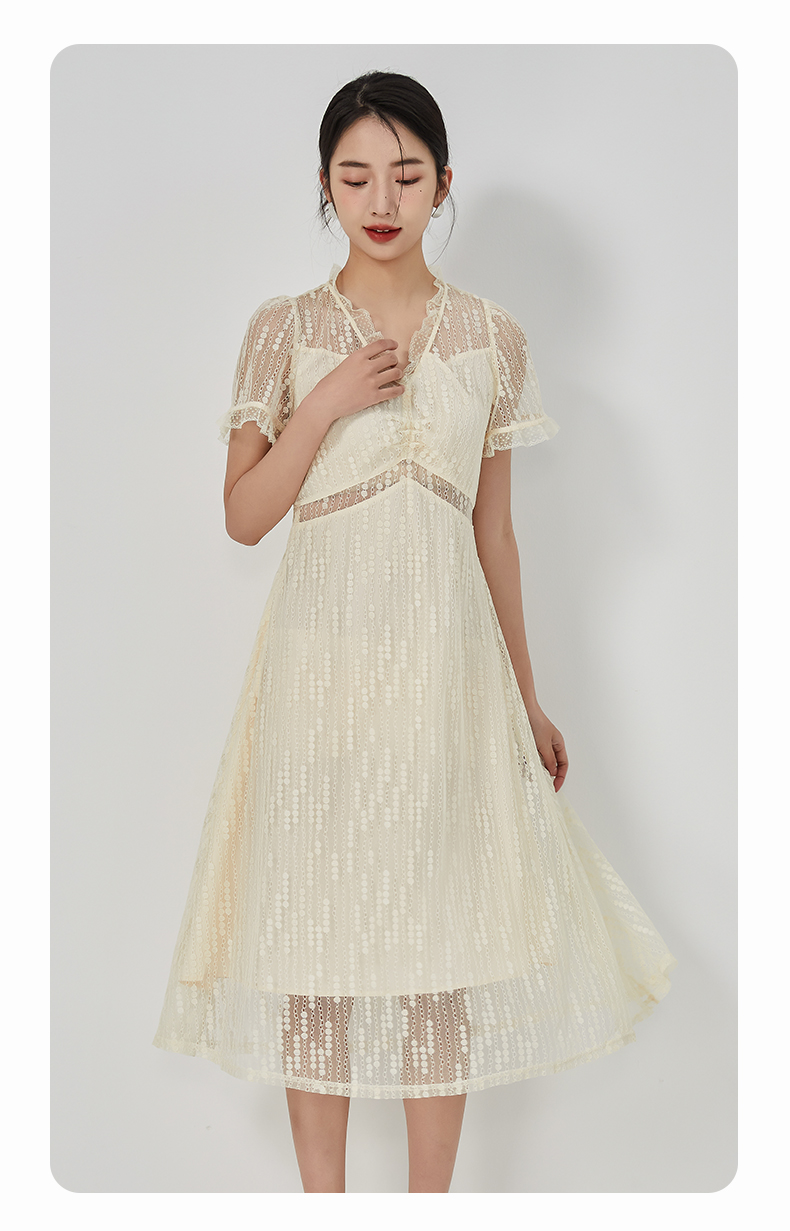 oldcolour2023夏季新款气质V领蕾丝拼接中长款连衣裙女GN21101732