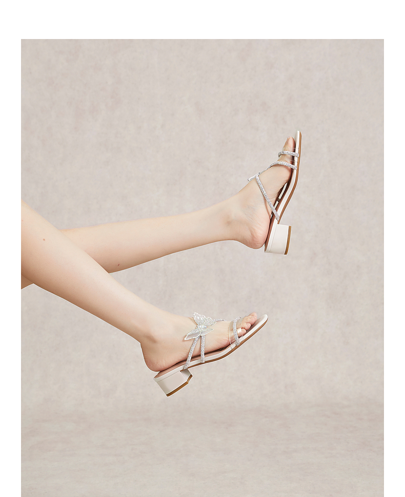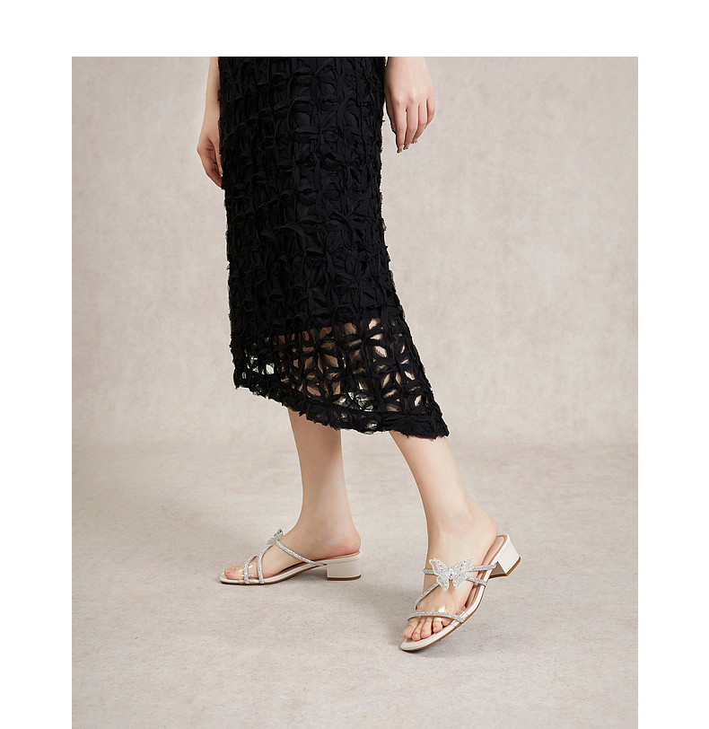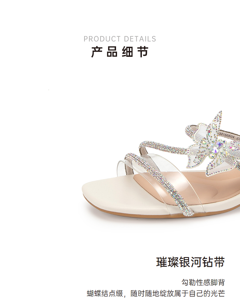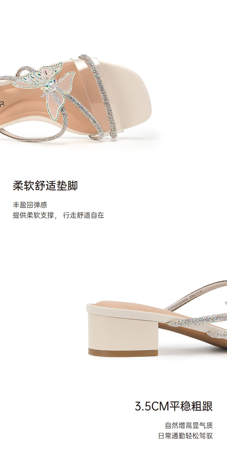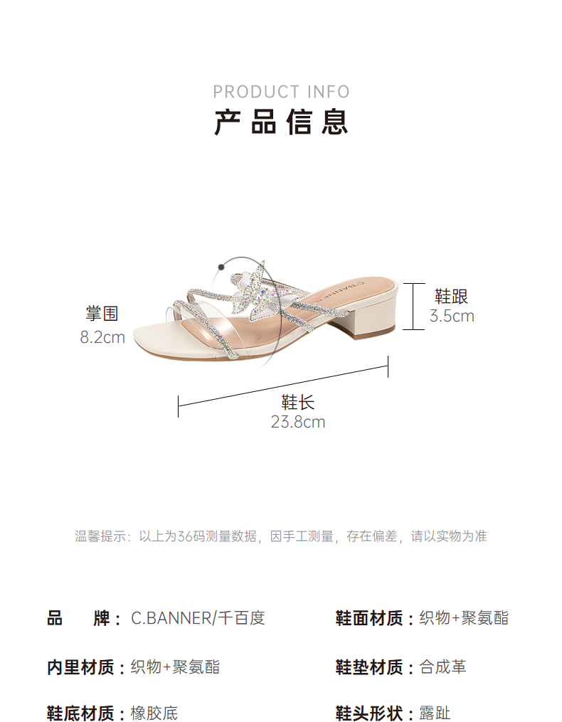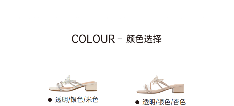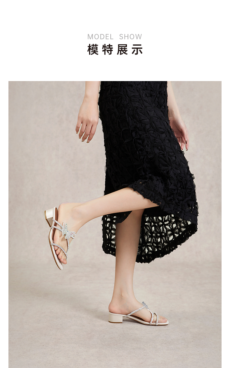 千百度蝴蝶结钻带凉拖鞋女夏季粗跟时尚绝美拖鞋可外穿A24332150