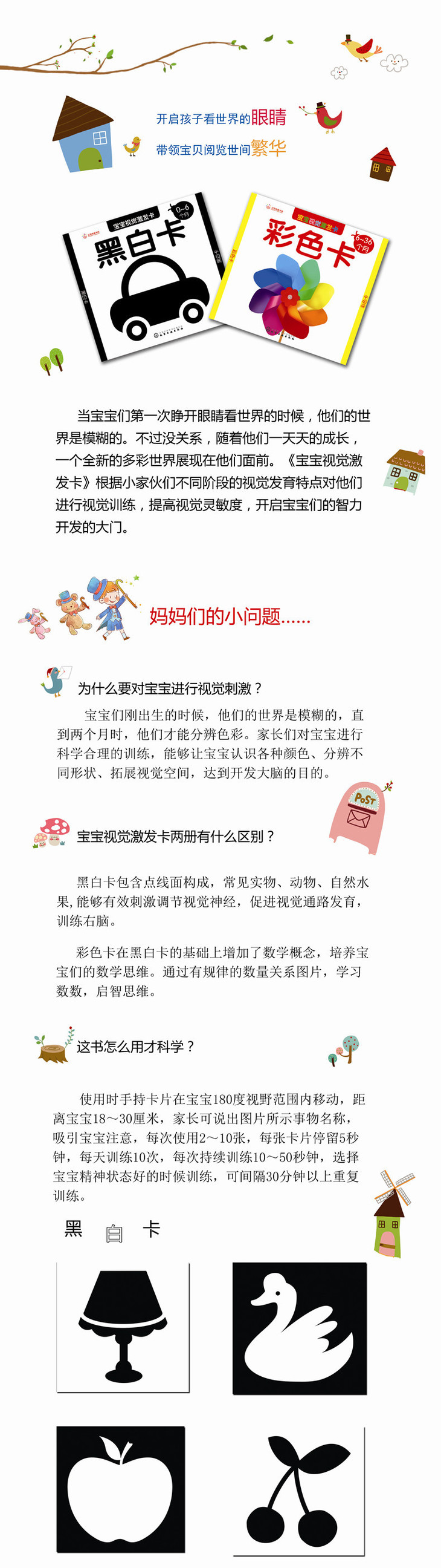 1.在我们的卡片中,图案多为生活中常见的物品、动物、植物、人物等。卡片颜色对比强烈、轮廓鲜明、细节刻画鲜明,更适于0~36个月宝宝。彩色卡多选用实物图,突出事物真实效果,而黑白卡则选用经典图案,多样黑白轮廓线条。通过家长引导性的视觉训练,有助于激发并完善宝宝的视觉发育,激发宝宝探索、观察周围世界的好奇心。