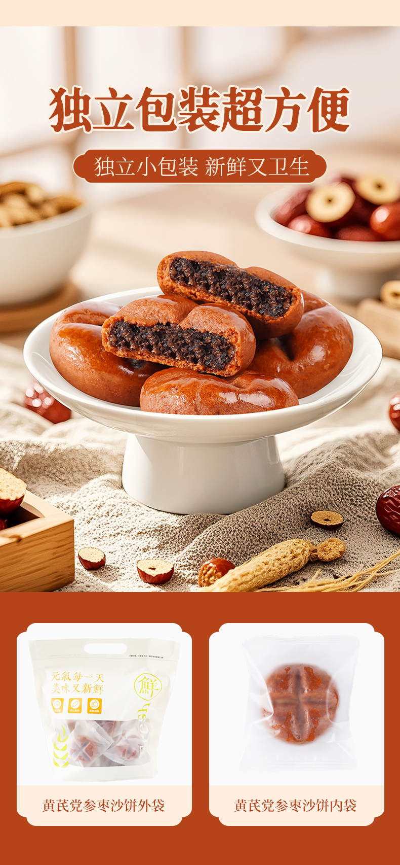 惦味 黄芪党参枣沙饼250g*3袋 (10个/袋)皮薄馅厚,软乎乎入口软糯清爽,淡淡香甜的健康粗粮糕点,老人小孩都可以放心食用;