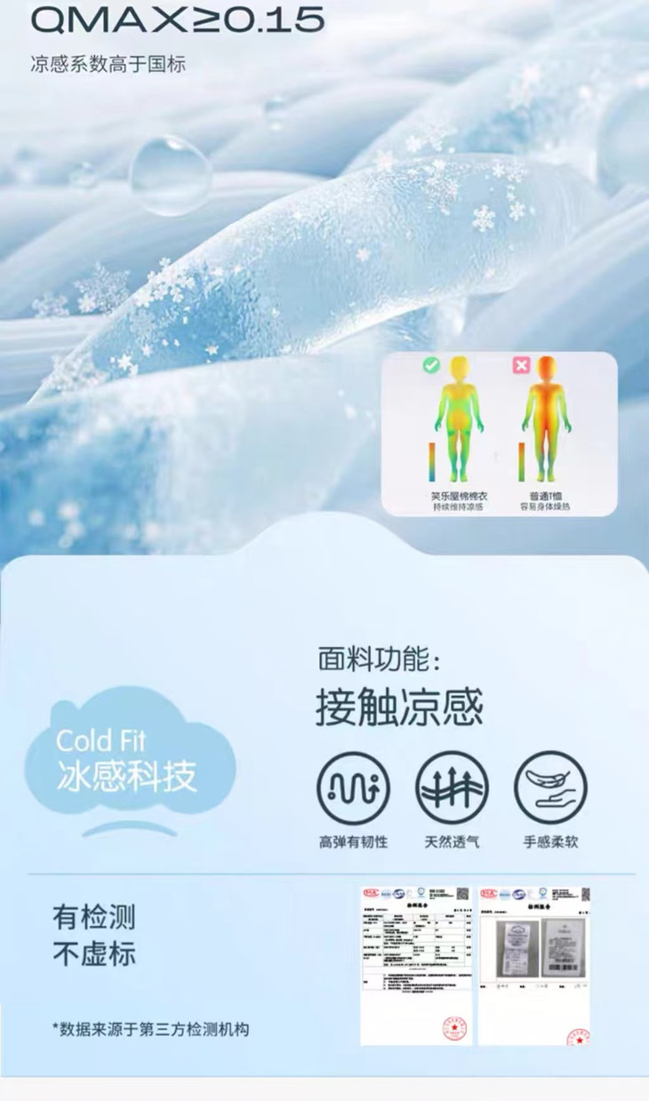 🔺持证上岗 舒适又安心 ✅凉感系数高于国际 QMAX≥0.15 ✅面料功能:接触凉感 ✅高弹有韧性、天然透气、手感柔软 ✅A类母婴级标准 ✅PH检测 ✅色牢度检测 ✅甲醛检查