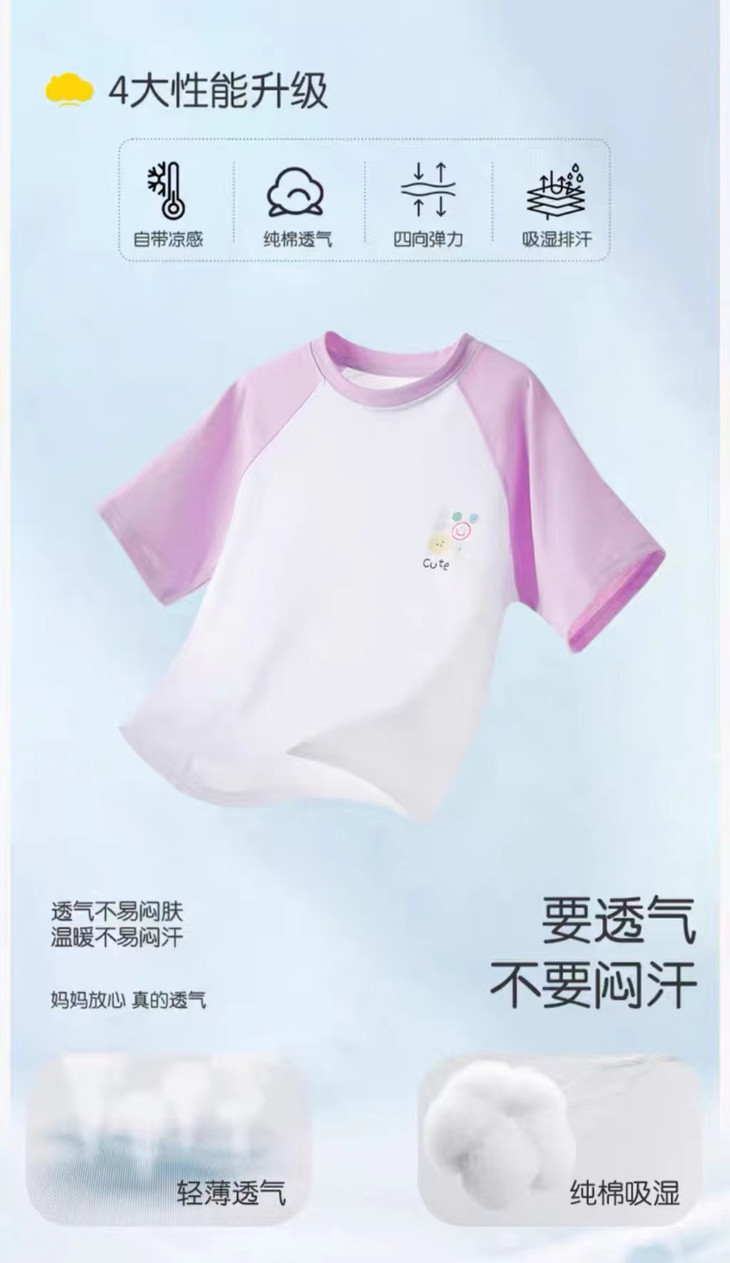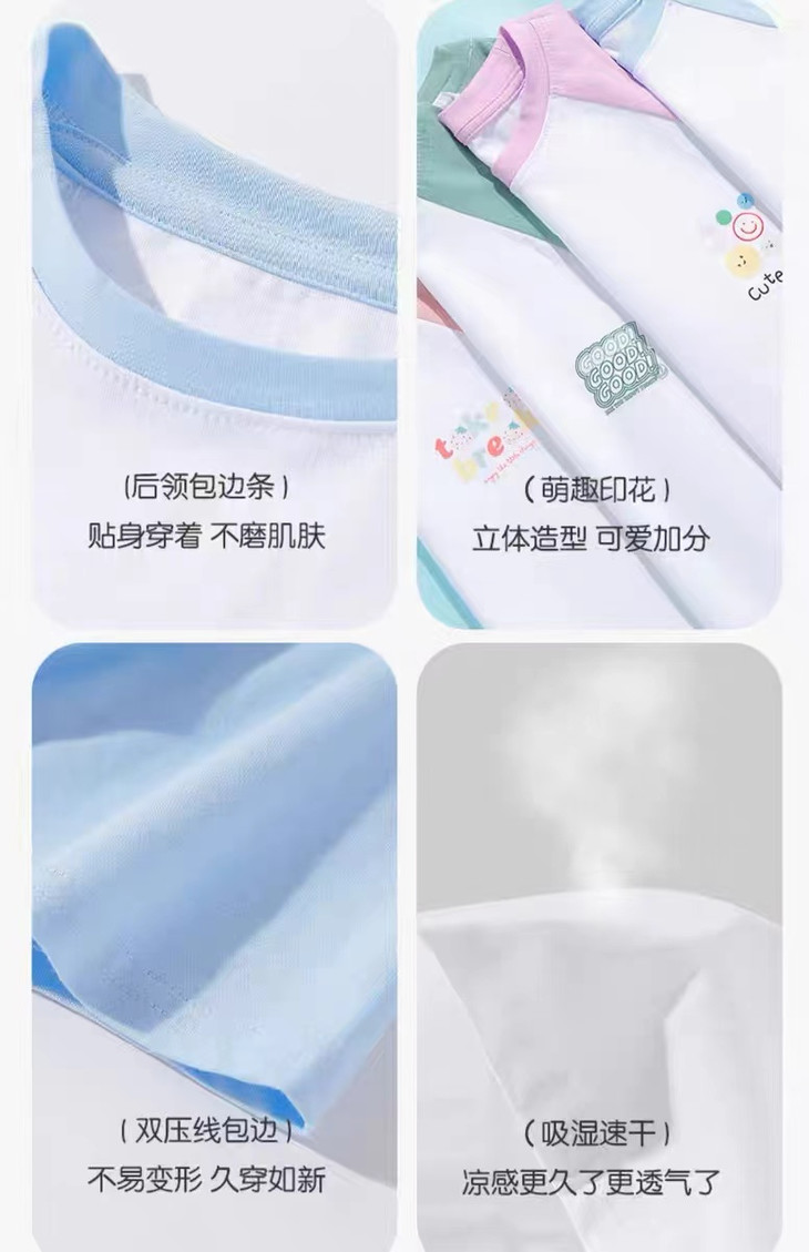 🔺更多暖心设计 细节之处更是深入人心 ✅后领包边条 贴身穿着 不磨肌肤 ✅萌趣印花 立体造型 可爱加分 ✅双压线包边 不易变形 久穿如新 ✅呼汗透气 凉感更久了更透气了