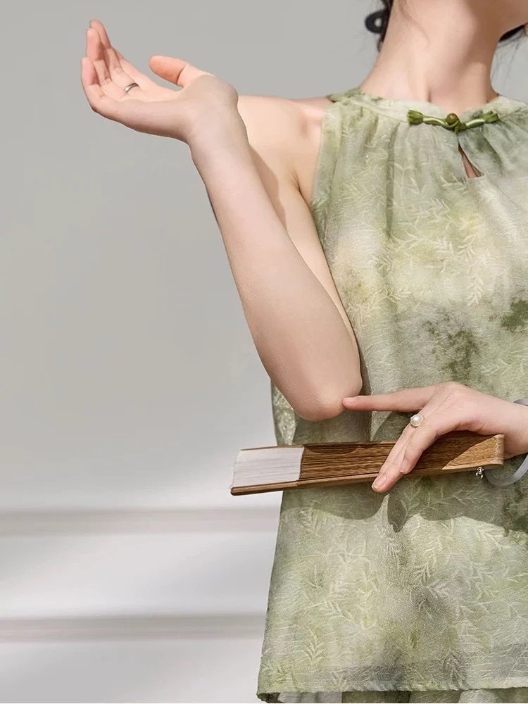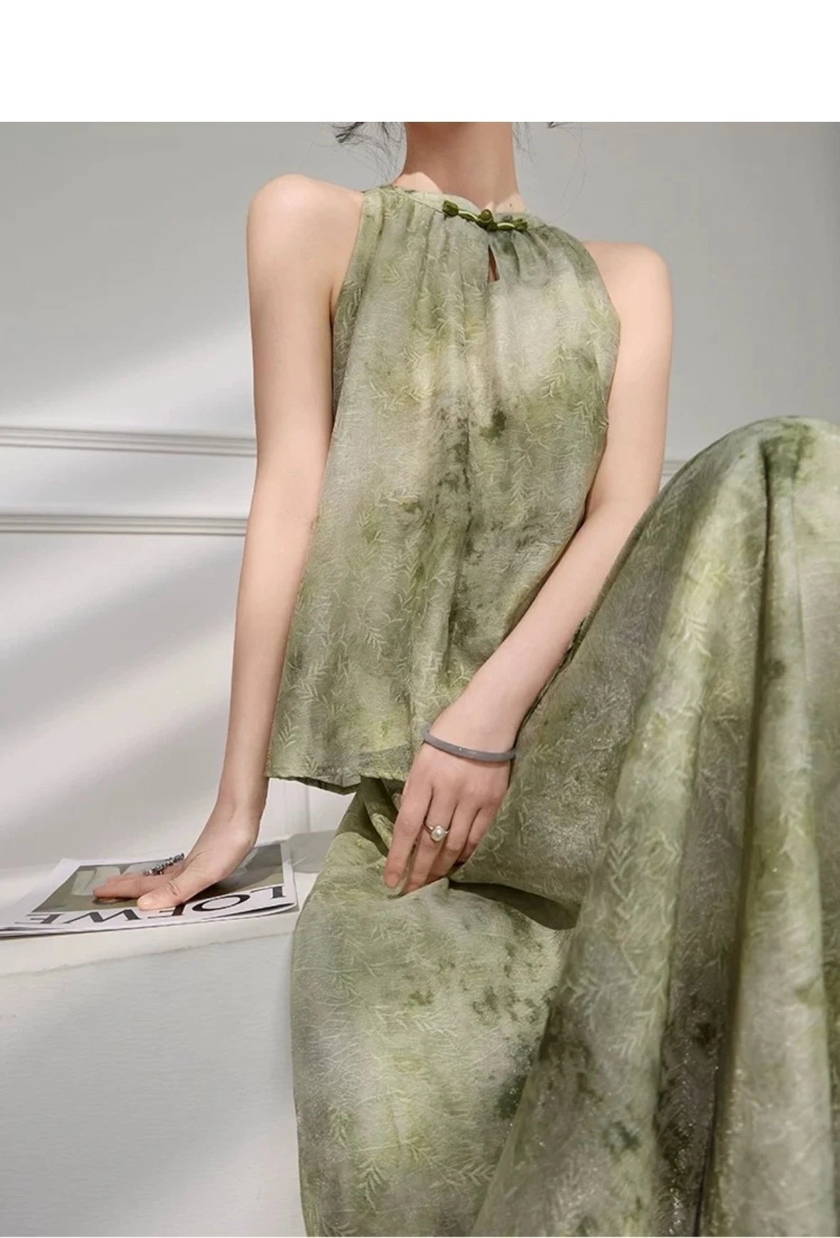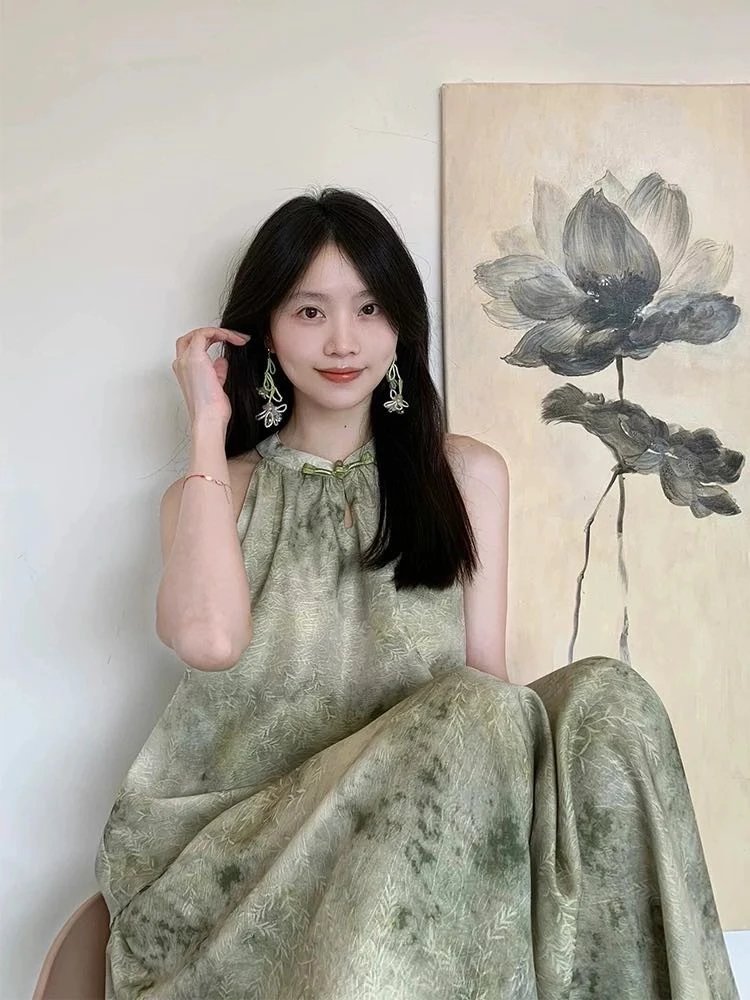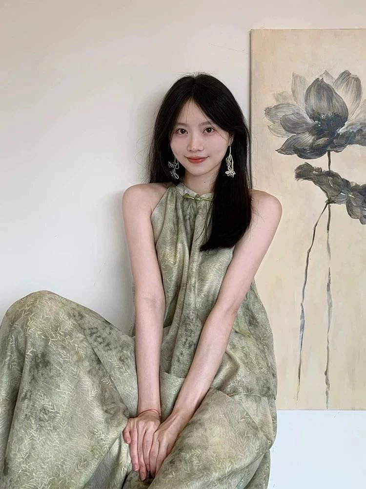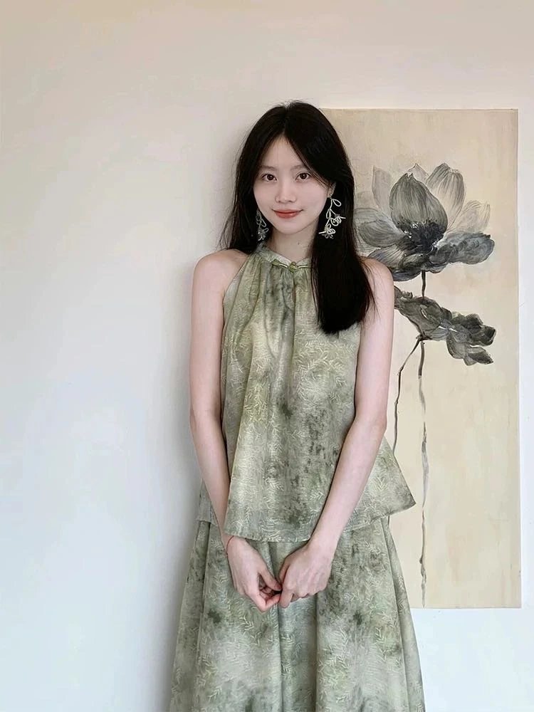 设计:挂脖领口+精致盘扣,中式元素狠狠拿捏,典雅又别致,东方韵味拉满。上衣宽松有层次,悄悄把肉肉藏起来;阔腿长裙chao会修饰身形,随性大气,走路都带风~