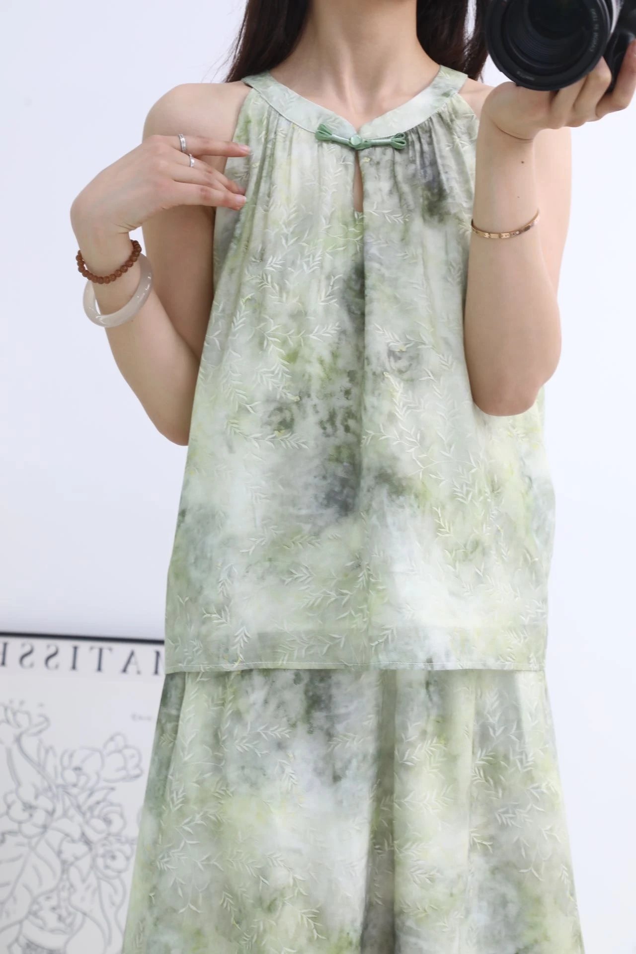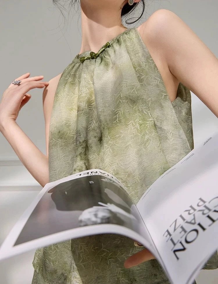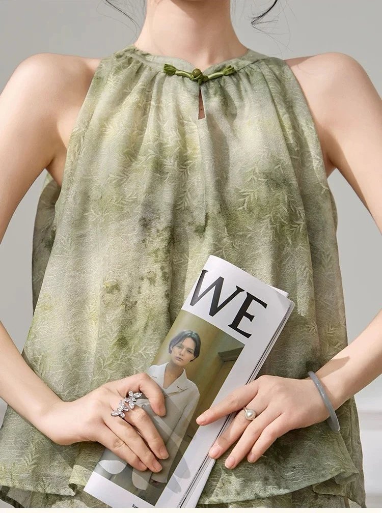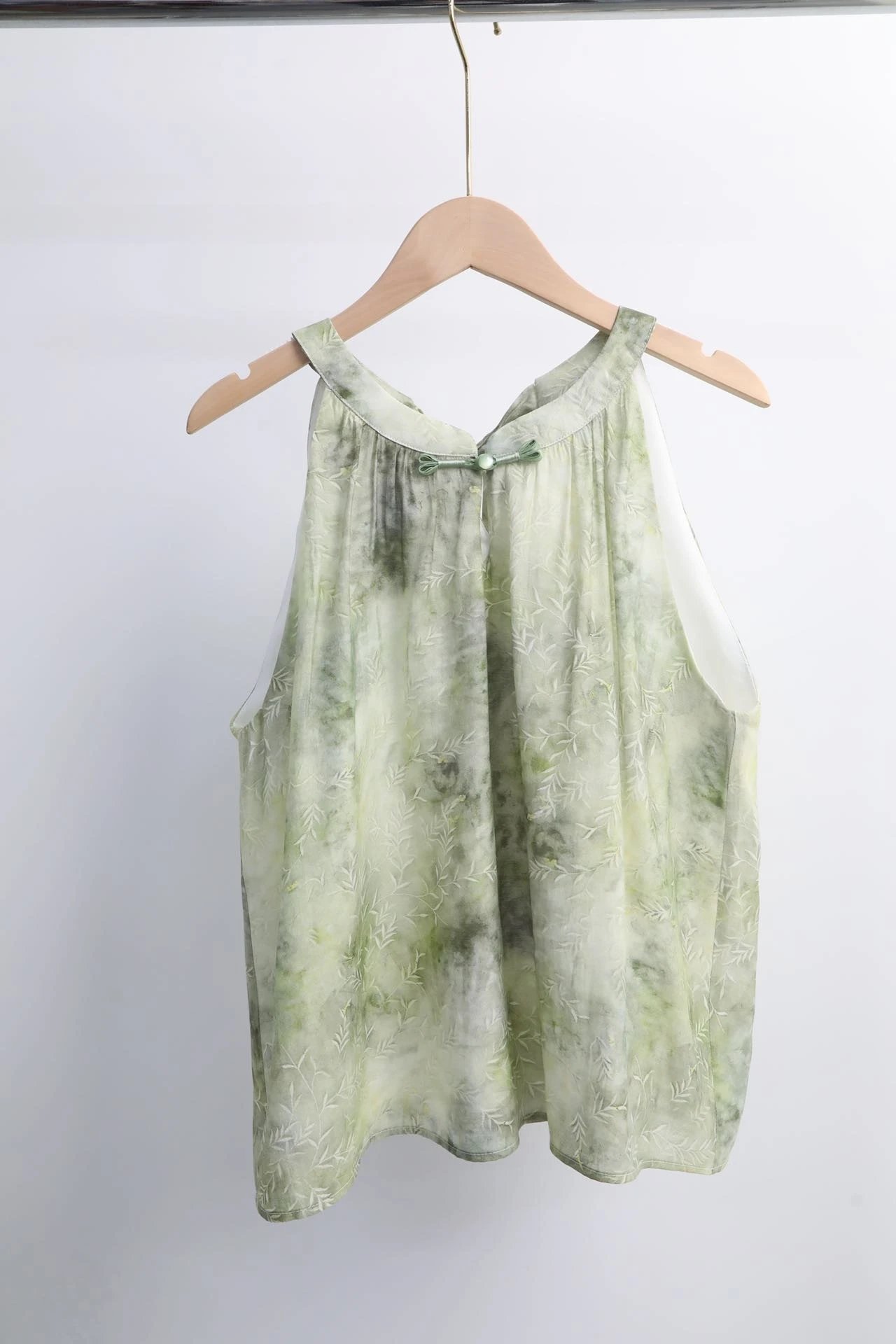 【商品品名】新中式桑蚕丝盘扣挂脖提花上衣