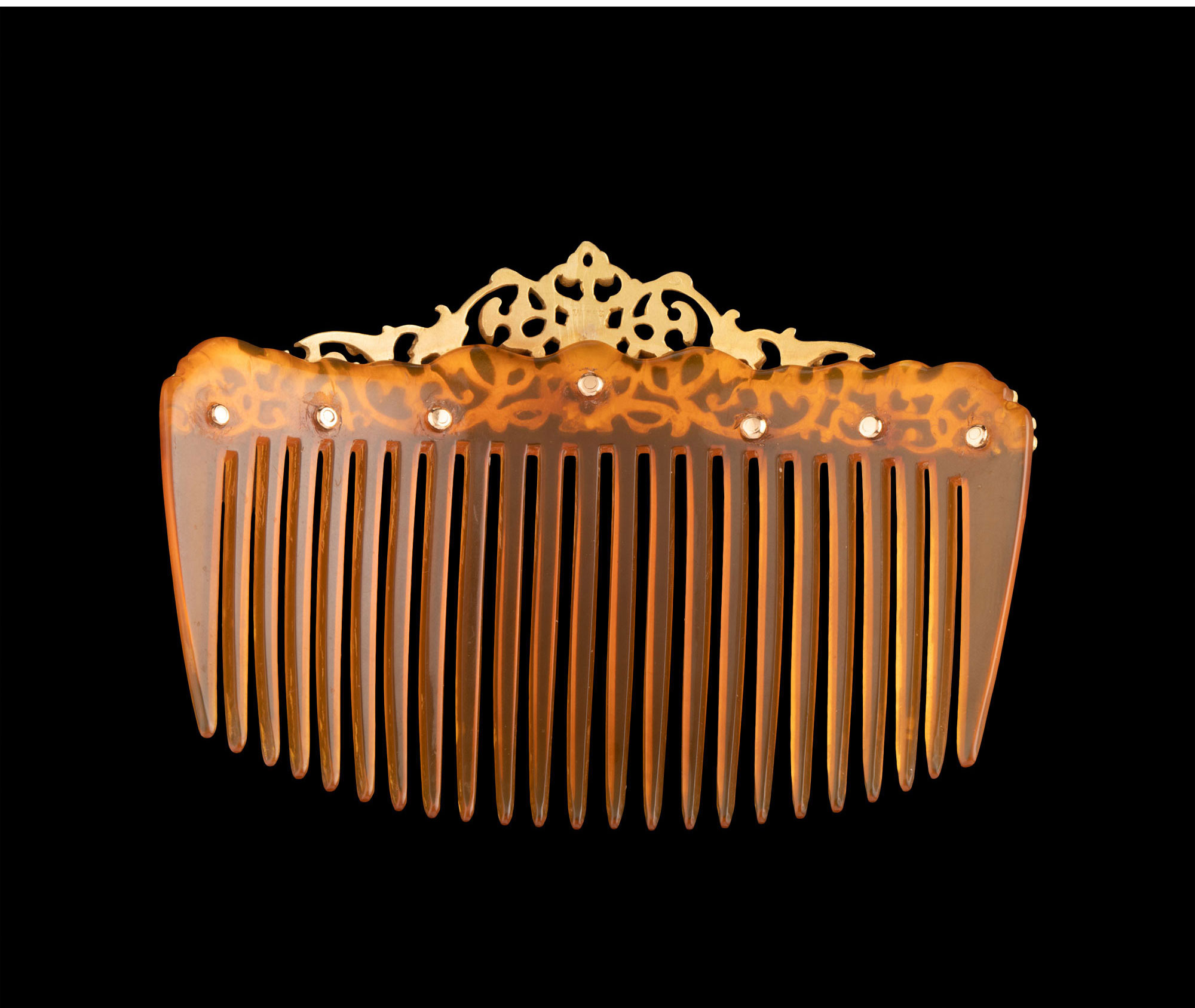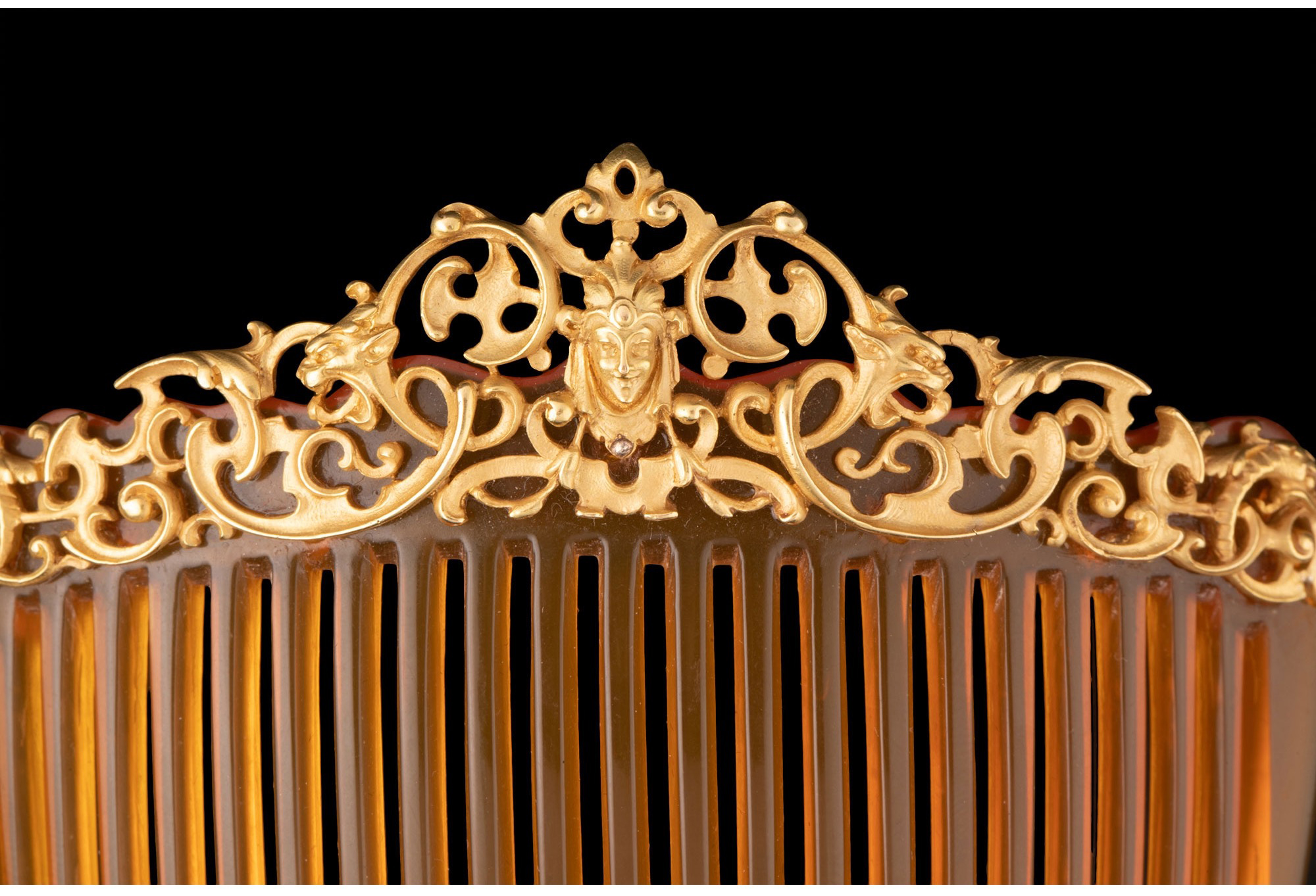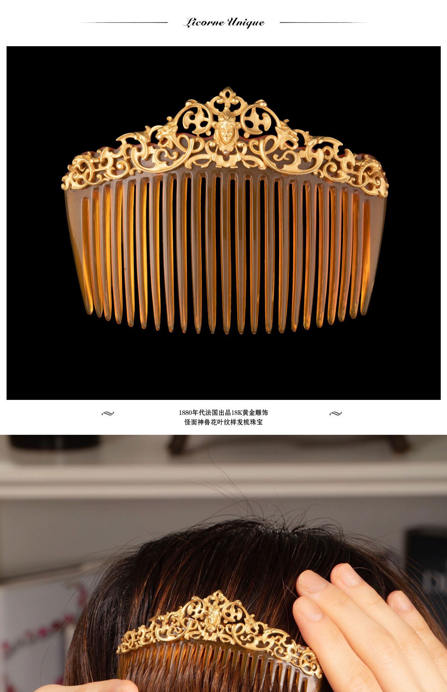 独角鹿西洋古董珠宝法国18K黄金雕饰怪面神兽花叶纹样发梳发饰
