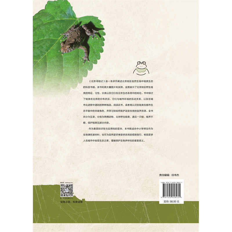 "《北京寻蛙记》是一本介绍北京地区野生蛙类的生态科普读物。本书以通俗易懂的语言,结合丰富的图片和实例,系统介绍了北京野生蛙类的基本特征、生活习性、分类地位、在北京地区的分布情况、蛙类与北京生态环境的关系以及蛙类城市生活面对的难题等。通过阅读本书,读者可以了解到蛙类在生态系统中的重要作用,以及如何保护这些珍贵的自然资源。