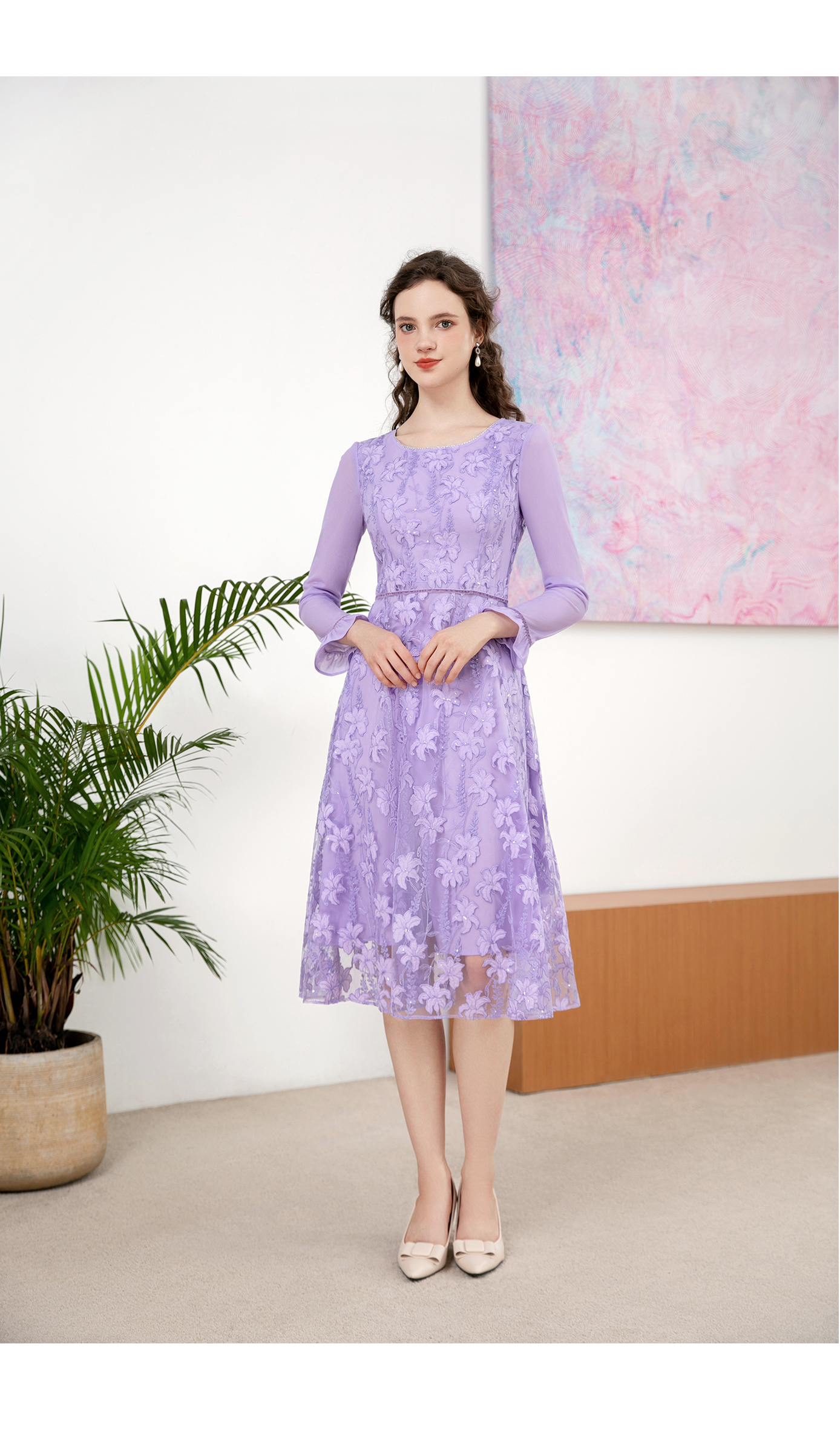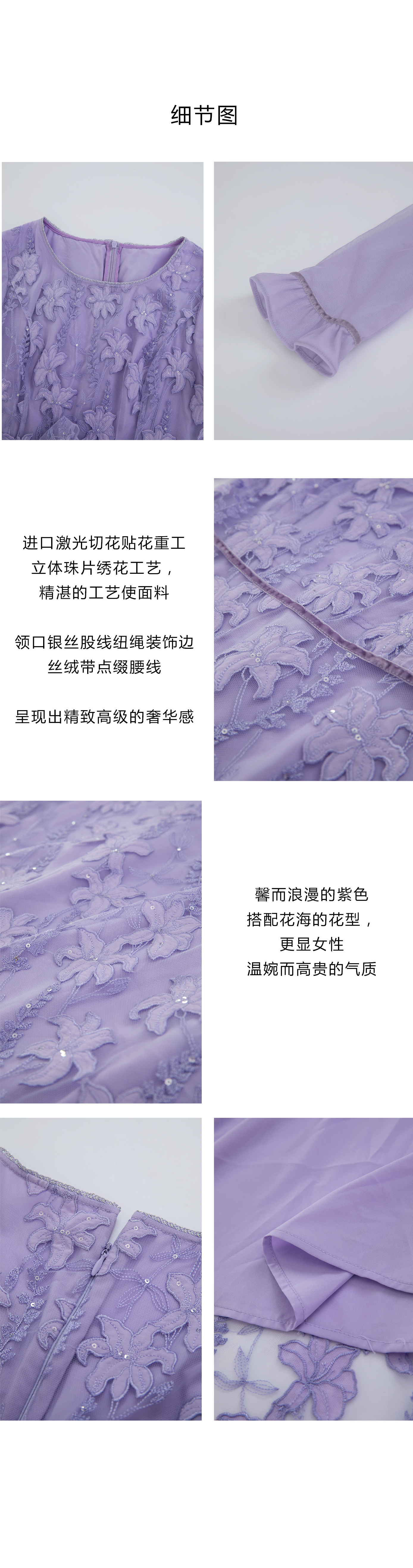 司歌刺绣长袖重工连衣裙紫色A901068X