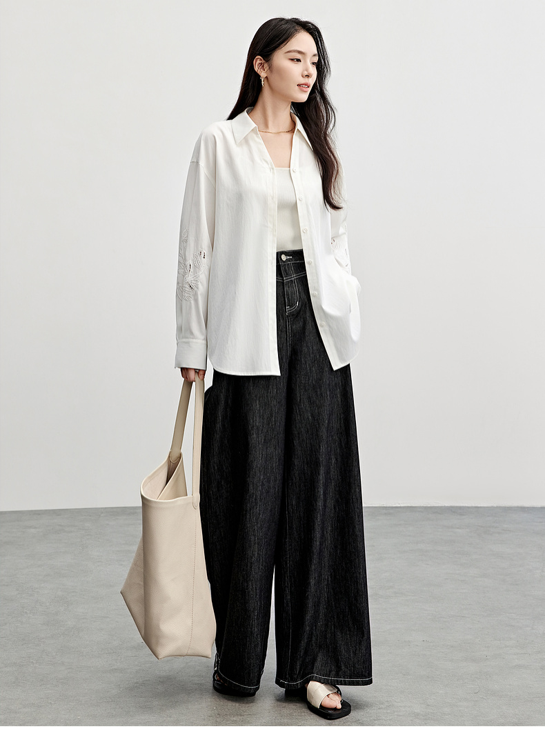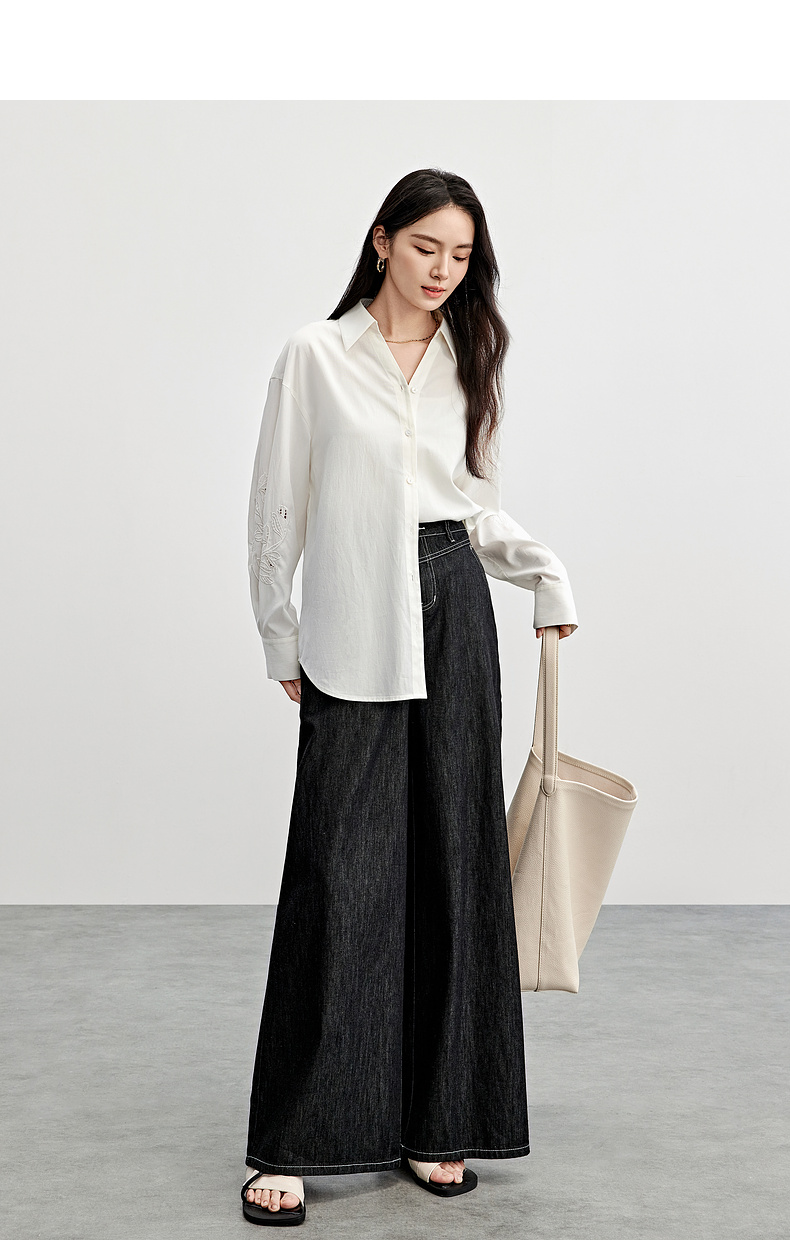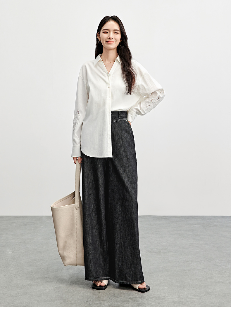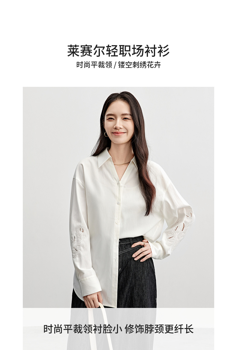 【内购】轻职场通勤镂空刺绣花卉落肩长袖宽松柔软清爽衬衫-151C57983