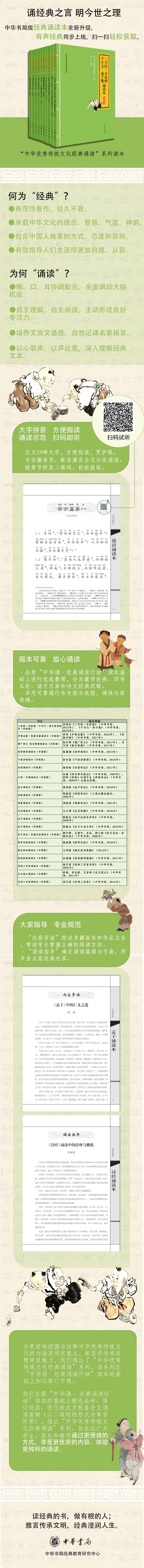 为更好地挖掘与诠释中华优秀传统文化的内涵及现实意义,彰显并传承其精神及魅力,中华书局推出了“中华优秀传统文化经典诵读”系列。该系列在“中华诵·经典诵读行动”读本的基础上加以修订升级。