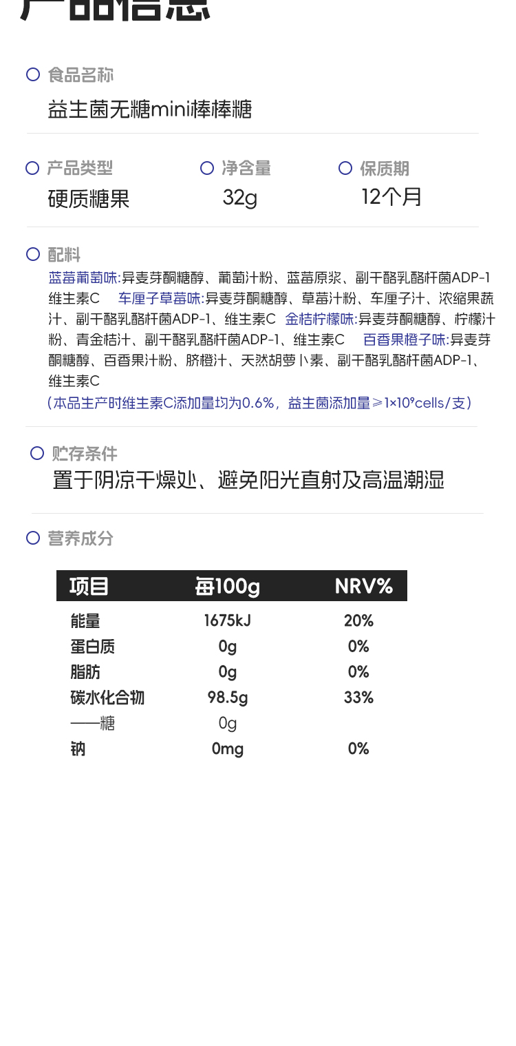 【产品名称】:益生菌无糖mini棒棒糖/32g