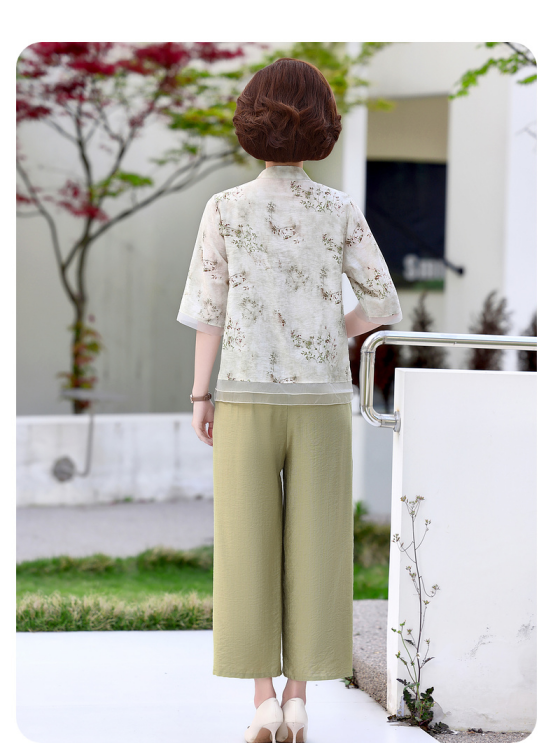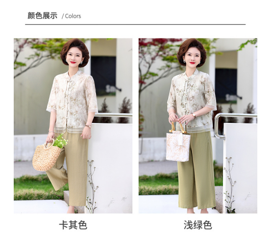 夏季新中式花卉中袖小衫两件套J1162 【新中式短袖+阔腿裤】套装,品质颜值都在线,就算是妈妈装也能高贵洋气❗ ✅宽松版型,减龄又显瘦,适合全年龄段妈妈 ✅面料柔软带肌理感,不缩水不起球不掉色 ✅2色可选,夏日良配 夏季穿舒适又凉爽的 新中式国风洋气套装给大家准备好了 吸汗透气性好,亲肤舒适,触感柔软 即使出汗也不会粘在身上 适合任何场合,胖瘦都能穿
