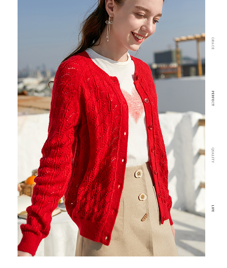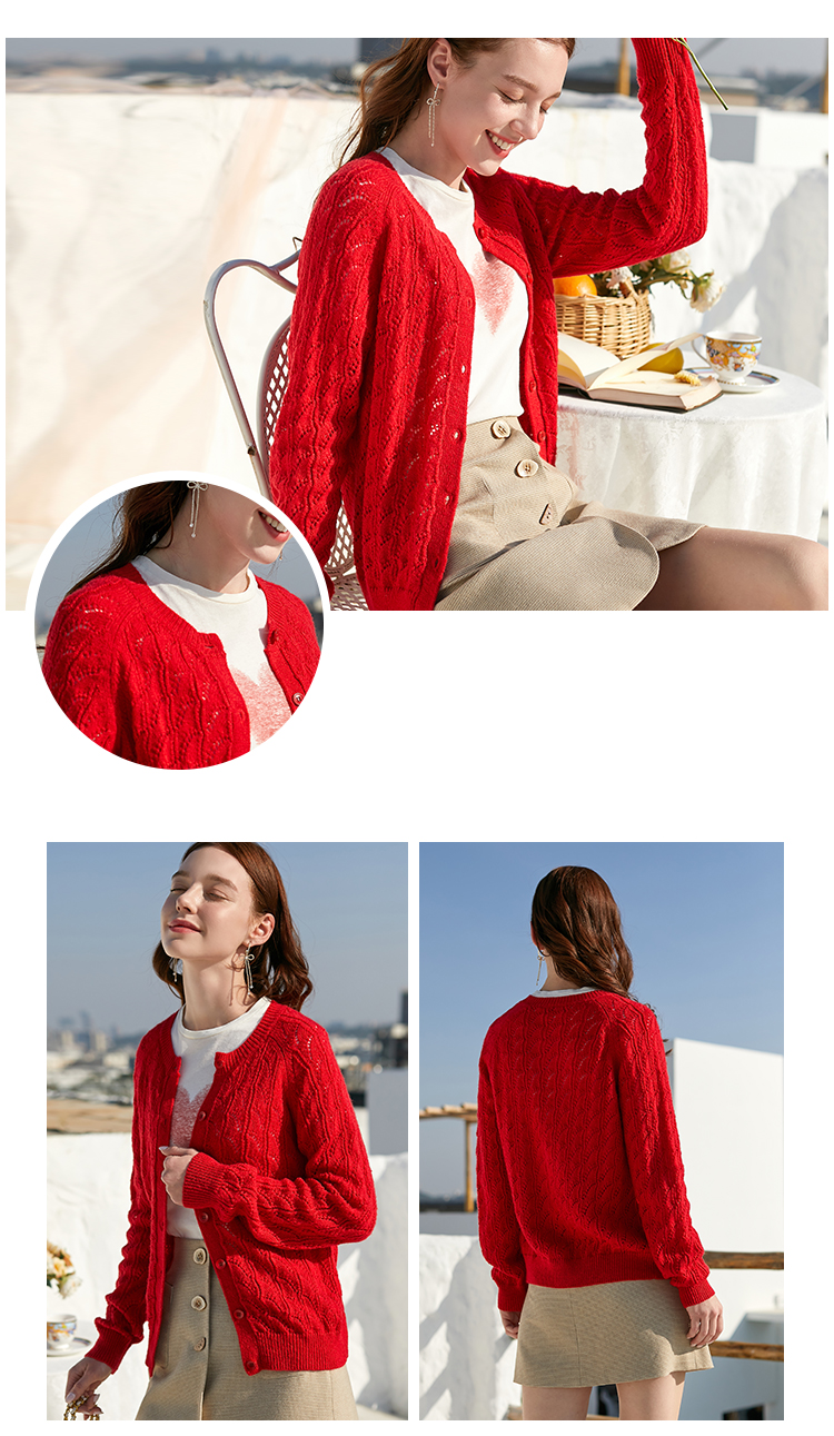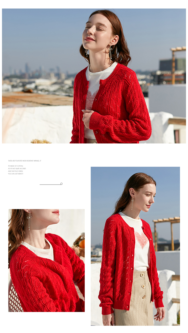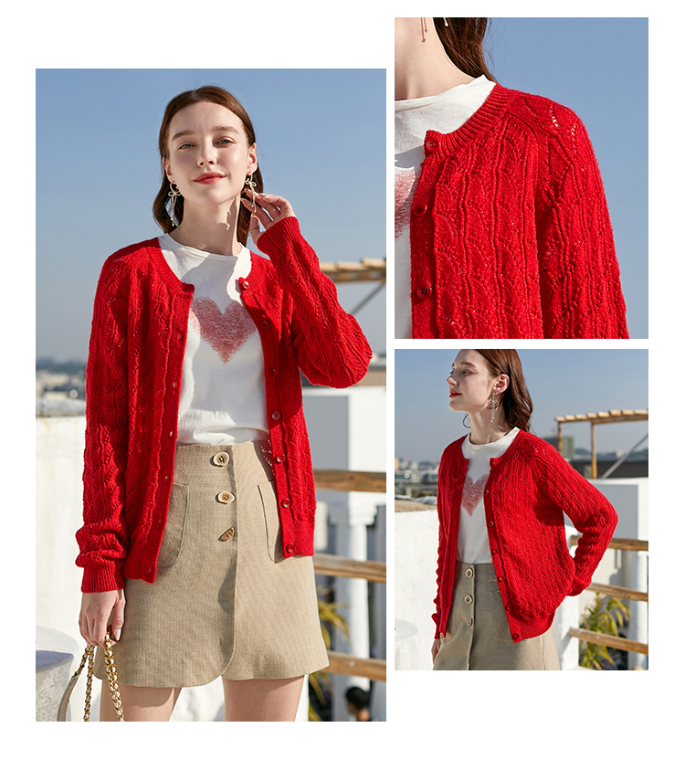 欧芮儿年春新款长袖开衫毛针织衫女宽松镂空红色毛衣内搭