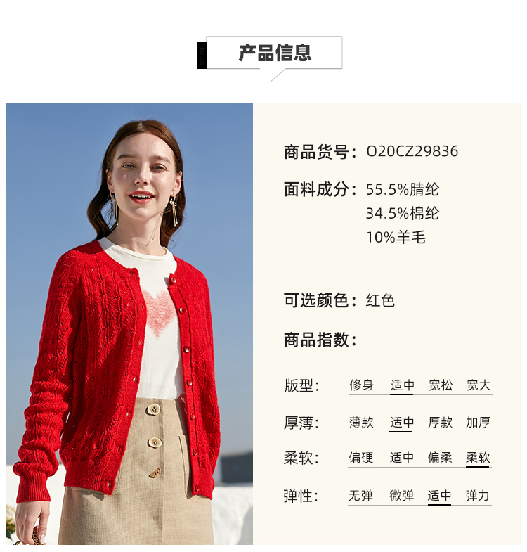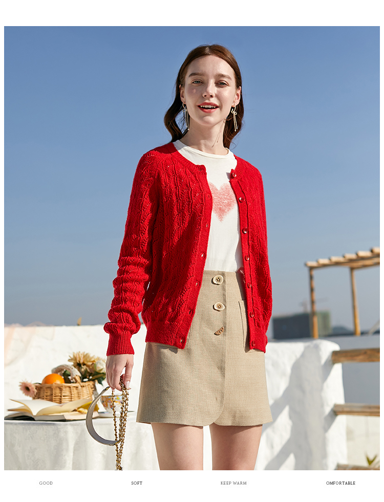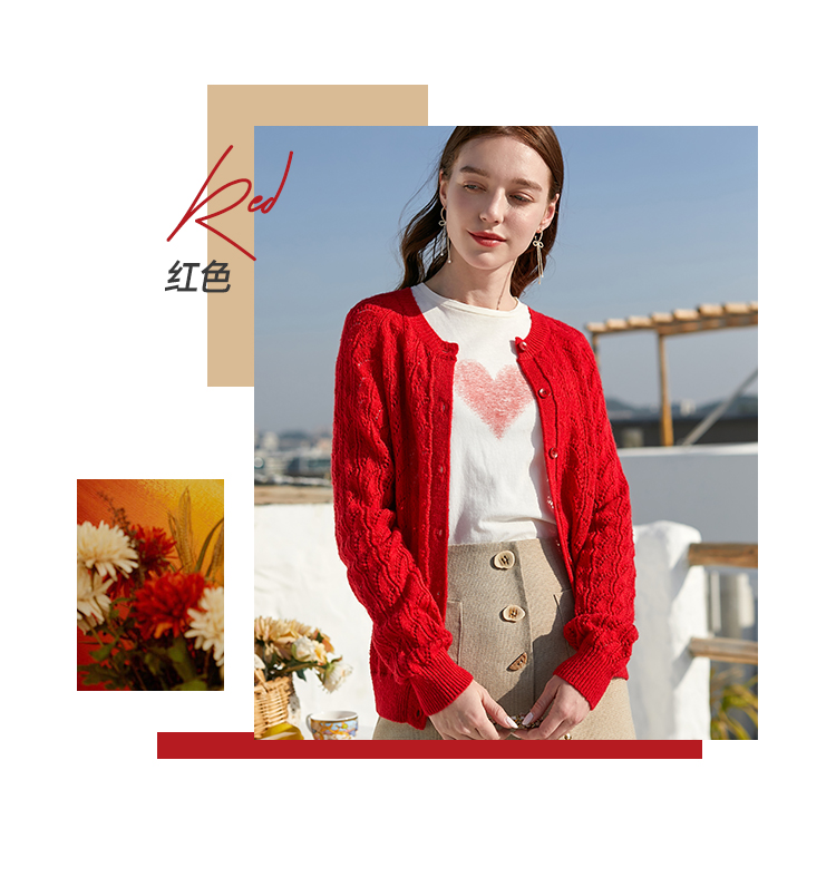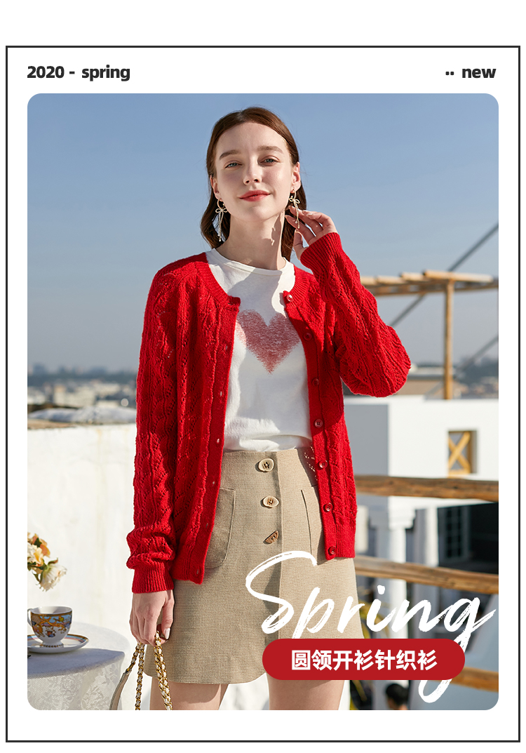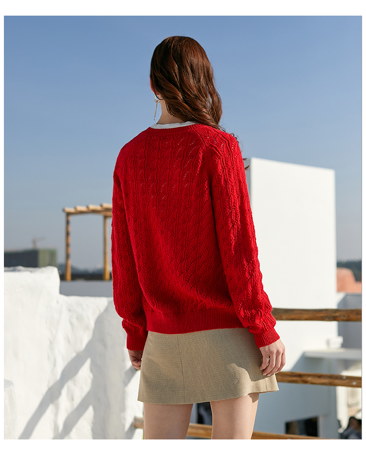 欧芮儿年春新款长袖开衫毛针织衫女宽松镂空红色毛衣内搭