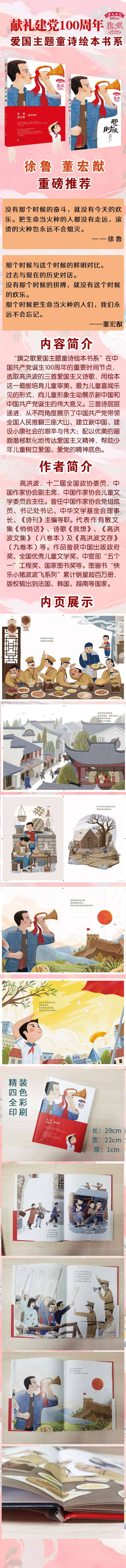 “旗之歌爱国主题童诗绘本书系”在中国共产党诞生100周年的重要时间节点,选取高洪波的三首爱国主义诗歌,用绘本这一最能培育儿童审美、最为儿童喜闻乐见的形式,向儿童形象生动展示新中国和中国共产党诞生的伟大意义。三首诗层层递进,从不同角度展示了中国共产党带领全国人民推翻三座大山、建立新中国、建设小康社会的艰辛与伟大;配以优美的画面潜移默化地传达爱国主义精神,帮助少年儿童树立爱国、爱党的精神底色。