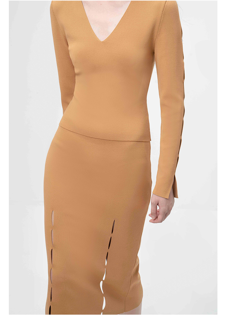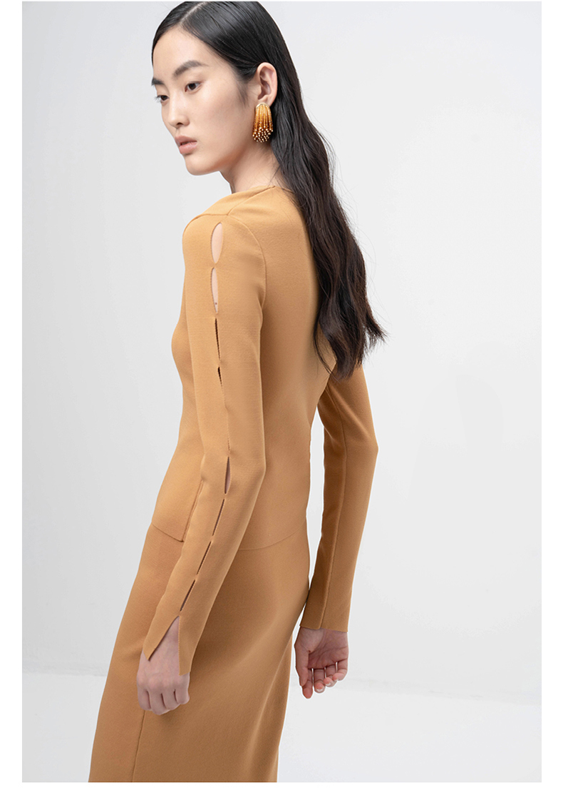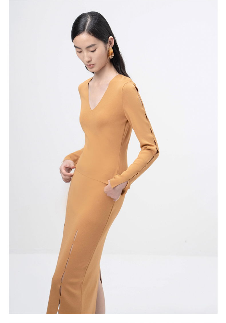 【隙】细缝镂空设计藤黄V领长袖针织上衣/202112A