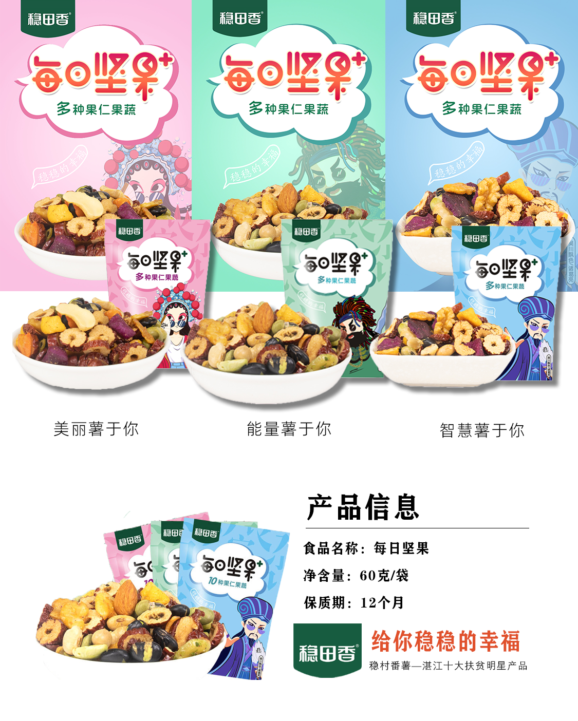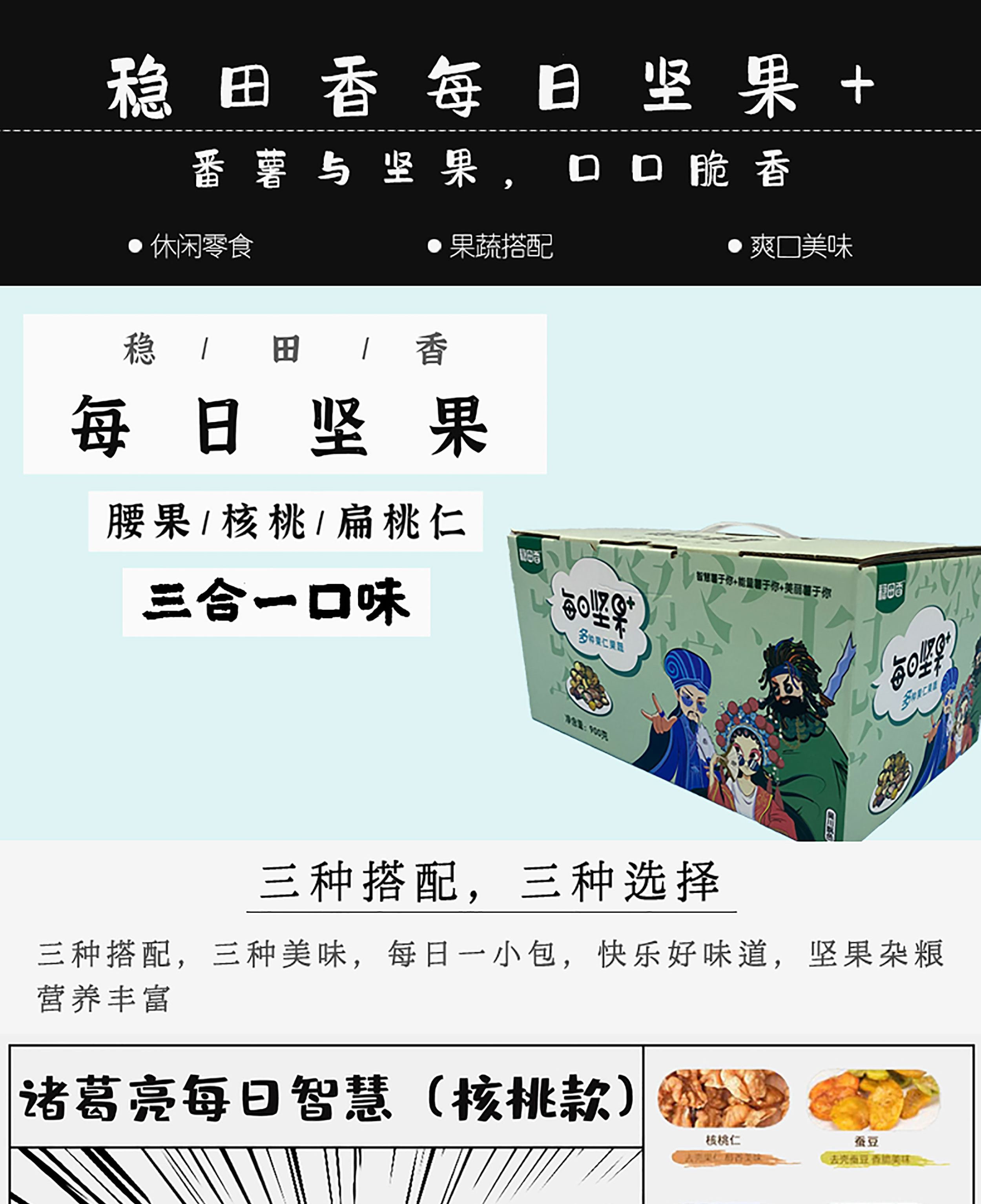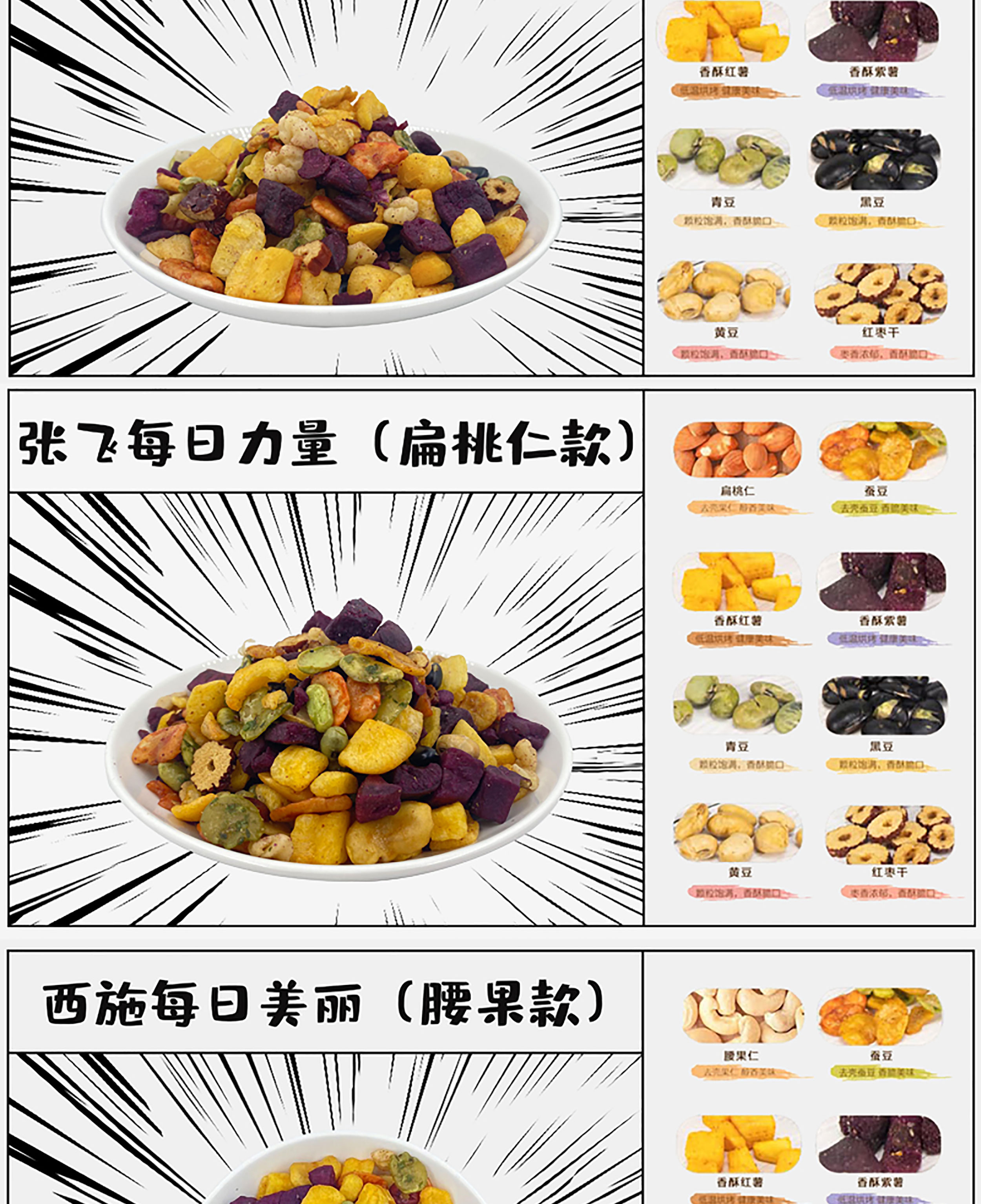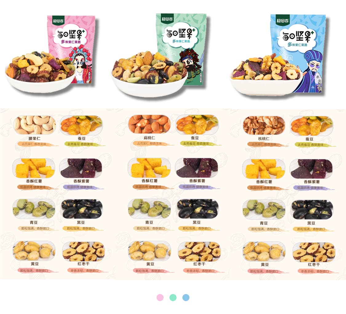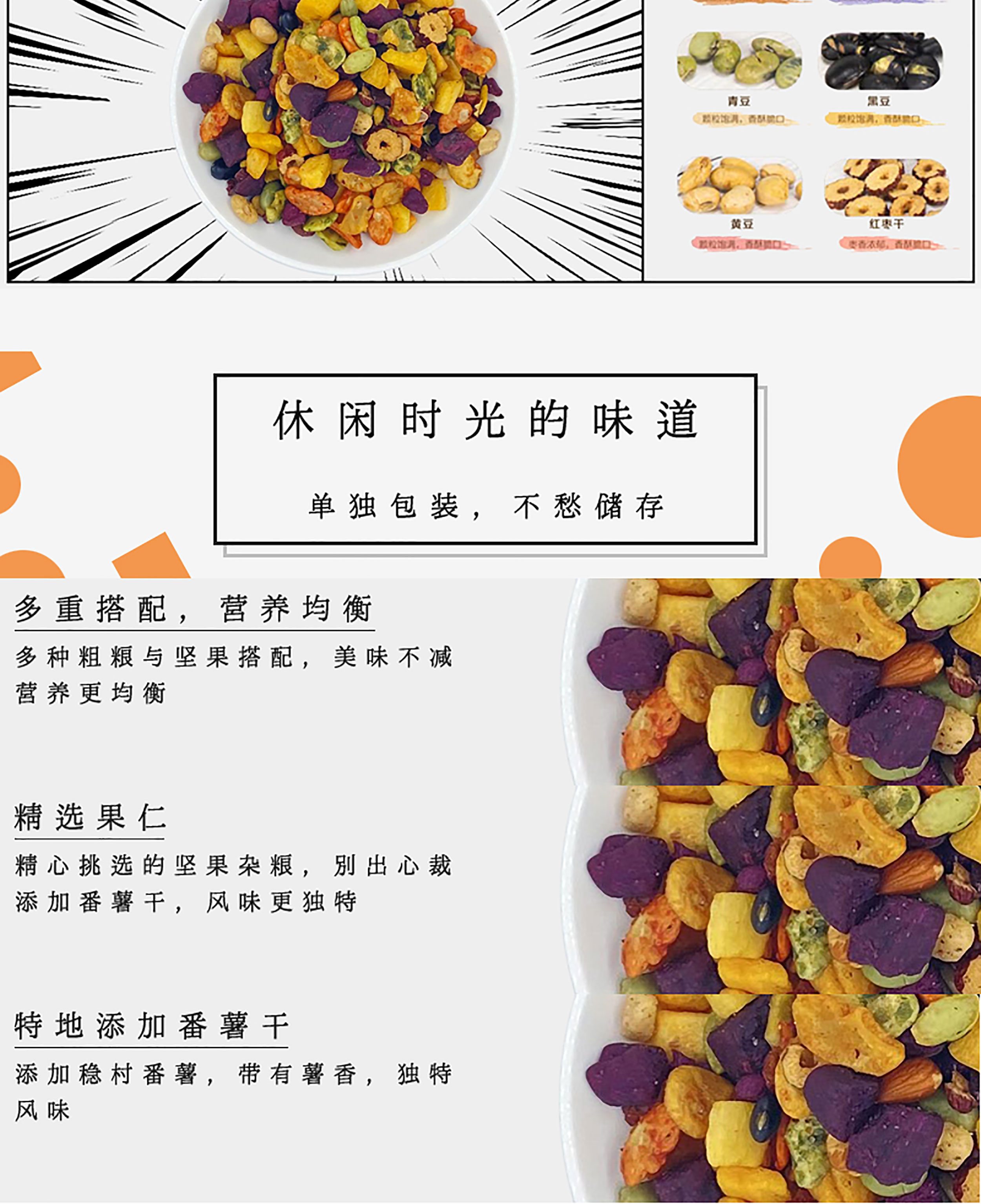 多种粗粮与坚果搭配,美味不减,营养更均衡,精心挑选的坚果杂,别出心裁添加番薯干,风味更独特