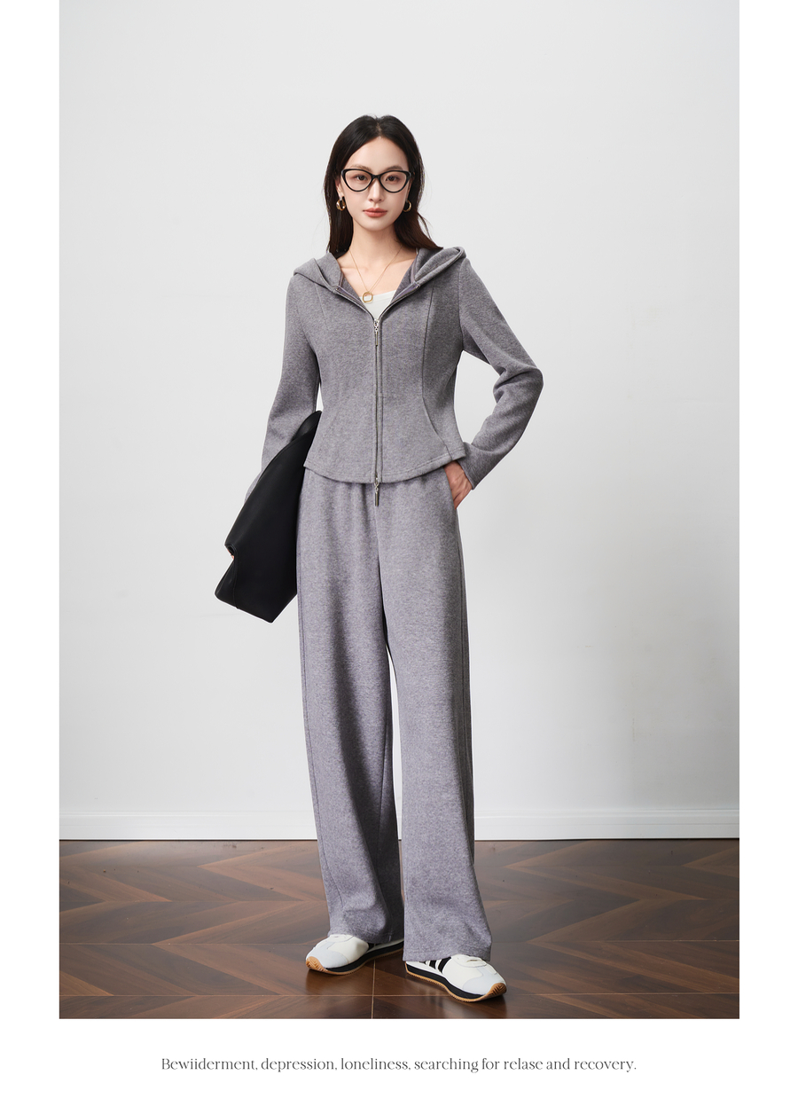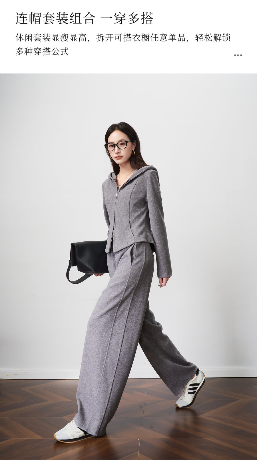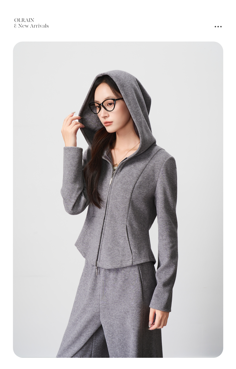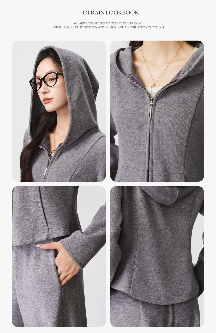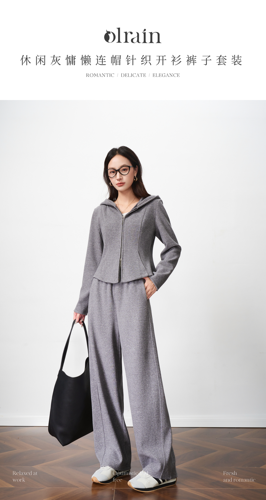 OLrain欧芮儿2025新款女秋季休闲灰慵懒连帽针织开衫裤子两件套装