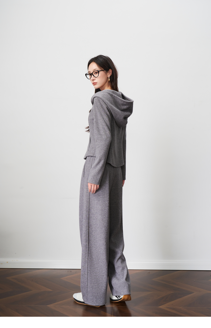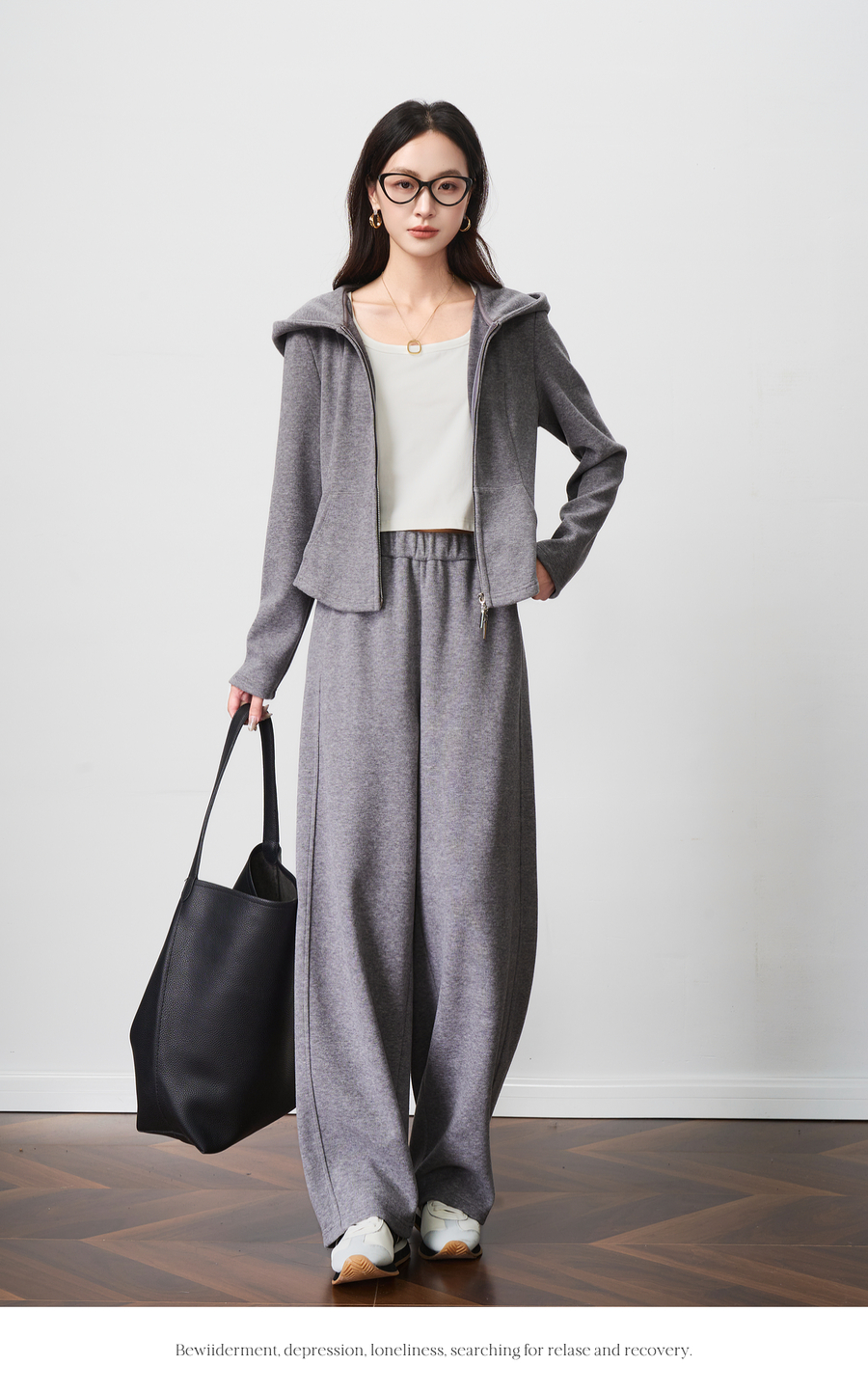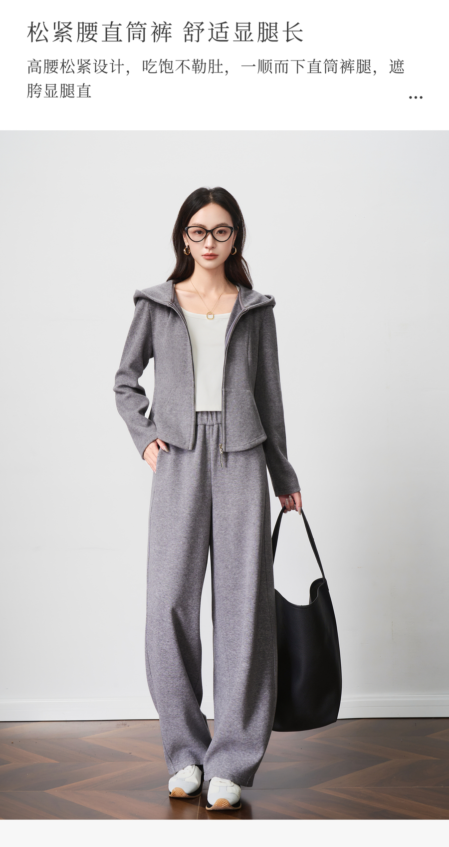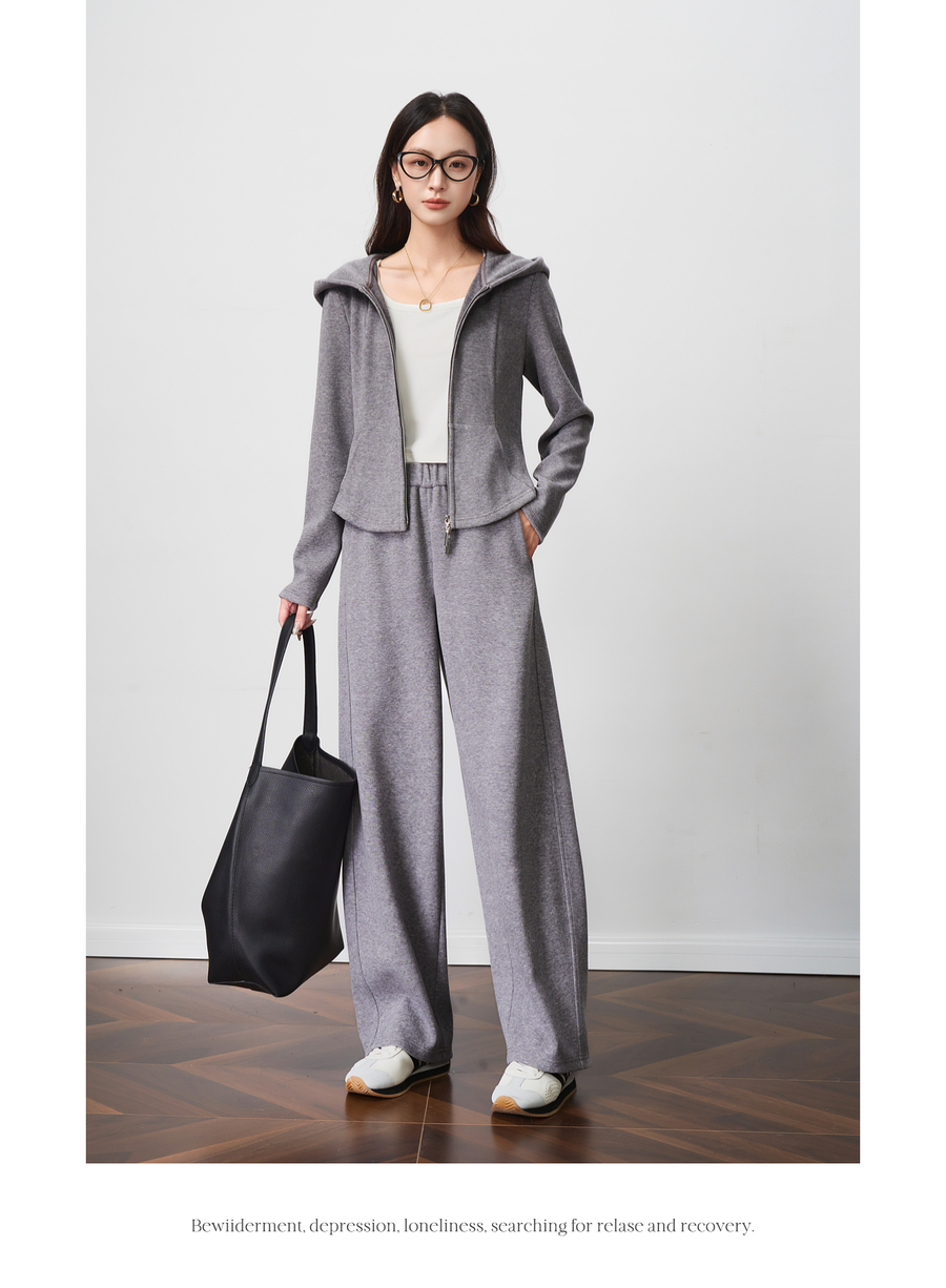 OLrain欧芮儿2025新款女秋季休闲灰慵懒连帽针织开衫裤子两件套装