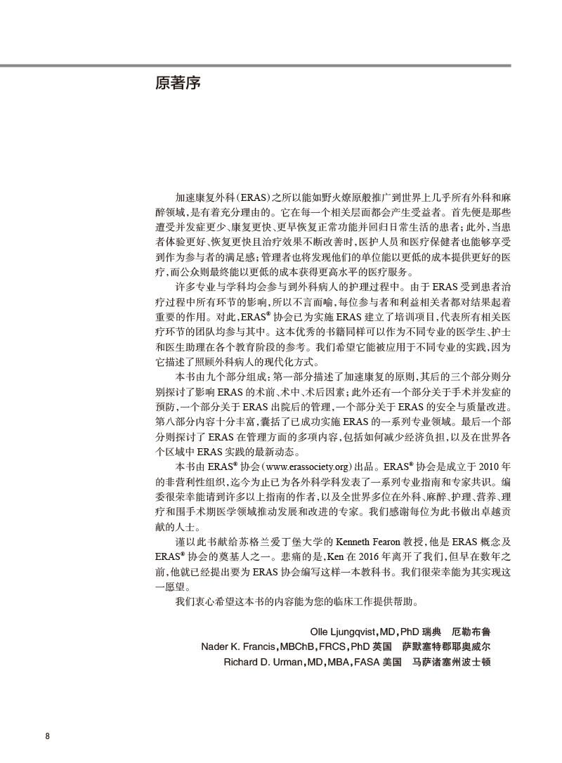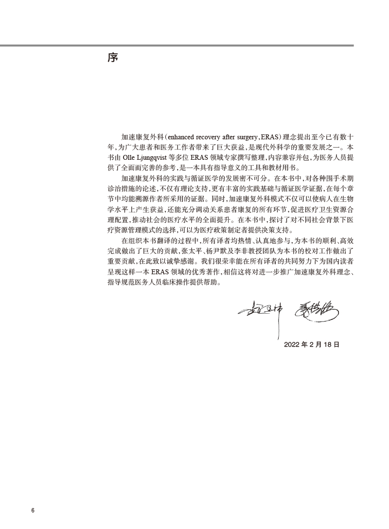 编辑推荐:加速康复外科(enhanced recovery after surgery,ERAS)是现代外科学的重要进展。ERAS理念已推广、发展数十年,为相关患者及医疗工作人员带来了巨大的获益。作为该领域的经典专著,本书由Olle Ljungqvist教授等诸多ERAS领域的专家撰写整理,内容兼容并包,广泛涉及该领域经典与前沿的内容,能够为从业者提供完善而详细的帮助。对于想要学习或实践ERAS的读者,本书是一件十分出色的工具与教材。
