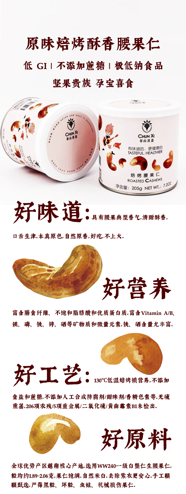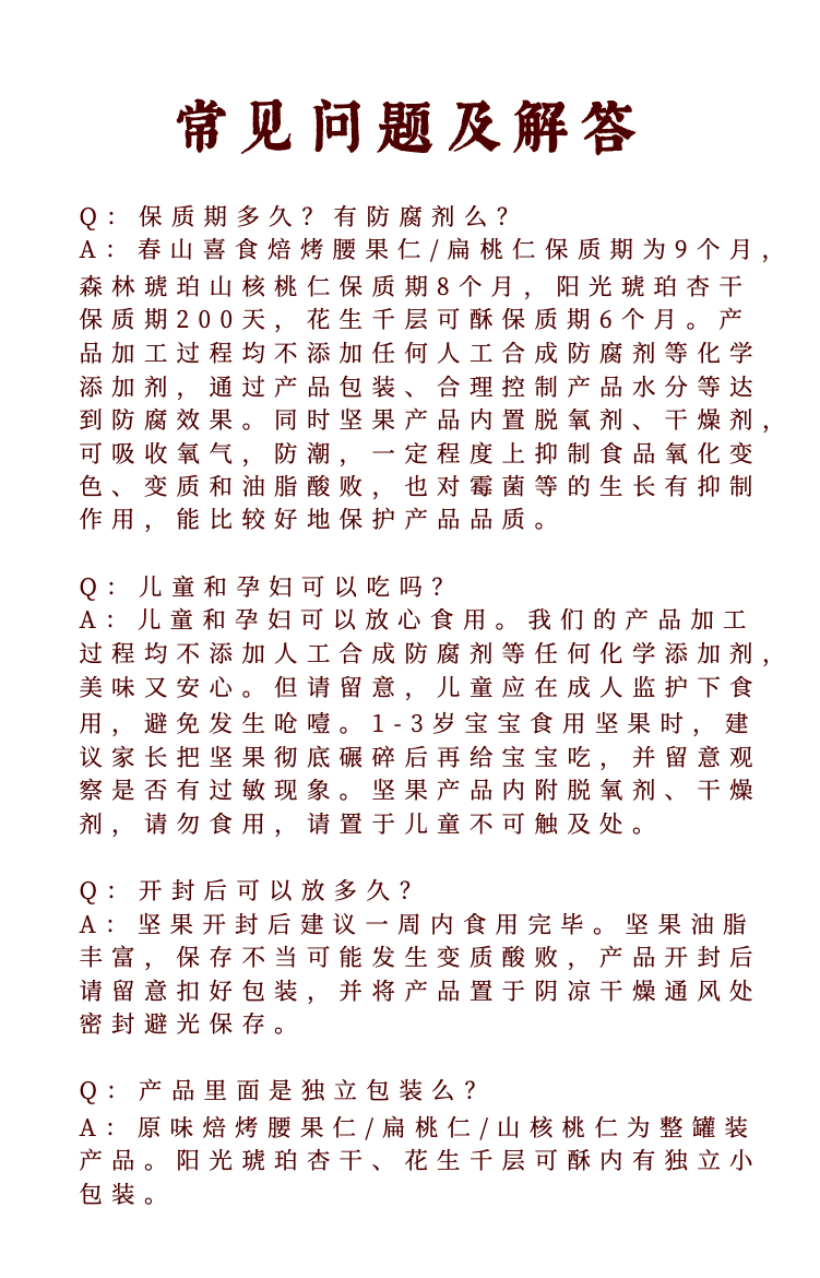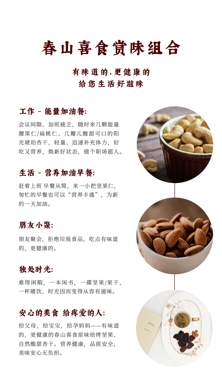 | 【商品名称】春山喜食原味焙烤腰果/扁桃仁/森林琥珀山核桃仁/花生千层可酥/阳光琥珀杏干 |